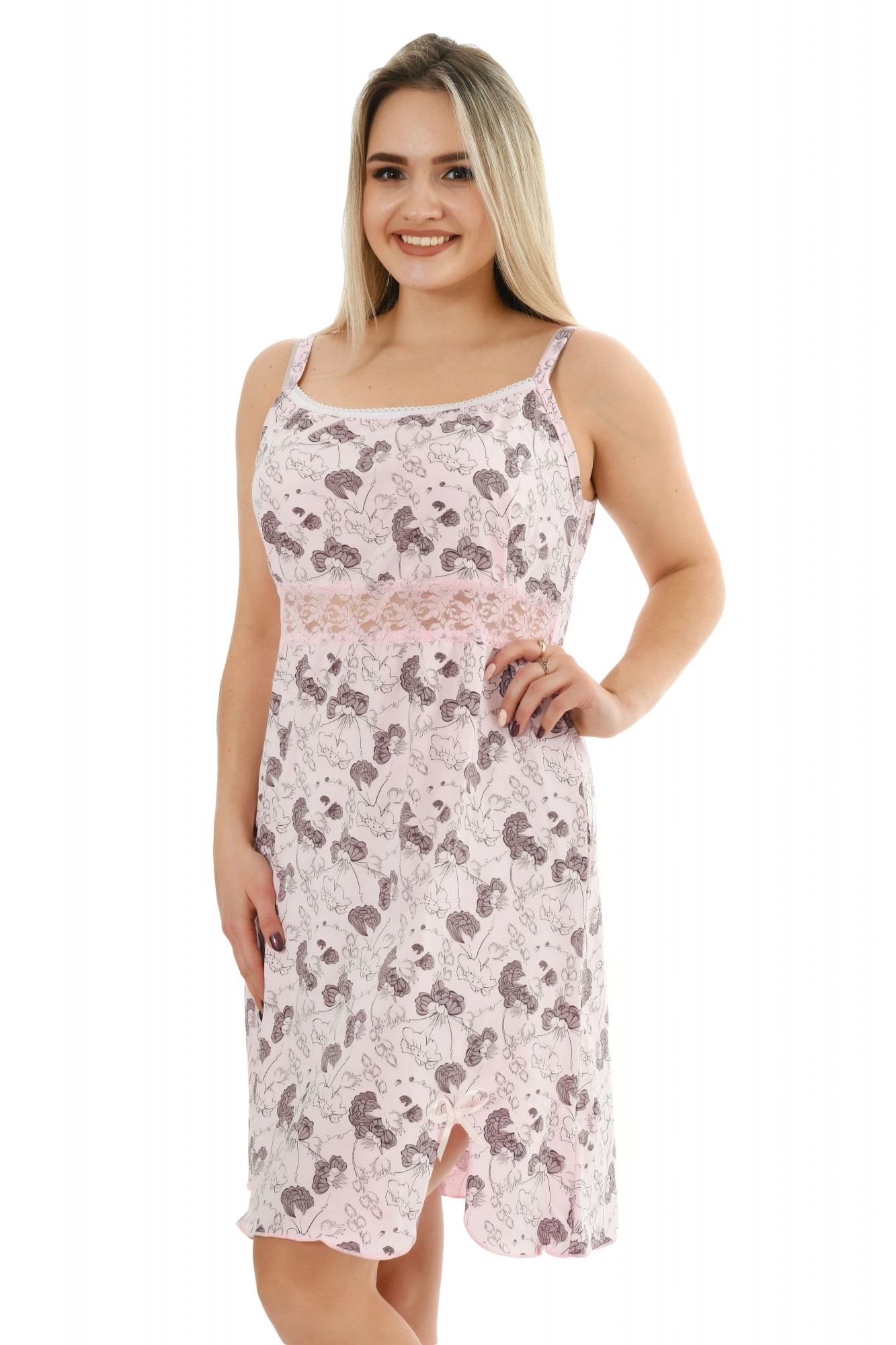 Женская ночная сорочка светлого оттенка с цветочным принтом. Кружевная вставка на уровне талии подчёркивает силуэт и добавляет изысканности, не перегружая образ.