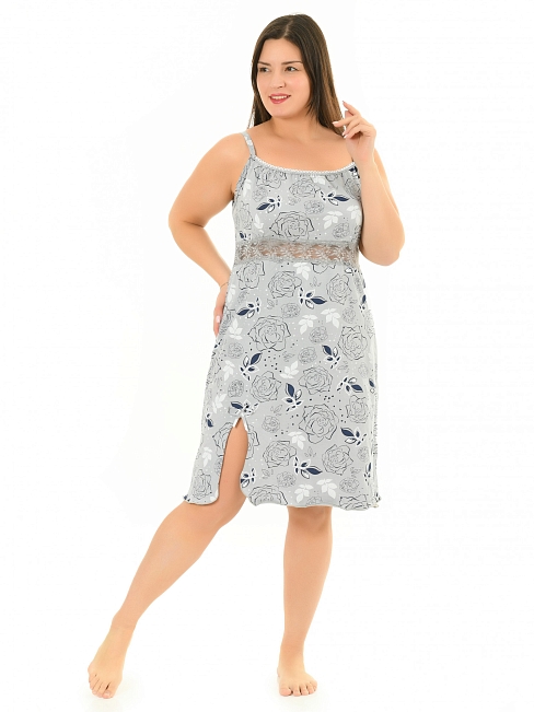 Женская ночная сорочка светлого оттенка с цветочным принтом. Кружевная вставка на уровне талии подчёркивает силуэт и добавляет изысканности, не перегружая образ.