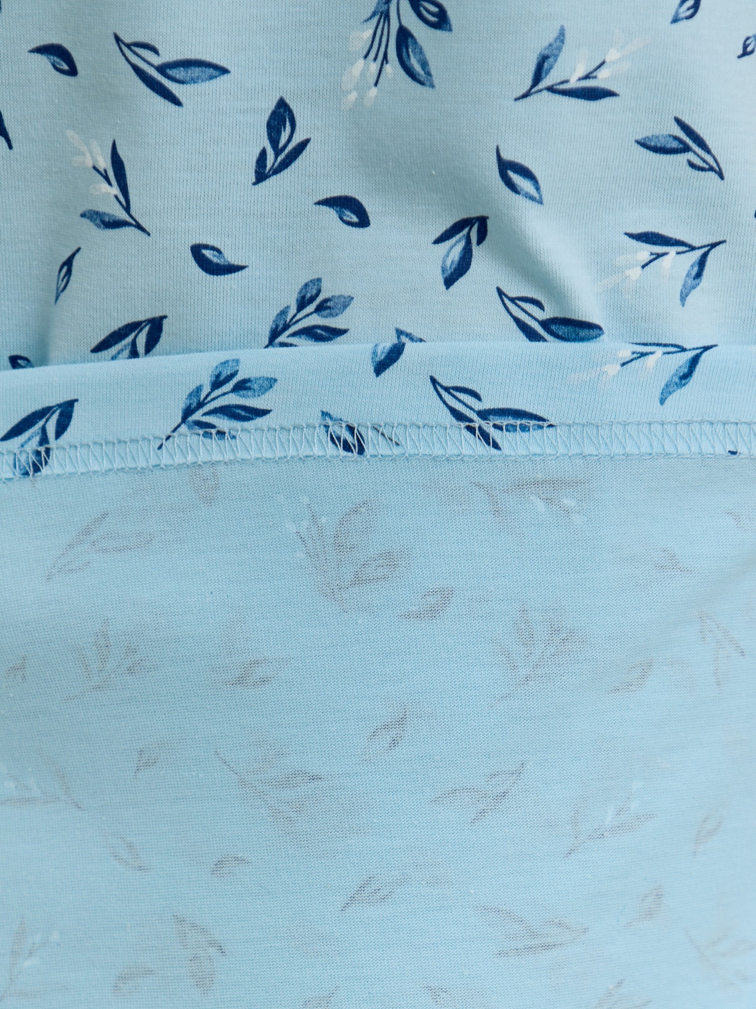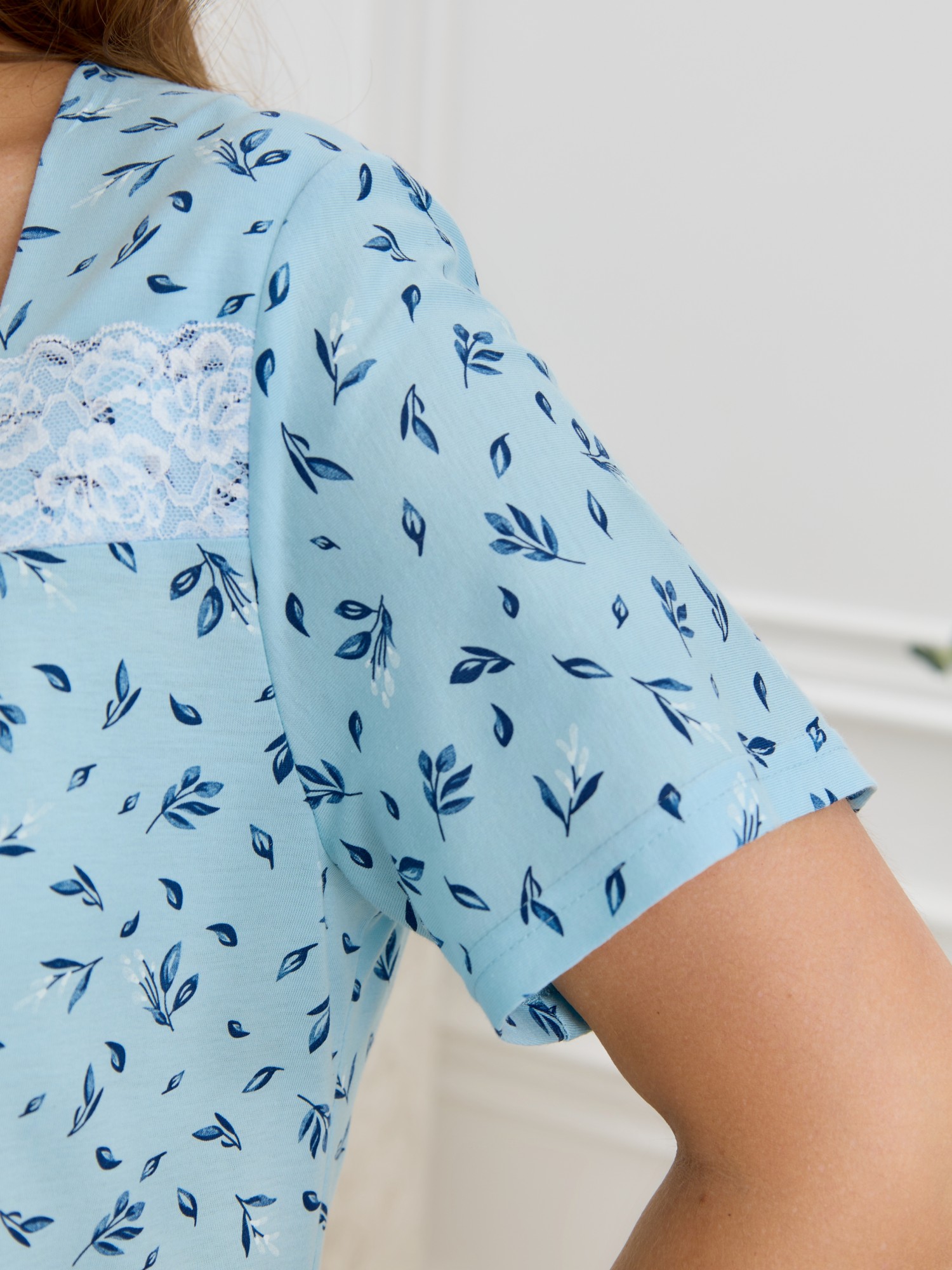 Сорочка женская из трикотажного полотна «кулирка» с набивным рисунком, свободного кроя, слегка расширенная книзу, с короткими втачными рукавами. Полочка – с двойными кокетками, кружевом в шве соединения кокеток с основной деталью и декоративной вставкой «петлей» для достижения небольшого эффекта драпировки. Основная деталь переда присборена по шву притачивания кокетки.