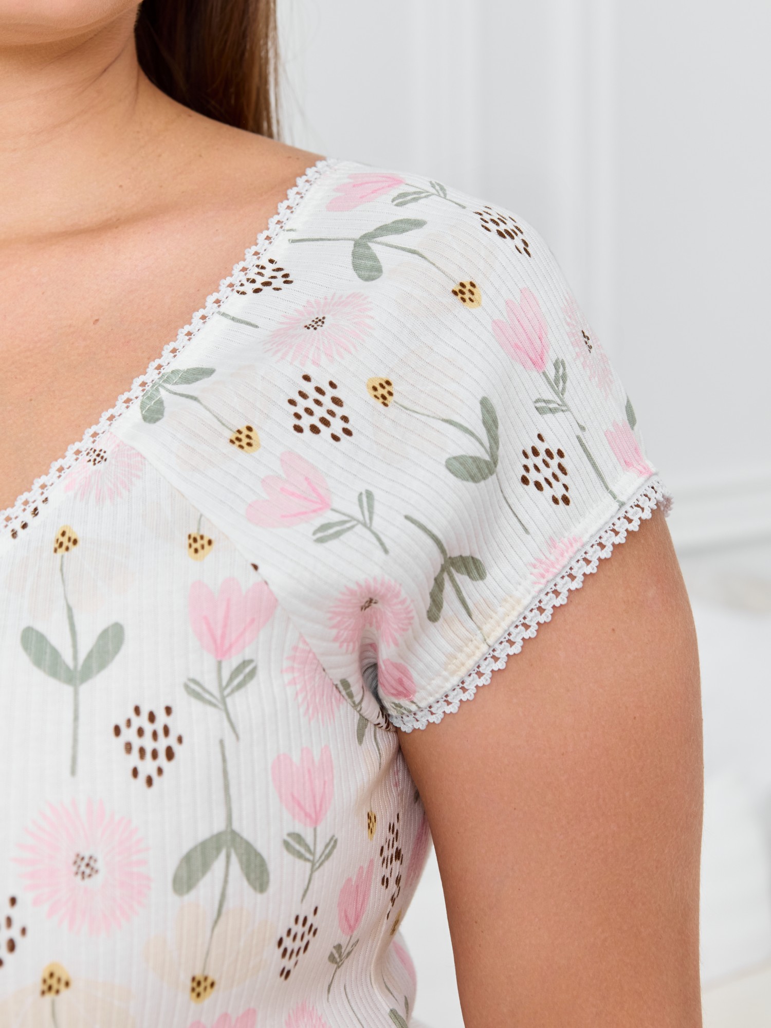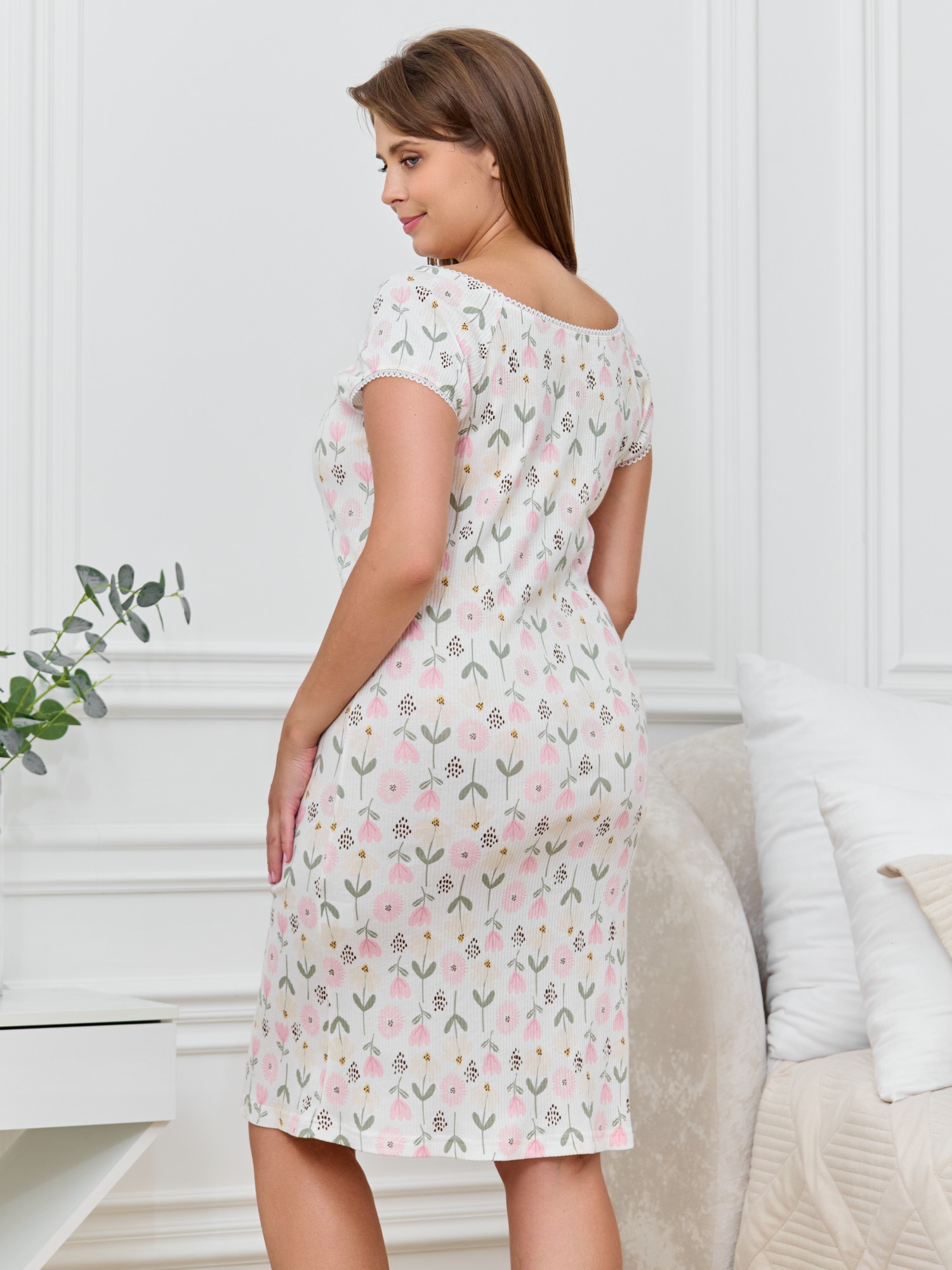 Сорочка женская из трикотажного полотна «кашкорсе» с набивным рисунком, слегка расширенная книзу, с короткими втачными рукавами, углубленной формой горловины. Низ изделия и нижние срезы рукавов обработаны эластичной тесьмой с фасонным краем.