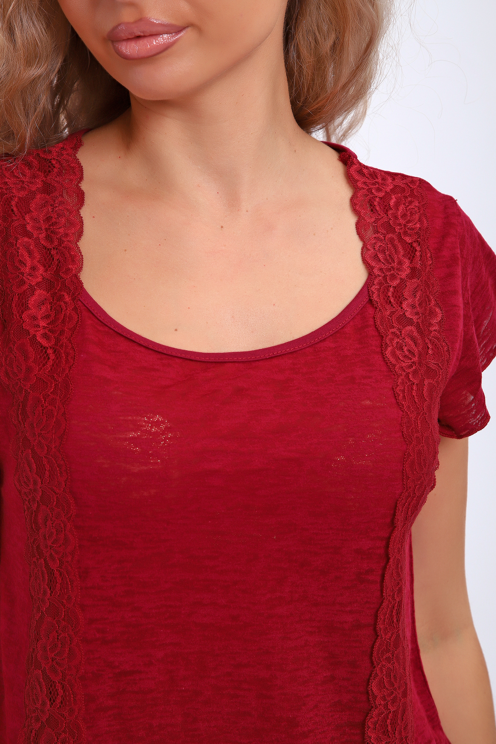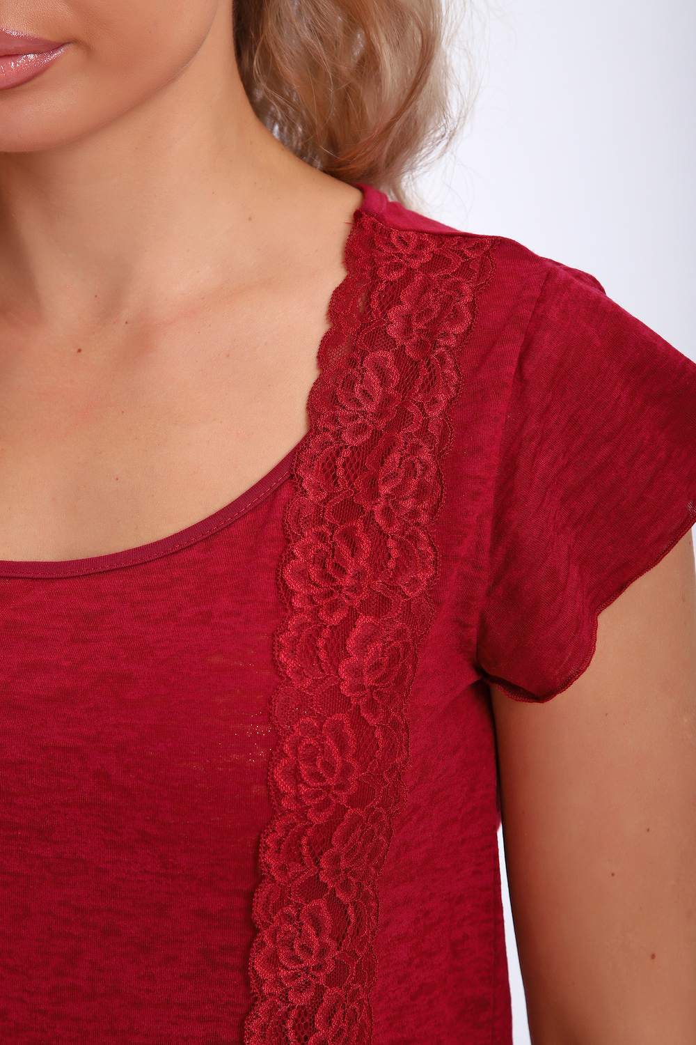 Пижама состоит из топа и брюк, оптимальной ширины. Выполнена из однотонного трикотажа с кружевом, что придает ей особый шарм и изысканность. Размеры варьируются от 42 до 56, что позволяет каждой женщине подобрать для себя идеальный вариант, подчеркнуть ее индивидуальность и сделать образ неповторимым. Топ свободного силуэта с короткими рукавами-крылышками декорирован вставкой полупрозрачного кружева в тон изделия. Низ брюк также обрамляет изящное кружево в тон.