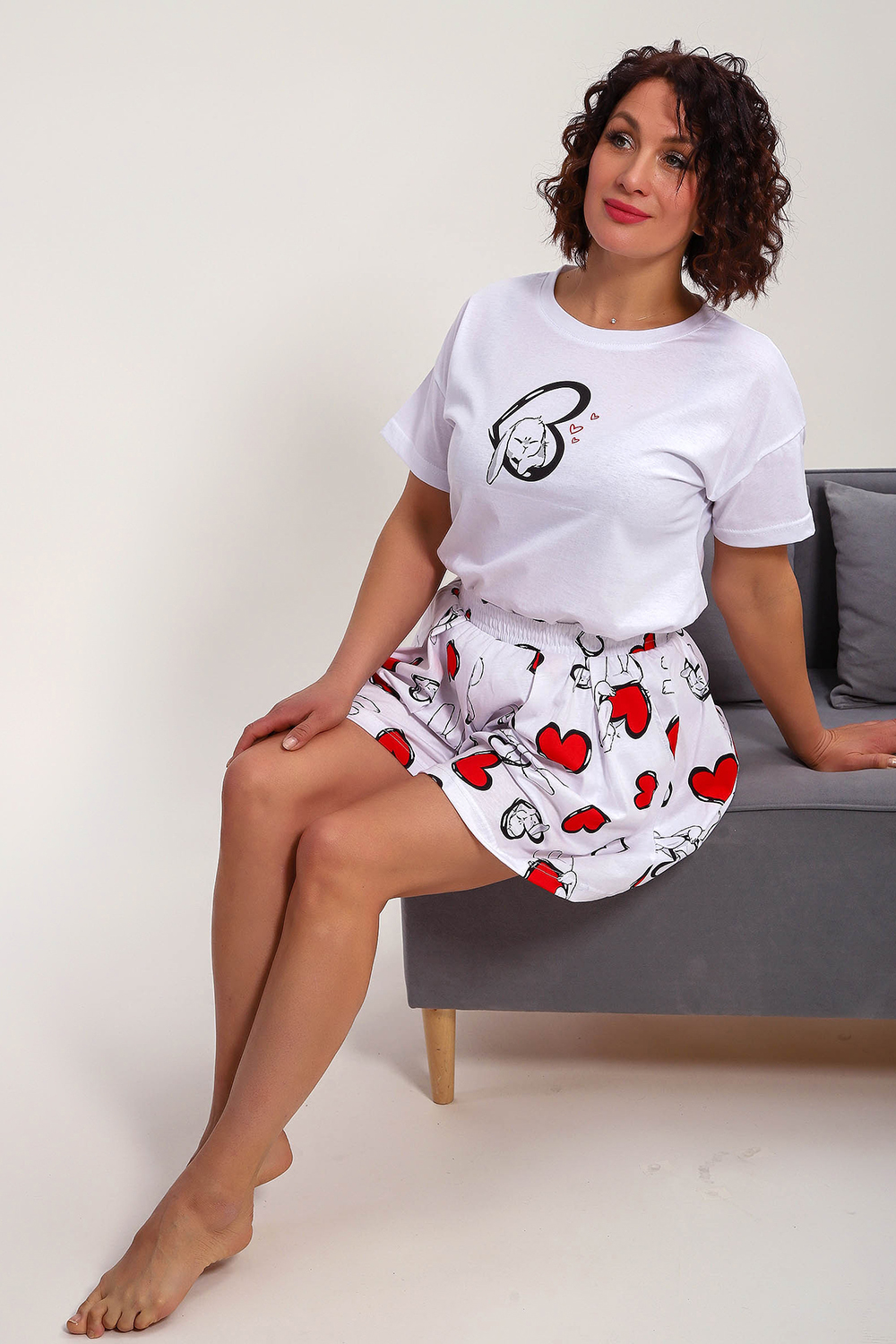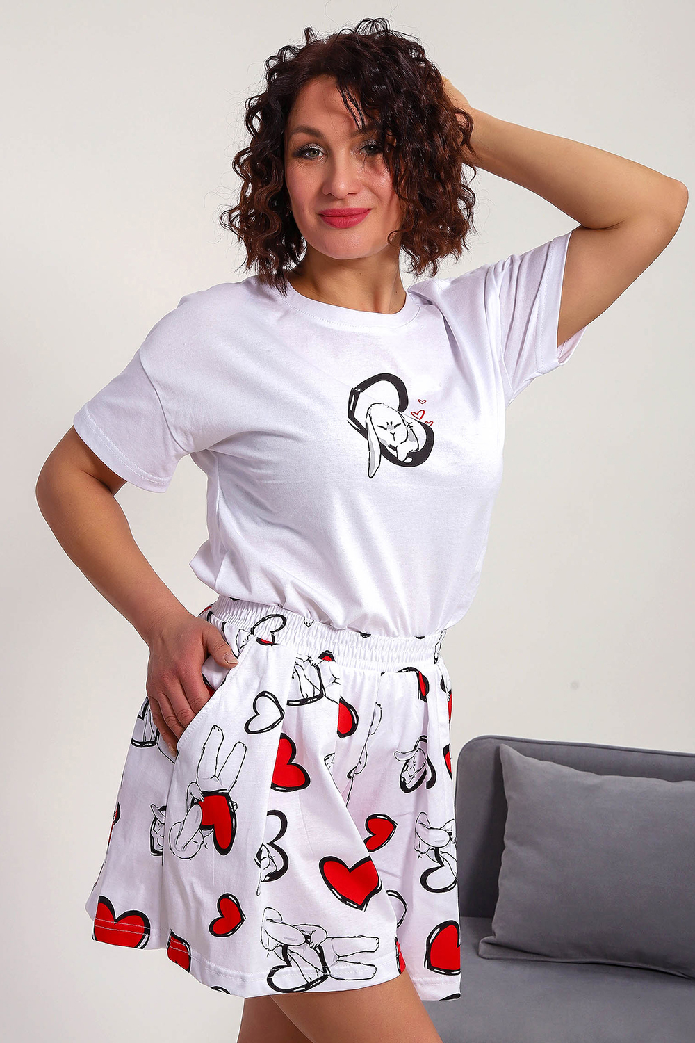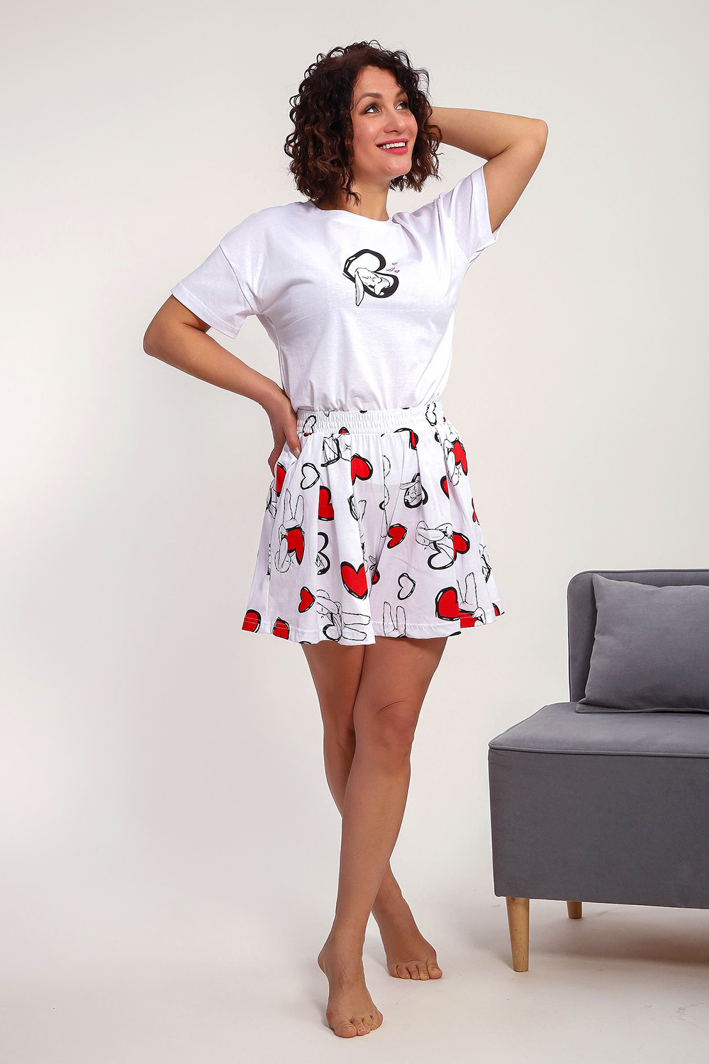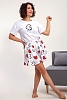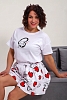 Пижама женская с шортами-юбка и футболкой со спущенным рукавом. Данная модель выполнена из трикотажного полотна кулирка ( хлопок 100%). На футболке присутствует принт. Шорты с поясом и карманами. Складки на шортах придают воздушность и комфорт, свобода в движениях. Пижама порадует вас.