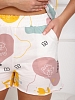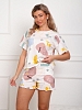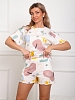 Пижама "Этаин" из набивного трикотажного полотна "кулирка" состоит из футболки и шорт. Футболка свободного покроя со спущенной линией плеча, короткими втачными рукавами, горловиной овальной формы, обработанной втачной планкой. Нижние срезы рукавов и низ изделия обработаны узкой обметочной строчкой контрастного цвета, создающей красивый волнистый край. Шорты средней длины на притачном поясе с эластичной лентой и карманами в боковых швах. Нижние срезы шорт обработаны узкой обметочной строчкой контрастного цвета, создающей красивый волнистый край.