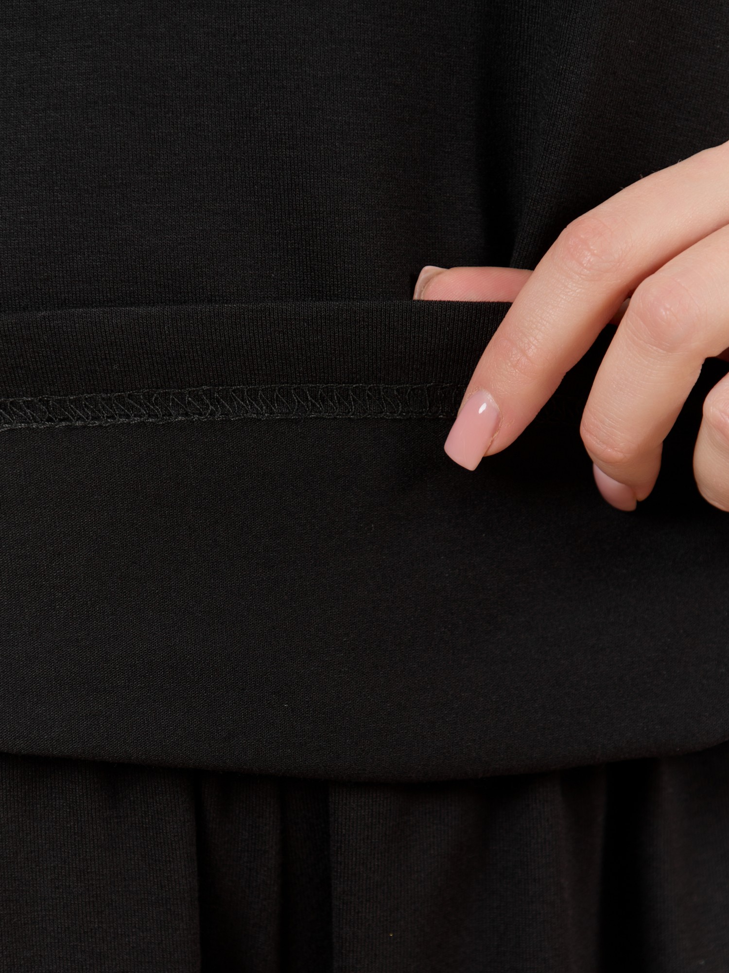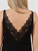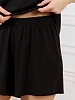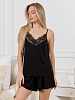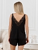 Пижама молодежная гладкокрашеного трикотажного вискозного полотна с отделкой кружевом, состоящая из топа и шорт. Топ - на узких бретелях, слегка расширенный книзу. V-образная горловина полочки и спинки отделана кружевными вставками треугольной формы. Проймы окантованы основным материалом. Шорты – свободные, средней длины, с эластичной тесьмой по талии.