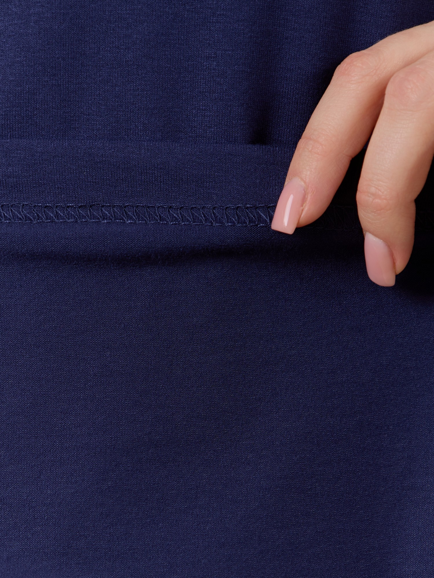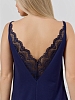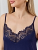 Пижама молодежная гладкокрашеного трикотажного вискозного полотна с отделкой кружевом, состоящая из топа и шорт. Топ - на узких бретелях, слегка расширенный книзу. V-образная горловина полочки и спинки отделана кружевными вставками треугольной формы. Проймы окантованы основным материалом. Шорты – свободные, средней длины, с эластичной тесьмой по талии.