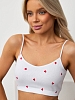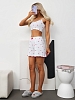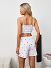 Пижама молодежная из трикотажного полотна «кашкорсе» с набивным рисунком состоящая из майки-топа и шорт. Майка-топ – на узких бретелях, с V-образным вырезом горловины, низ изделия с эластичной тесьмой, которая дает прилегание по фигуре.Шорты - укороченные, расширенные книзу, с эластичной тесьмой по талии и атласным бантиком в центре. Нижние срезы шорт обработаны узкой обметочной строчкой контрастного цвета, создающей красивый волнистый край.