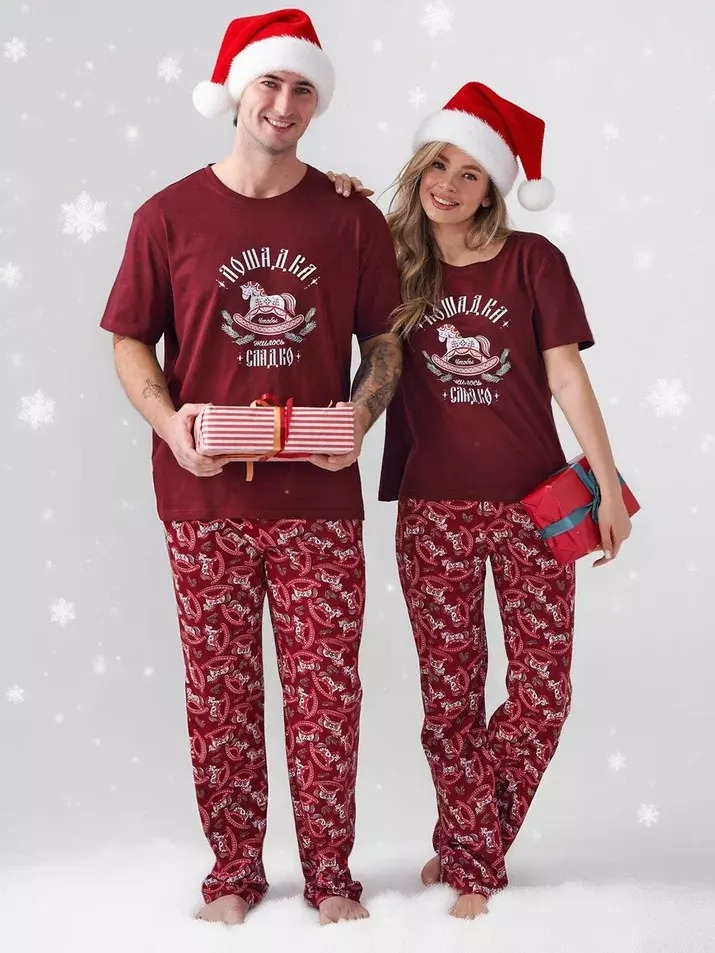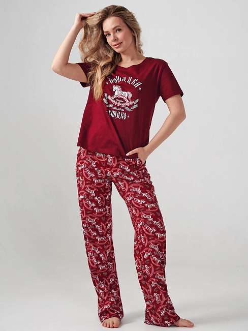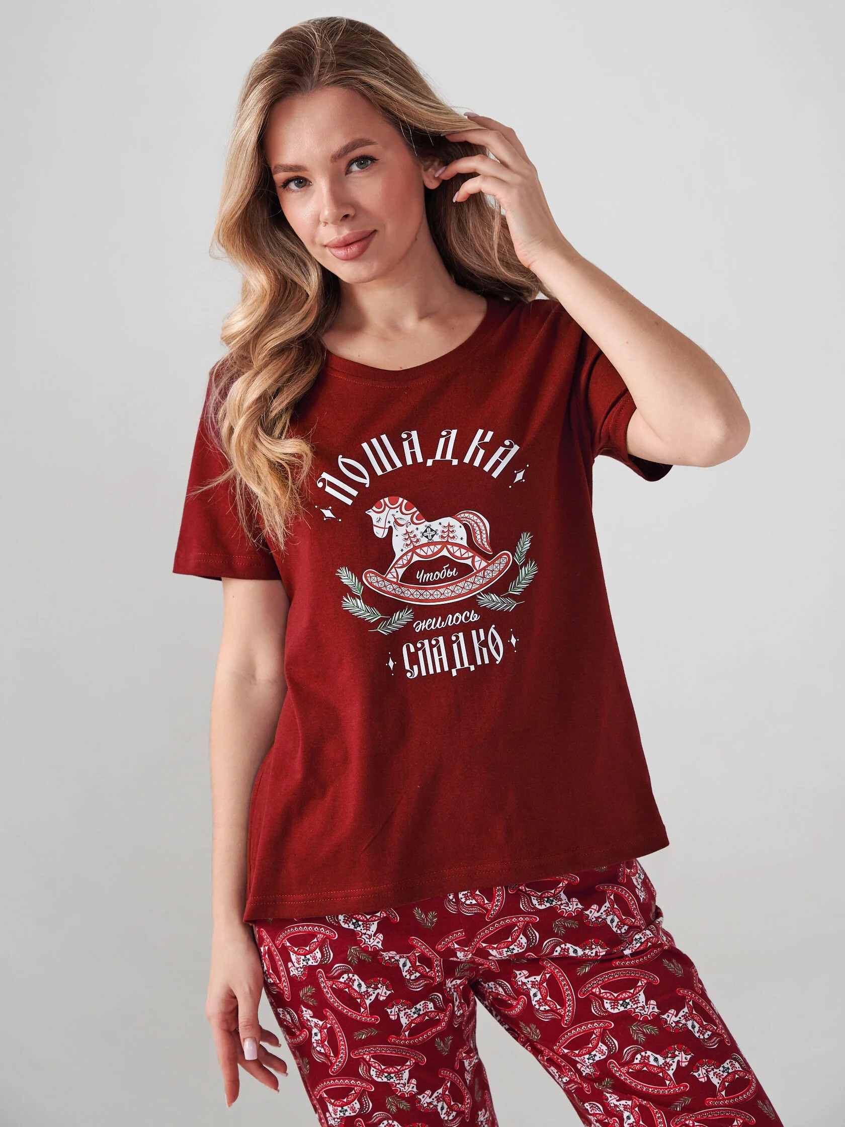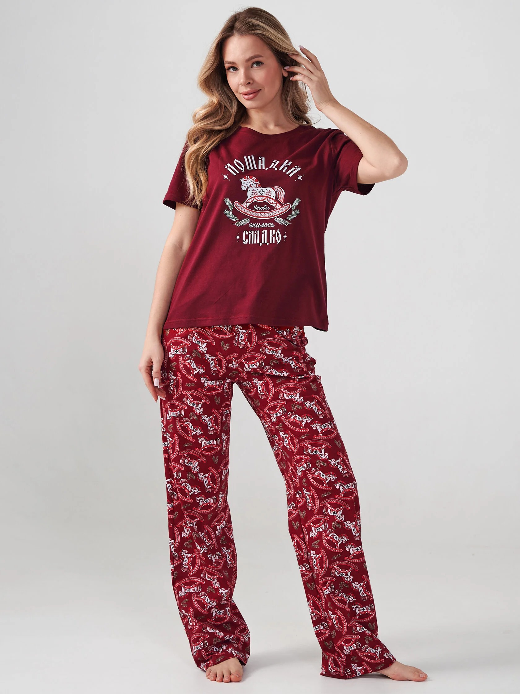 Женская пижама "Лошадка" 2416-К / Бордовый с футболкой и свободными брюками, отшивается из хлопкового трикотажного полотна. Веселый яркий принт создаст настроение.