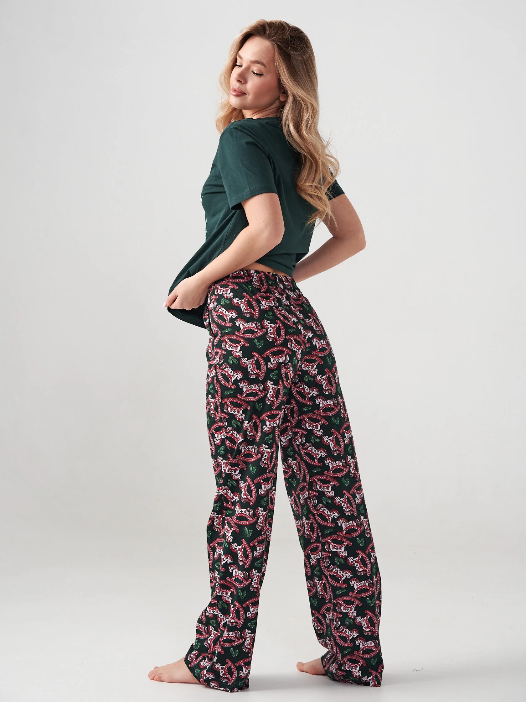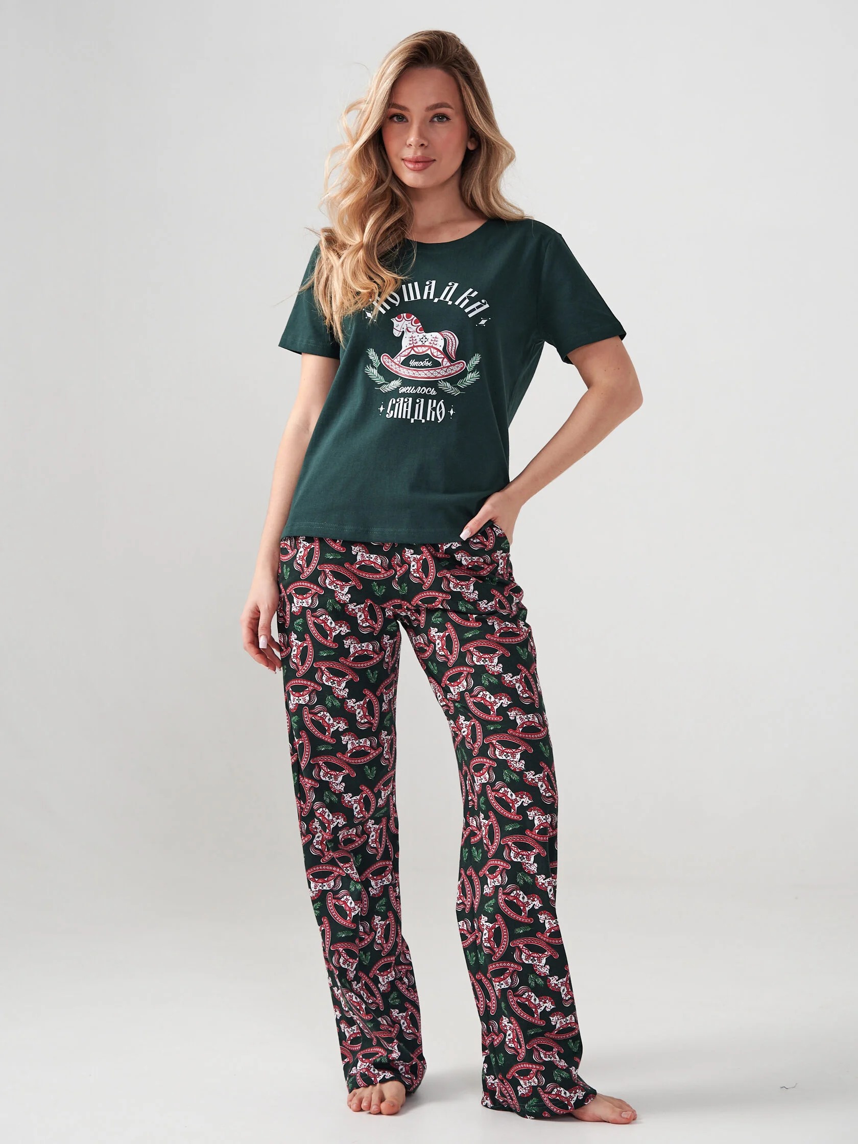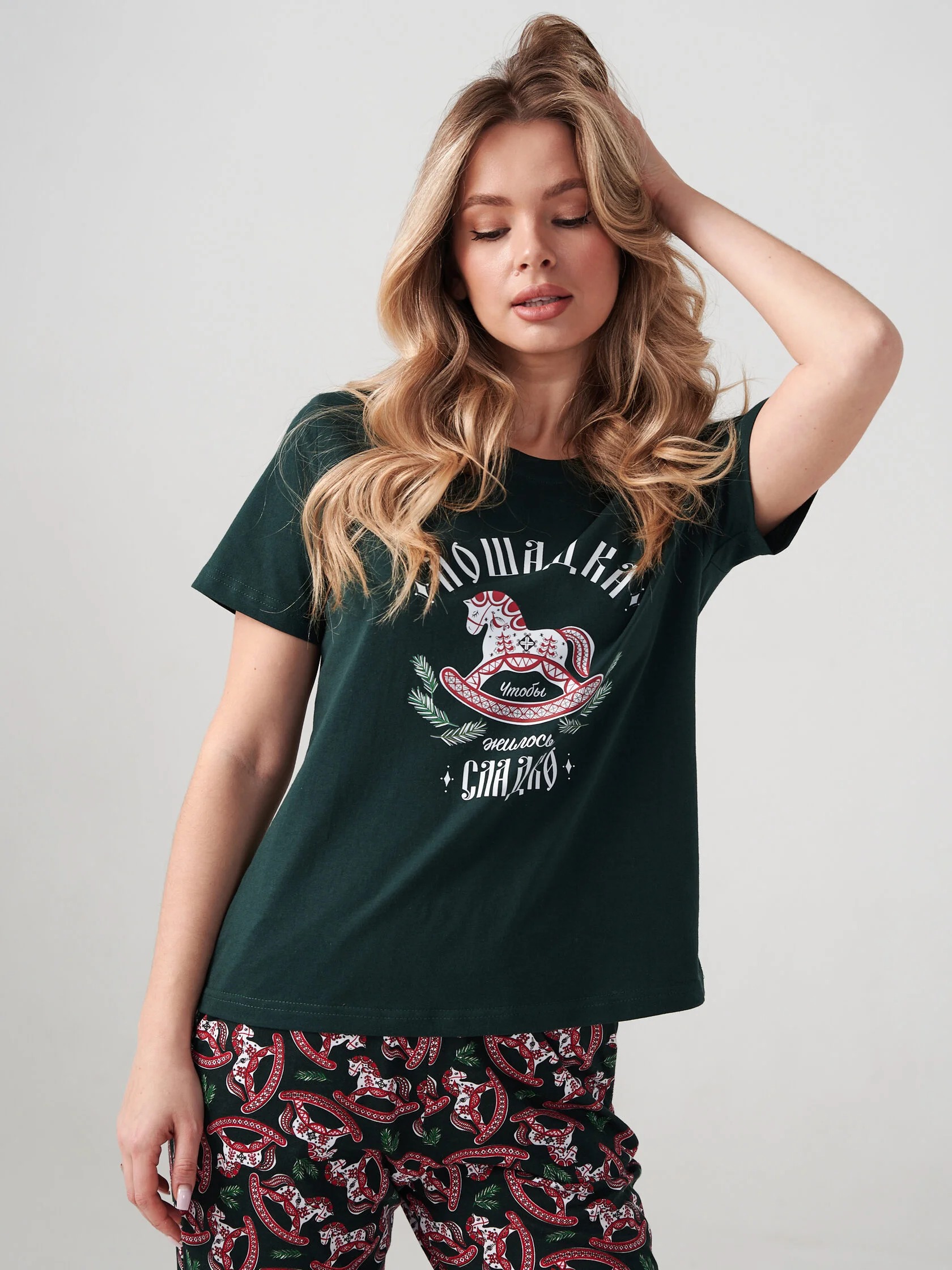 Женская пижама "Лошадка" 2416-К / Зеленый с футболкой и свободными брюками, отшивается из хлопкового трикотажного полотна. Веселый яркий принт создаст настроение.