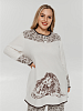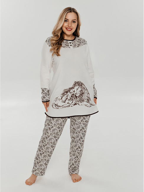 Представляем Вам нашу пижаму ЛУРДЕС, изготовленную из двух видов тканей, прекрасно сочетающихся между собой. Комплект изготовлен из хлопковой ткани футер с начесом, состоит из кофты с длинным рукавом и брюк. Горловина, низ кофты и рукавов обработаны окантовкой. Кокетка на полочке и манжеты выполнены из набивной ткани. На полочке оригинальный принт в виде затейливого узора. Модель согреет Вас теплом, позволит сбросить накопленное напряжение за целый день и хорошо уснуть.