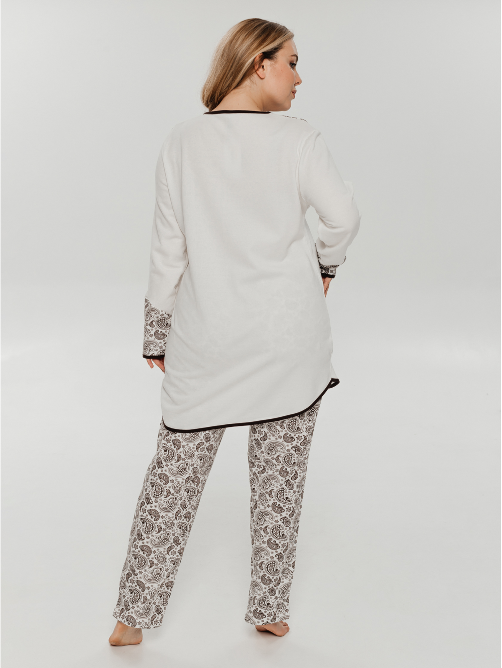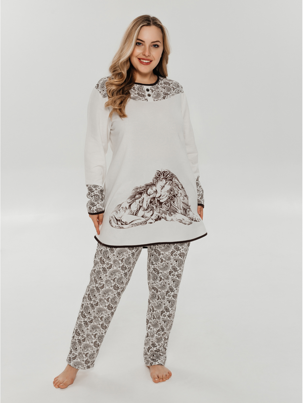 Представляем Вам нашу пижаму ЛУРДЕС, изготовленную из двух видов тканей, прекрасно сочетающихся между собой. Комплект изготовлен из хлопковой ткани футер с начесом, состоит из кофты с длинным рукавом и брюк. Горловина, низ кофты и рукавов обработаны окантовкой. Кокетка на полочке и манжеты выполнены из набивной ткани. На полочке оригинальный принт в виде затейливого узора. Модель согреет Вас теплом, позволит сбросить накопленное напряжение за целый день и хорошо уснуть.