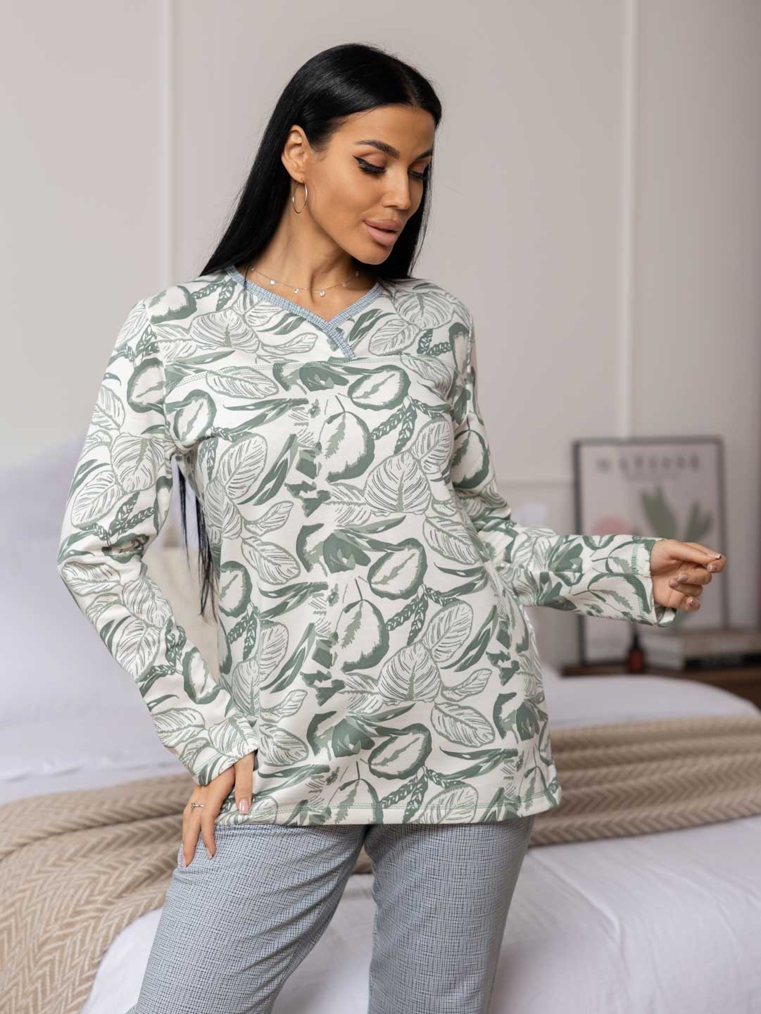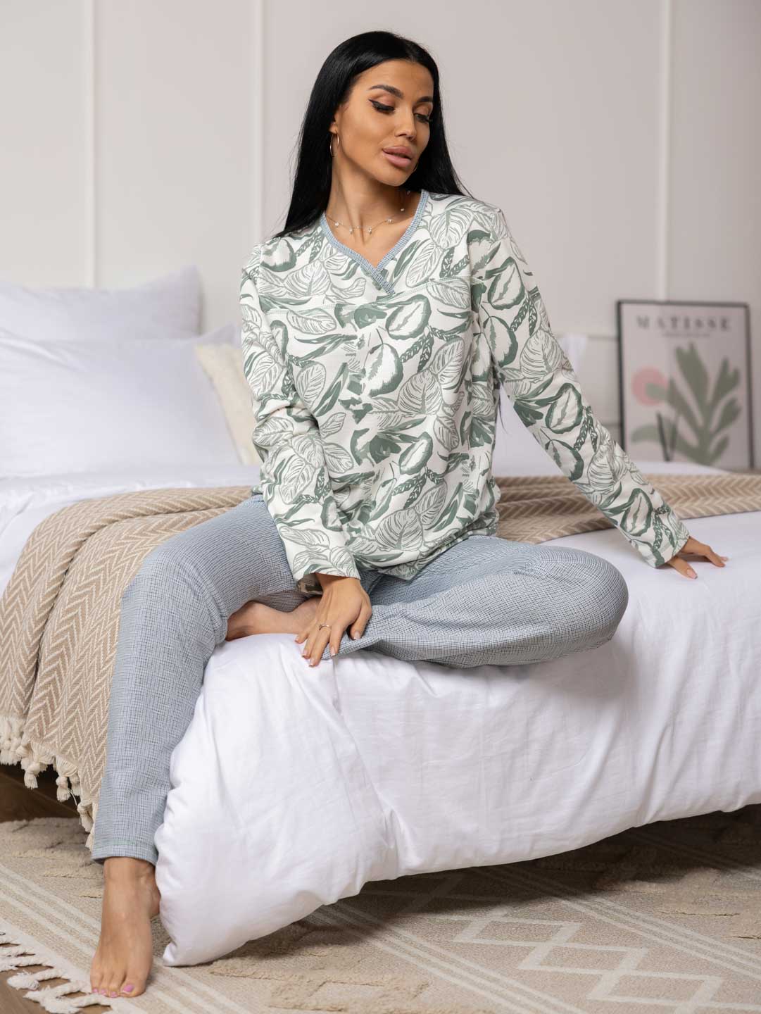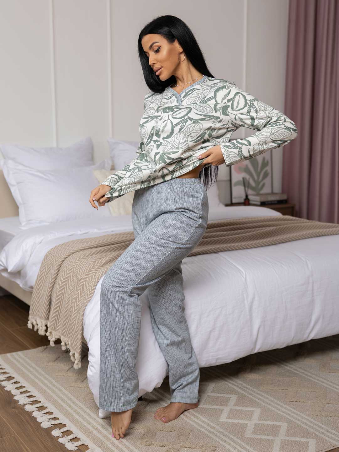 Женская пижама с брюками и лонгом, выполнена из тканей компаньонов, изнанка приятная к телу, с небольшим начесом. Лонг с кокеткой на запах и фактурной отстрочкой по горловине, рукаву и низу. Брюки с мягкой резинкой, комфортной для сна и отдыха.