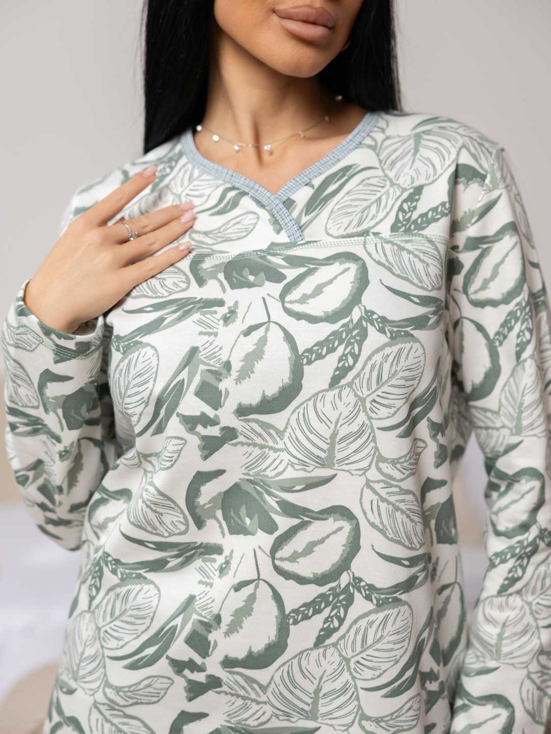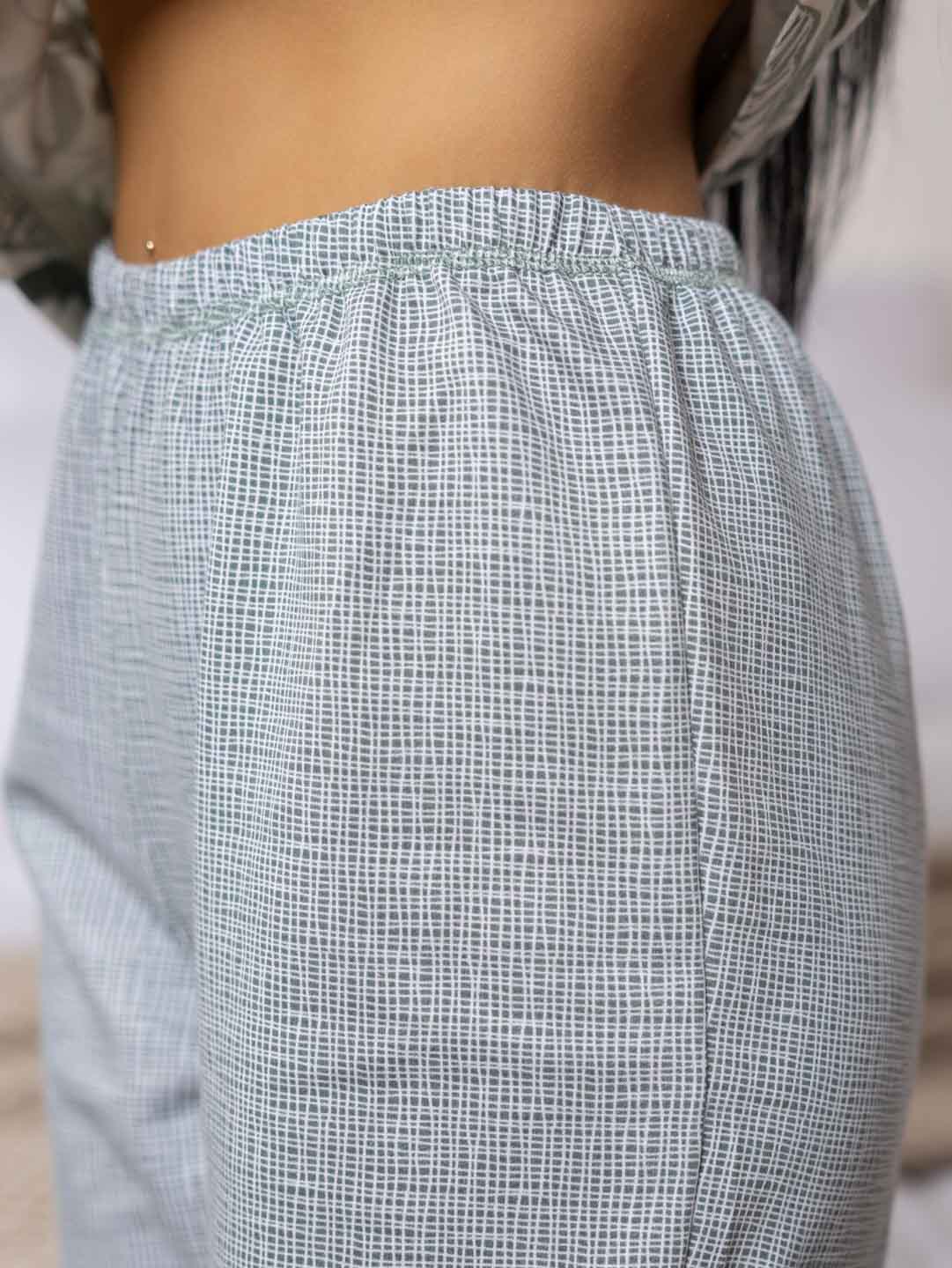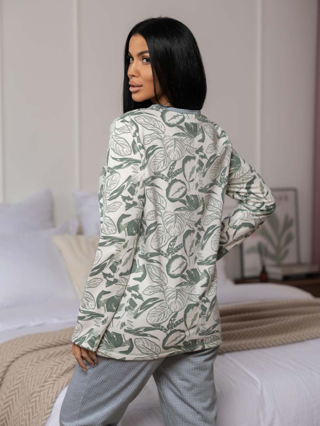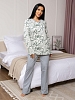 Женская пижама с брюками и лонгом, выполнена из тканей компаньонов, изнанка приятная к телу, с небольшим начесом. Лонг с кокеткой на запах и фактурной отстрочкой по горловине, рукаву и низу. Брюки с мягкой резинкой, комфортной для сна и отдыха.