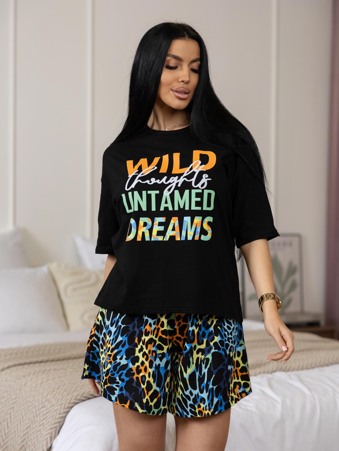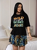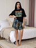 Стильная молодежная пижама с футболкой и юбкой-шортами. Футболка с О-образной горловиной, спущенной линией плеча и печатью спереди. Юбка-шорты имеют трапециевидный крой, выполнены без карманов, на резинке 2см. Костюм сшит из турецкой кулирки, которая отличается мягкостью.