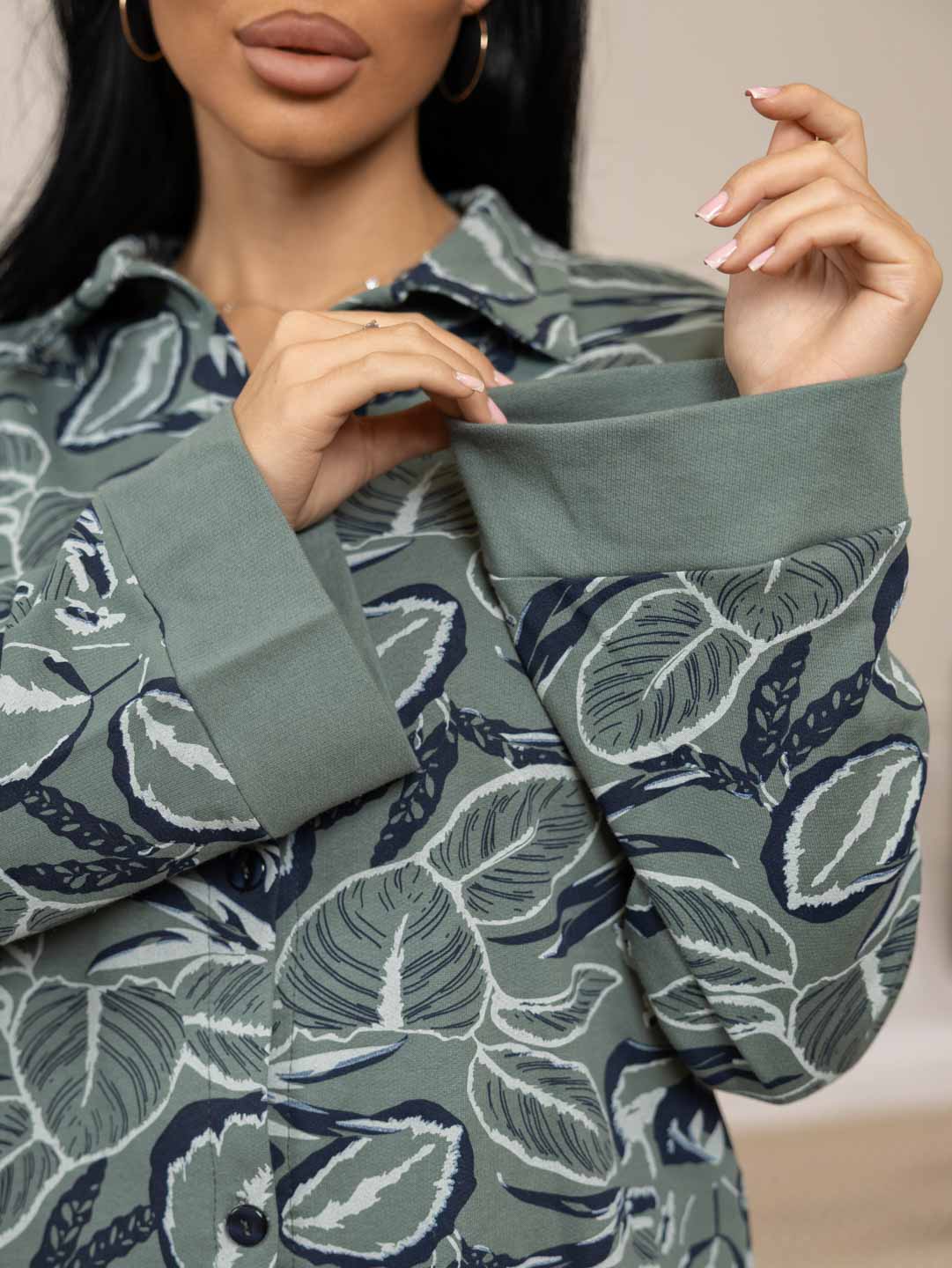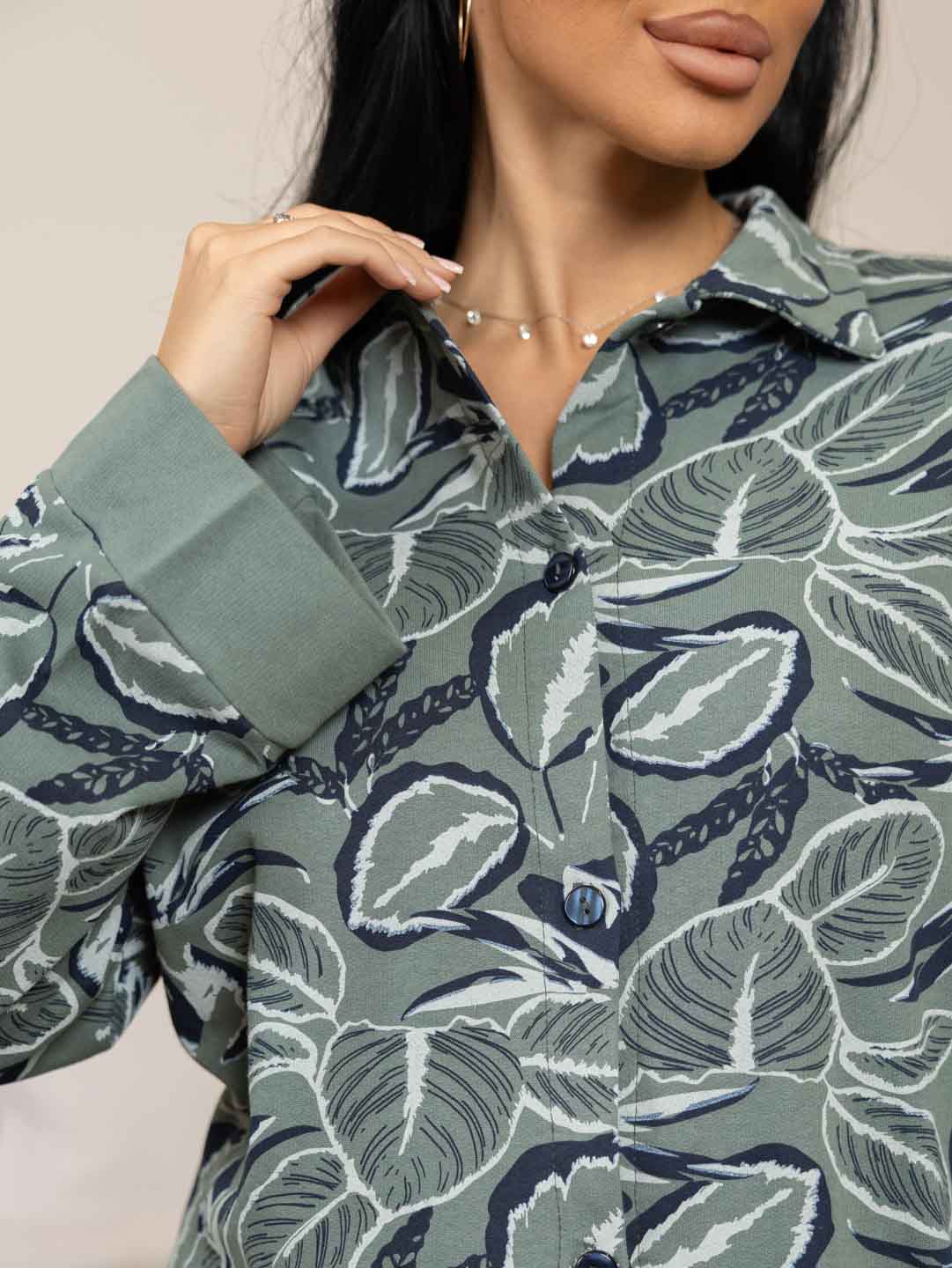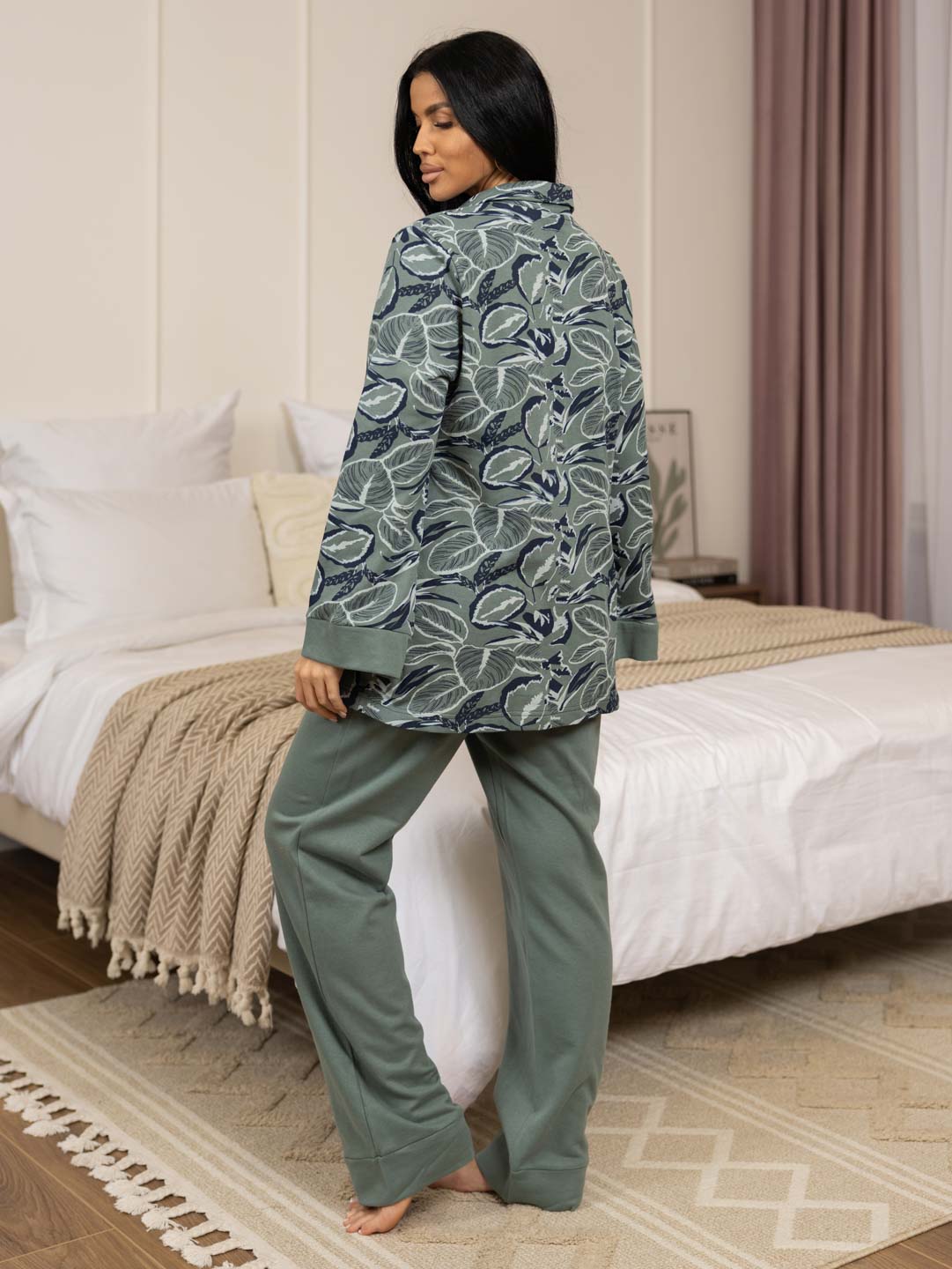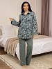 Женская пижама из футера с начесом, верх рубашка с отложным воротником на пуговицах, рукав длинный с манжетой в цвет брюк. Брюки прямые полной длины на резинке без карманов с манжетами по низу, при необходимости можно отогнуть манжеты и сделать брюки длиной 7/8.