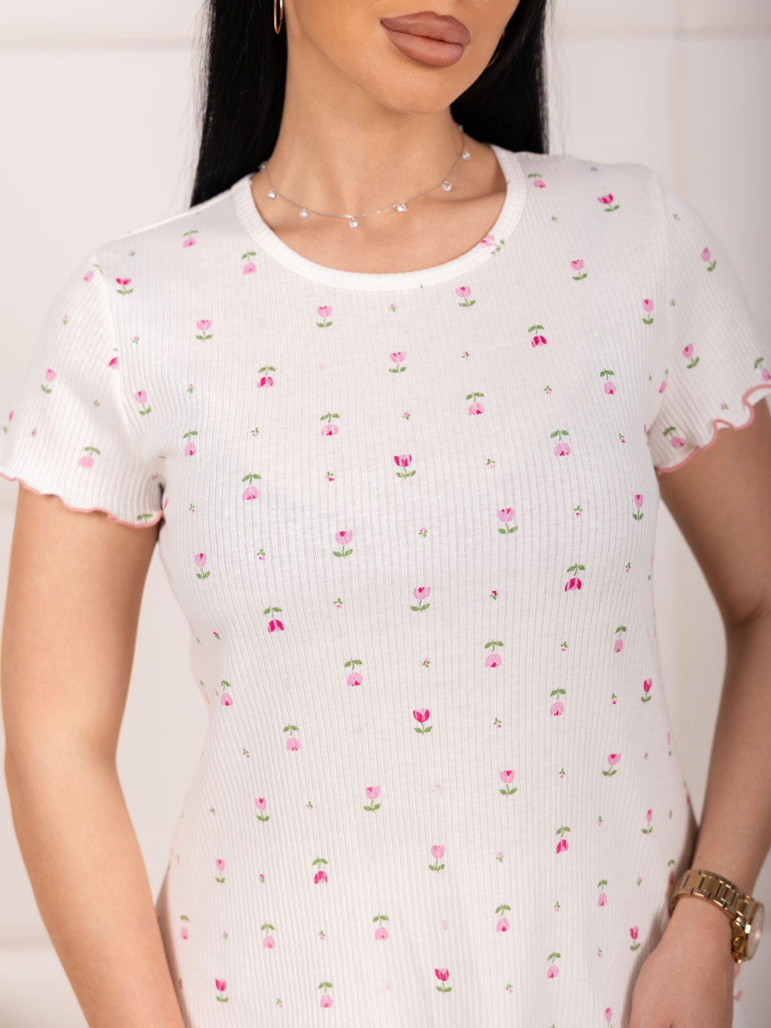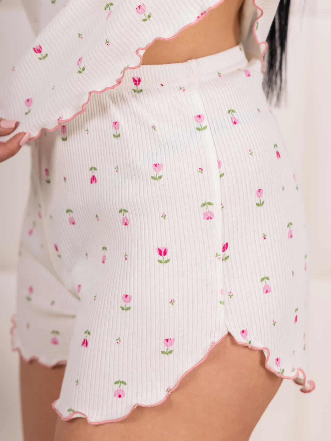 Домашняя пижама из приятного, мягкого материала в рубчик. Полотно гипоаллергенное и воздухопроницаемое из 100% хлопка. Пижама состоит из полуприлегающей футболки и коротких шорт с высокой посадкой. Горловина обработана окантовкой, а края изделия (рукава, низ футболки и шорт) - роликовым швом.