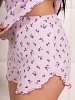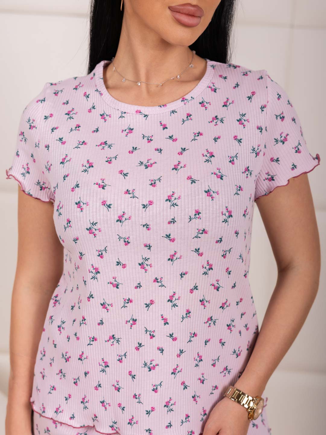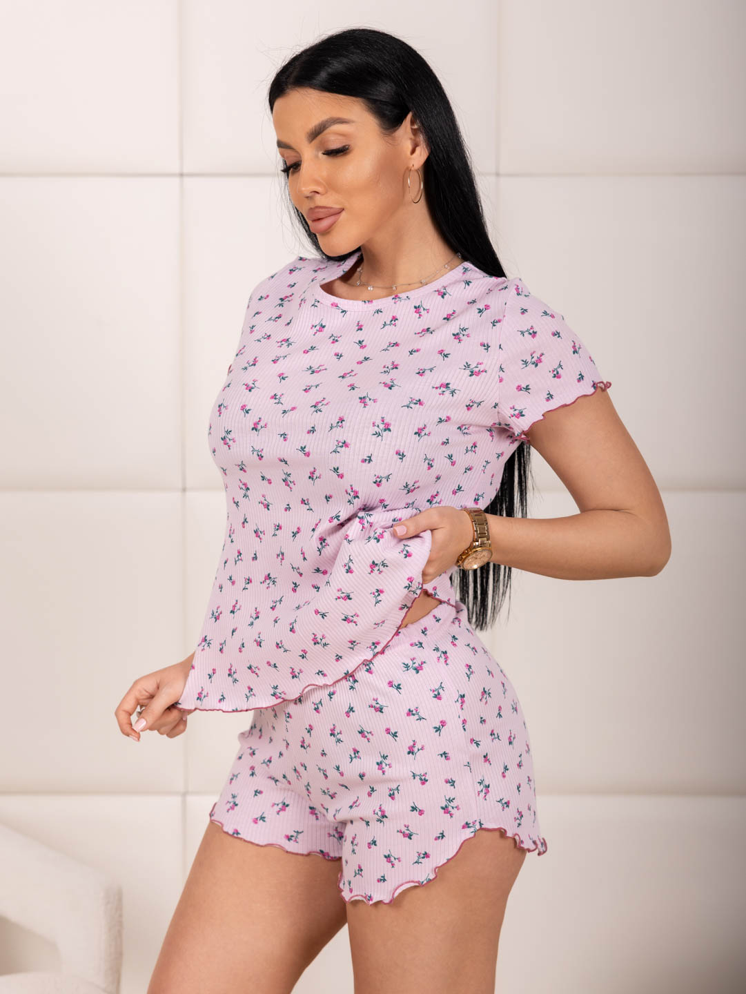 Домашняя пижама из приятного, мягкого материала в рубчик. Полотно гипоаллергенное и воздухопроницаемое из 100% хлопка. Пижама состоит из полуприлегающей футболки и коротких шорт с высокой посадкой. Горловина обработана окантовкой, а края изделия (рукава, низ футболки и шорт) - роликовым швом.