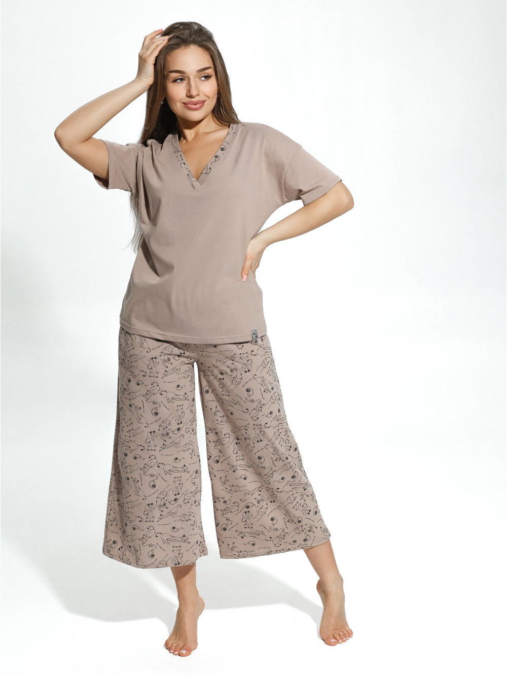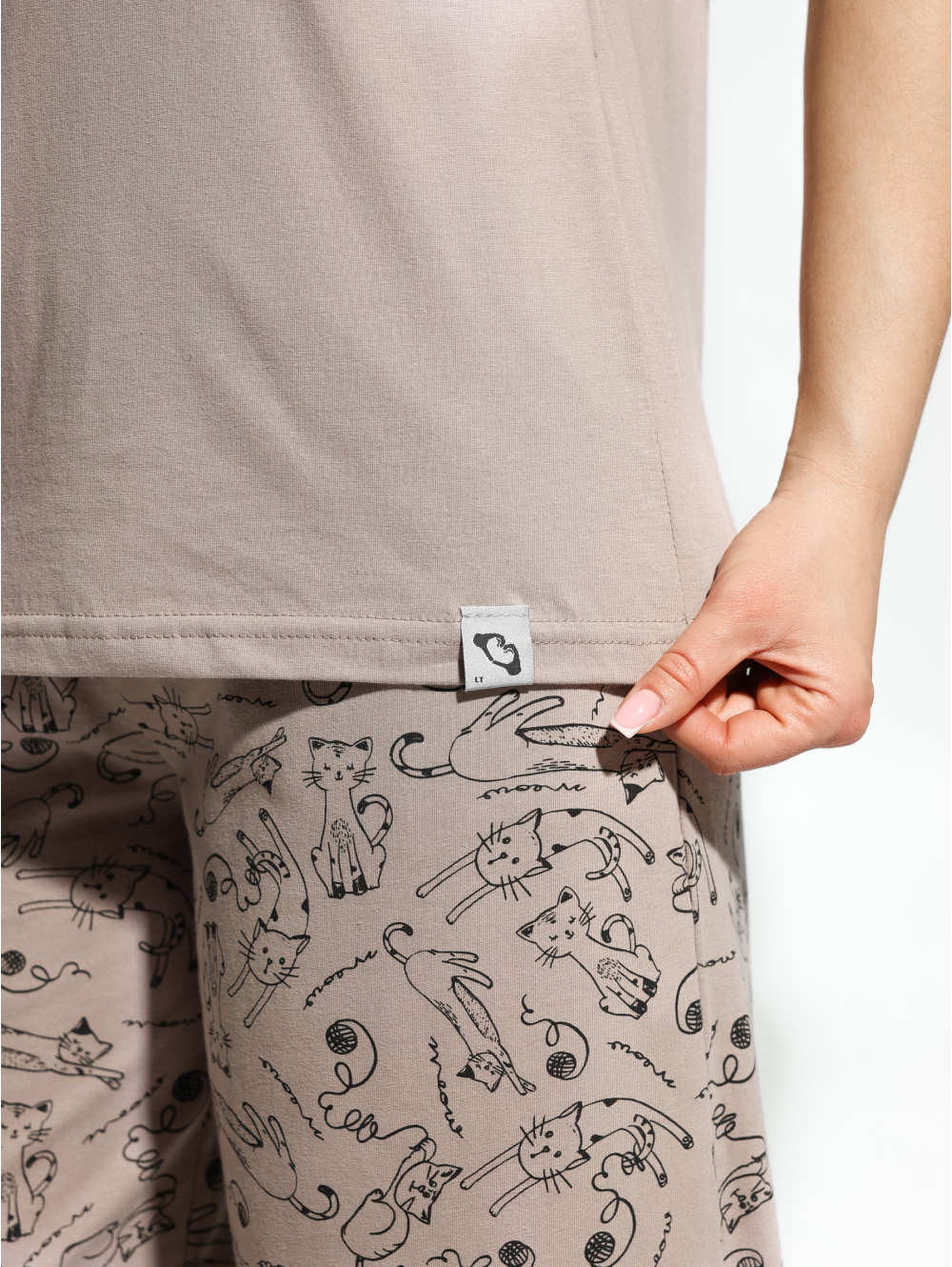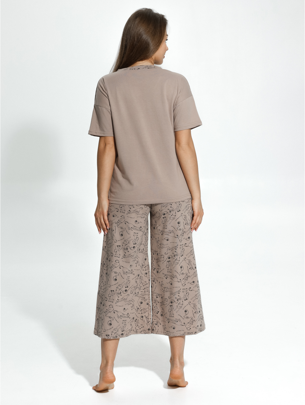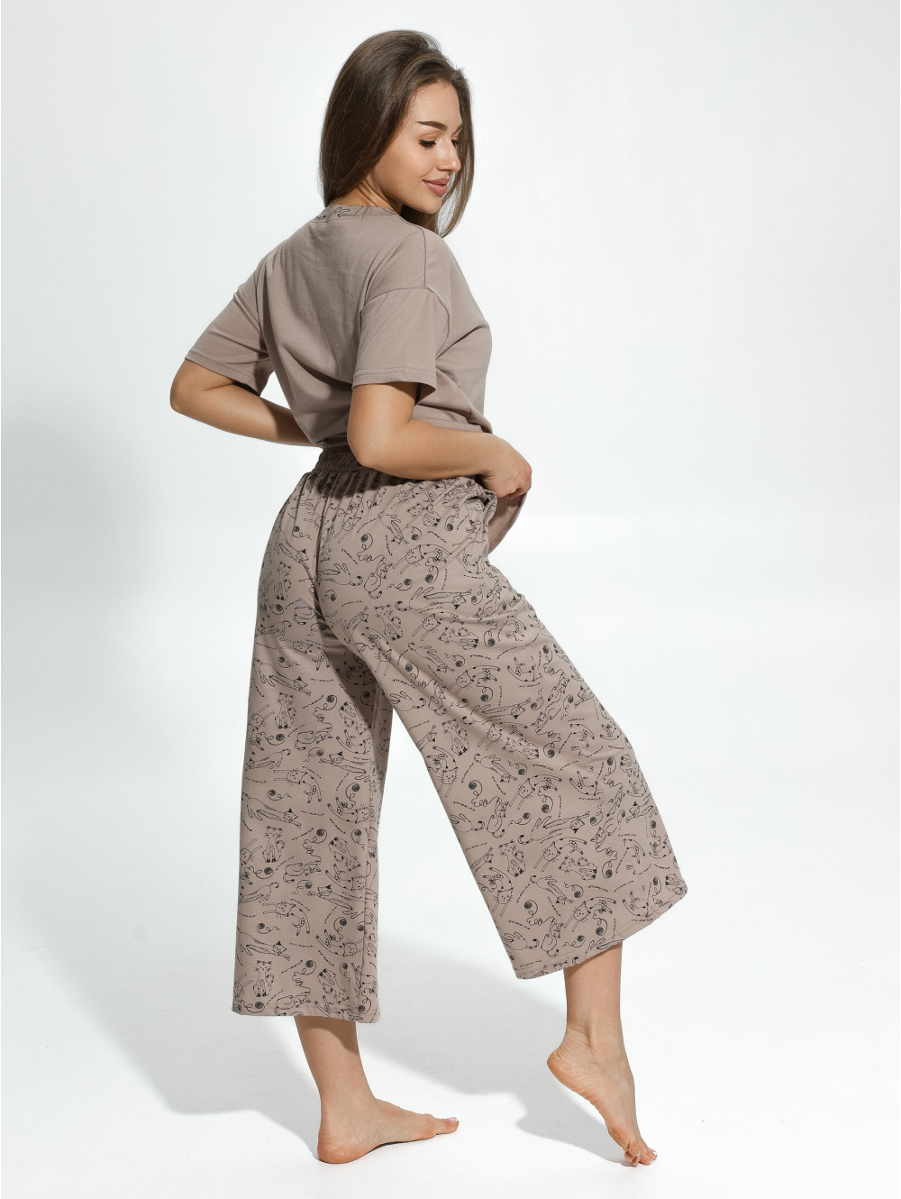 Модная пижама - это комфортная одежда для отдыха, которую по достоинству оценят. Пижама Мурка состоит из широких штанов кюлотов с высокой посадкой и футболки с коротким рукавом. Удобные брюки на резинке на талии не стесняют движения.