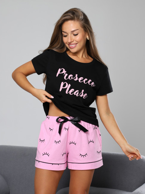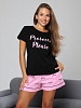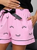 Футболка с принтом, шорты на поясе-резинке с декоративным атласным бантом и двумя внутренними карманами.
