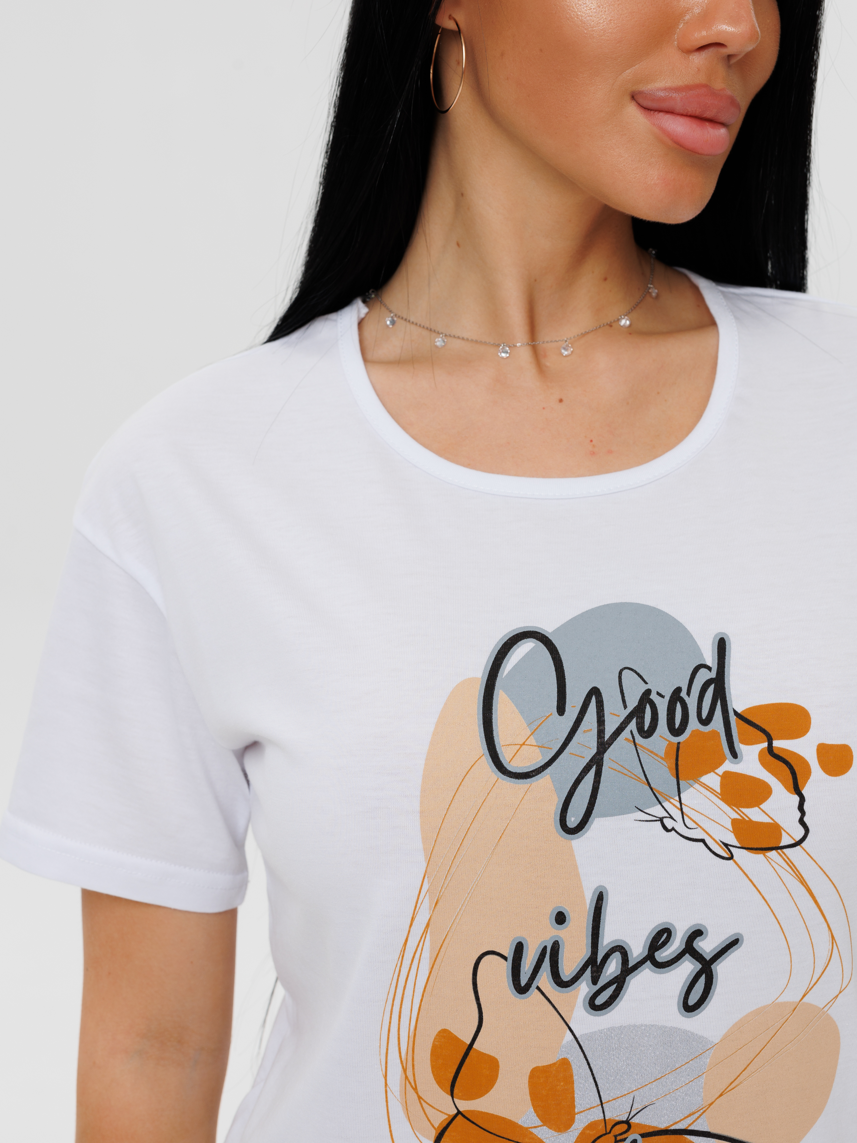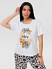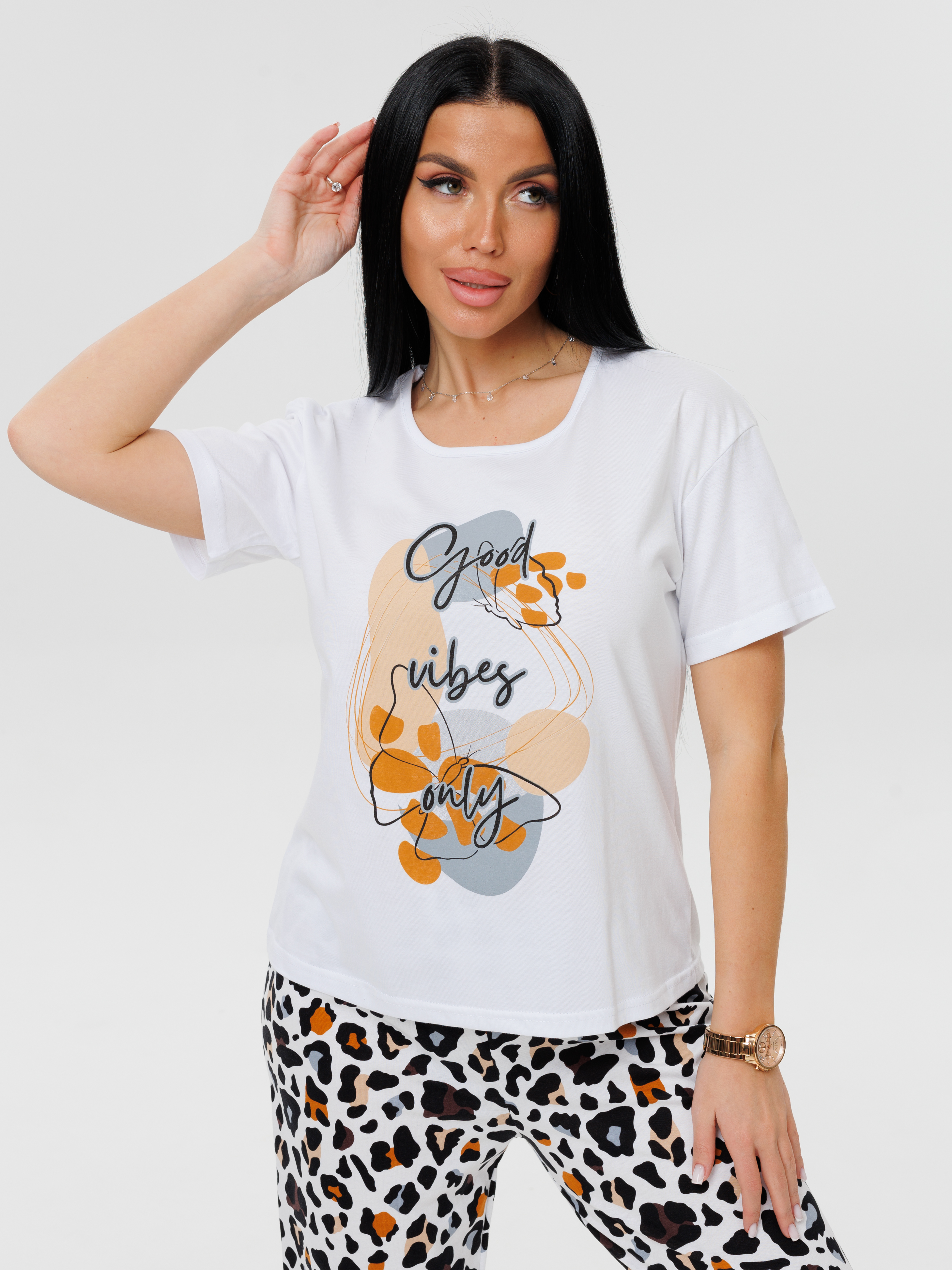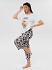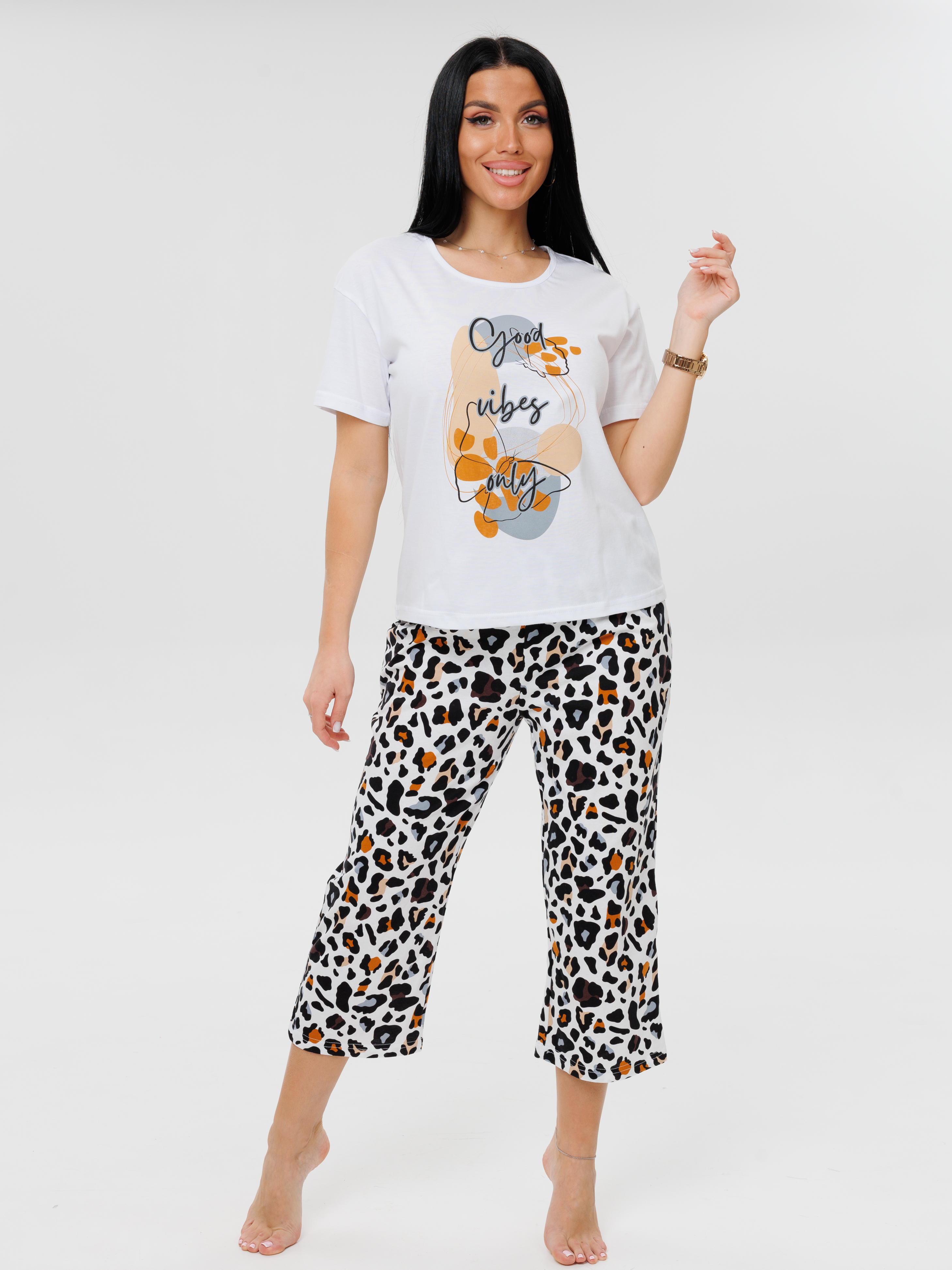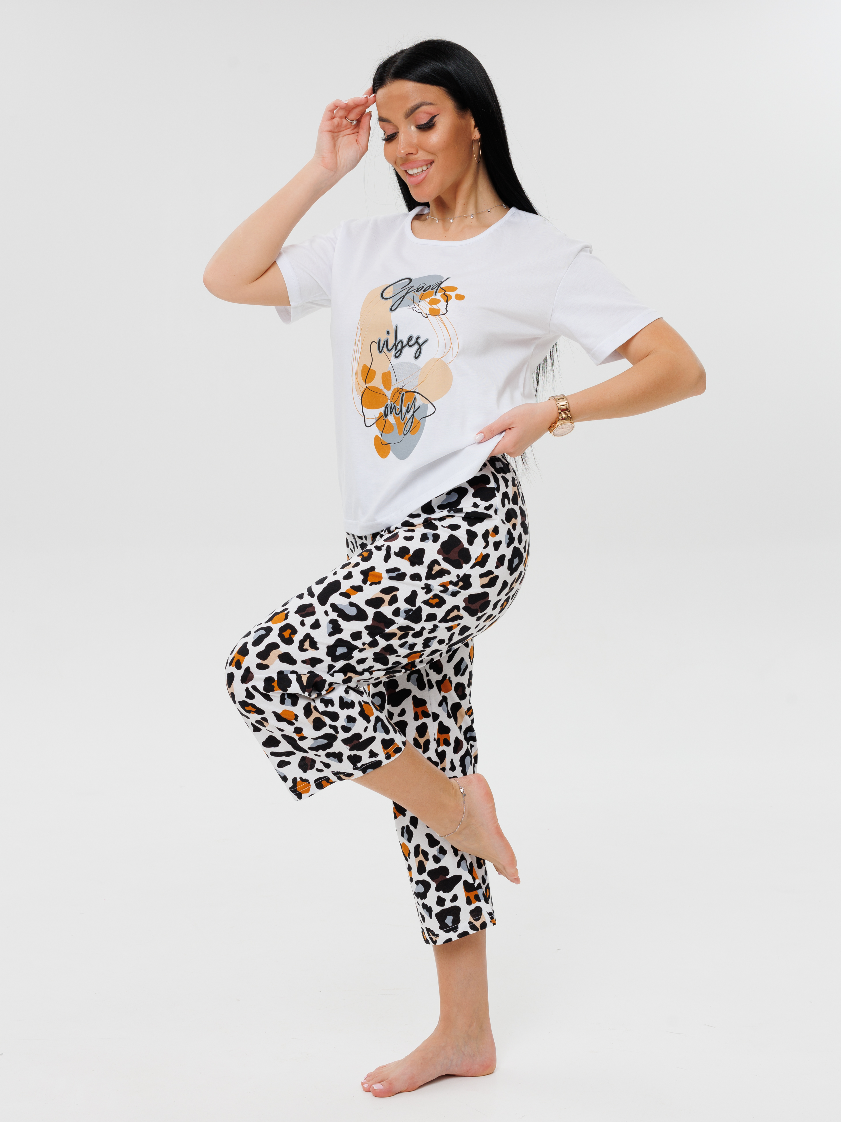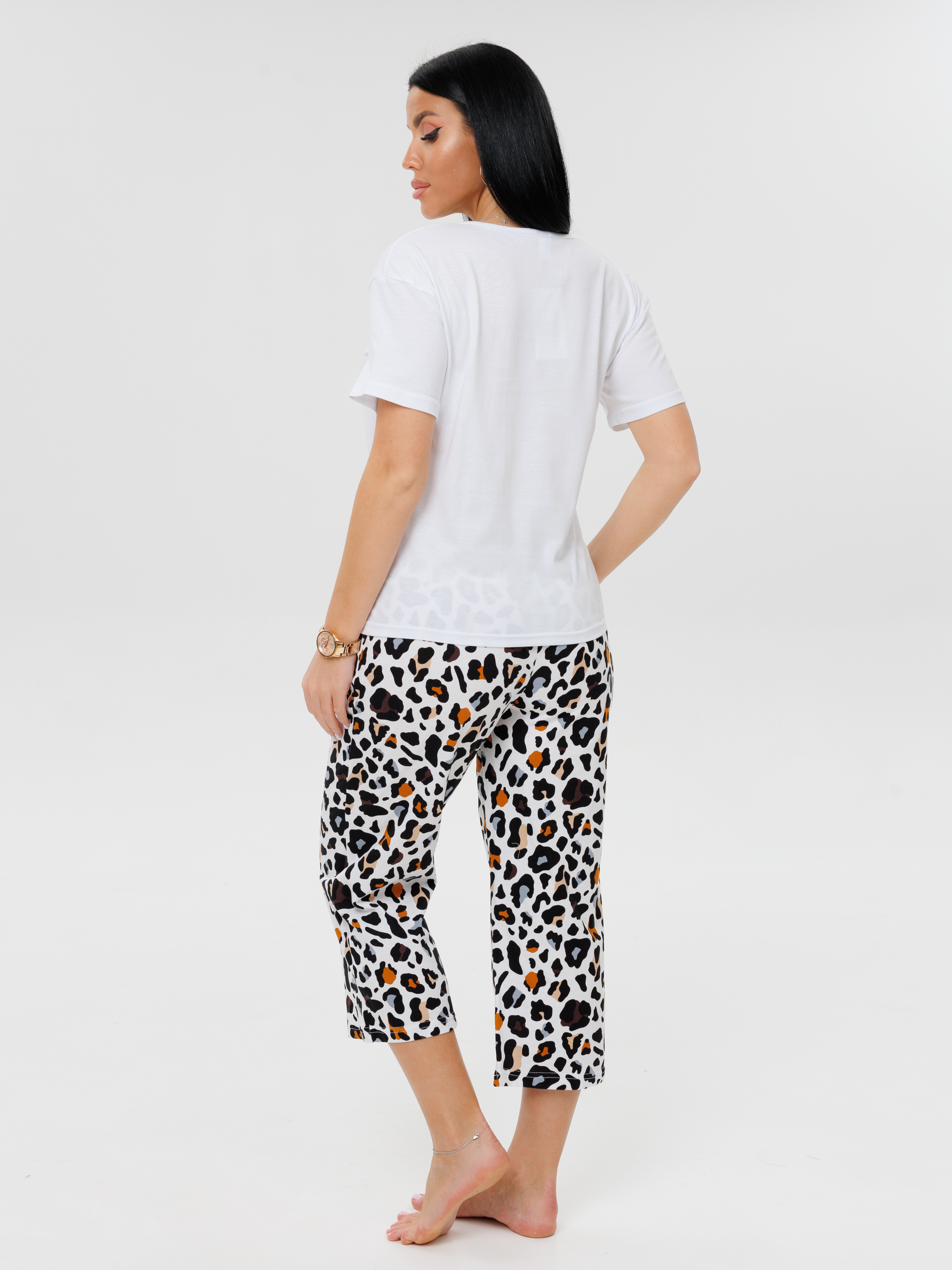 Женская пижама П-67(К) / Белый (надписи) из кулирки. Пижама состоит из футболки и бридж, в модной анималистической расцветке.