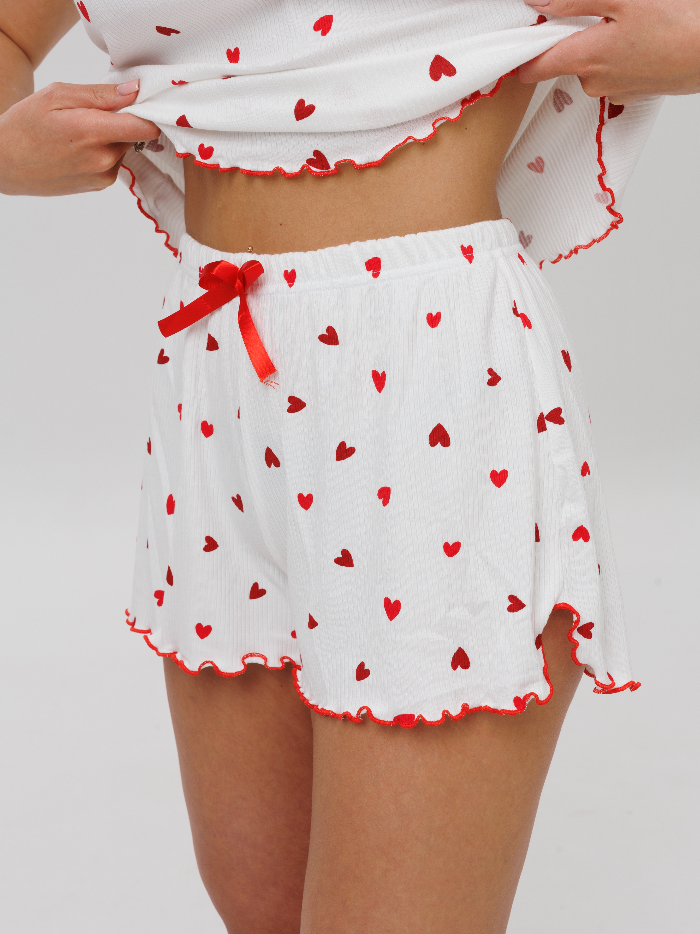 Женская пижама с шортами и топом из лапши — это комфортный домашний комплект, сочетающий мягкость, эластичность и стильный дизайн. Лапша — трикотажная ткань с рубчатой текстурой, которая обеспечивает свободу движений и приятную тактильность. Такие пижамы часто дополняют принтами или декоративными элементами, что делает их не только практичными, но и эстетичными.
