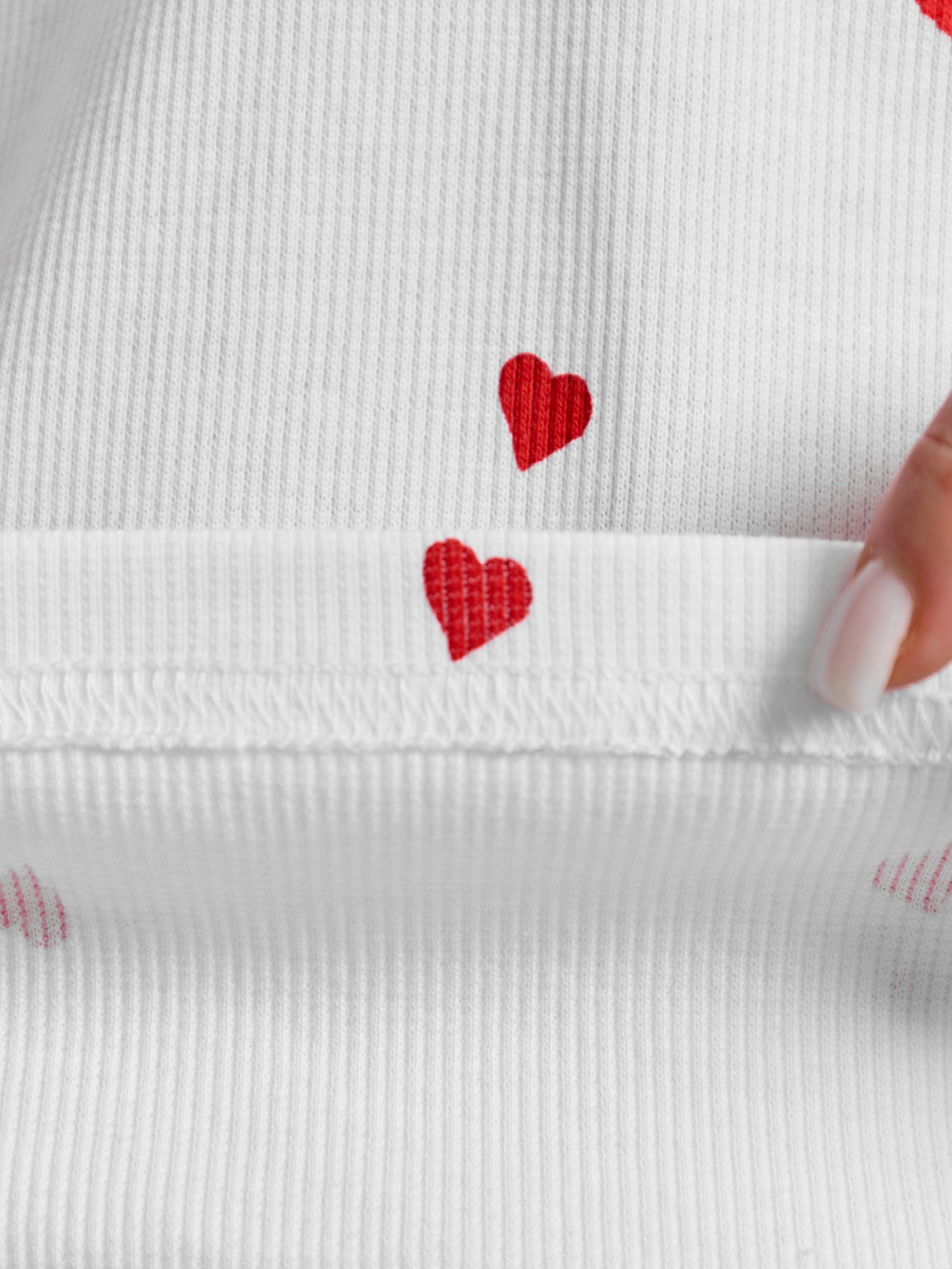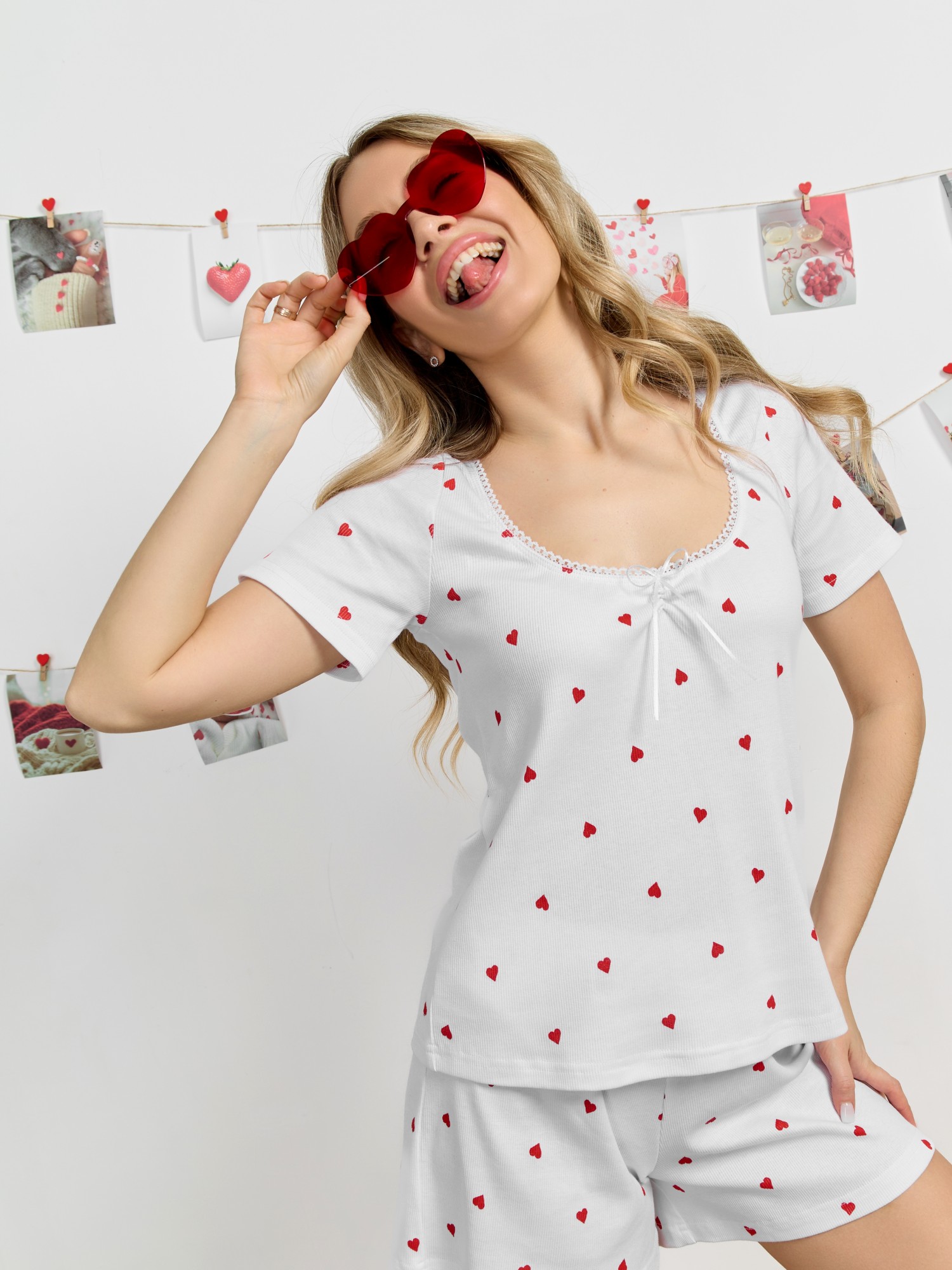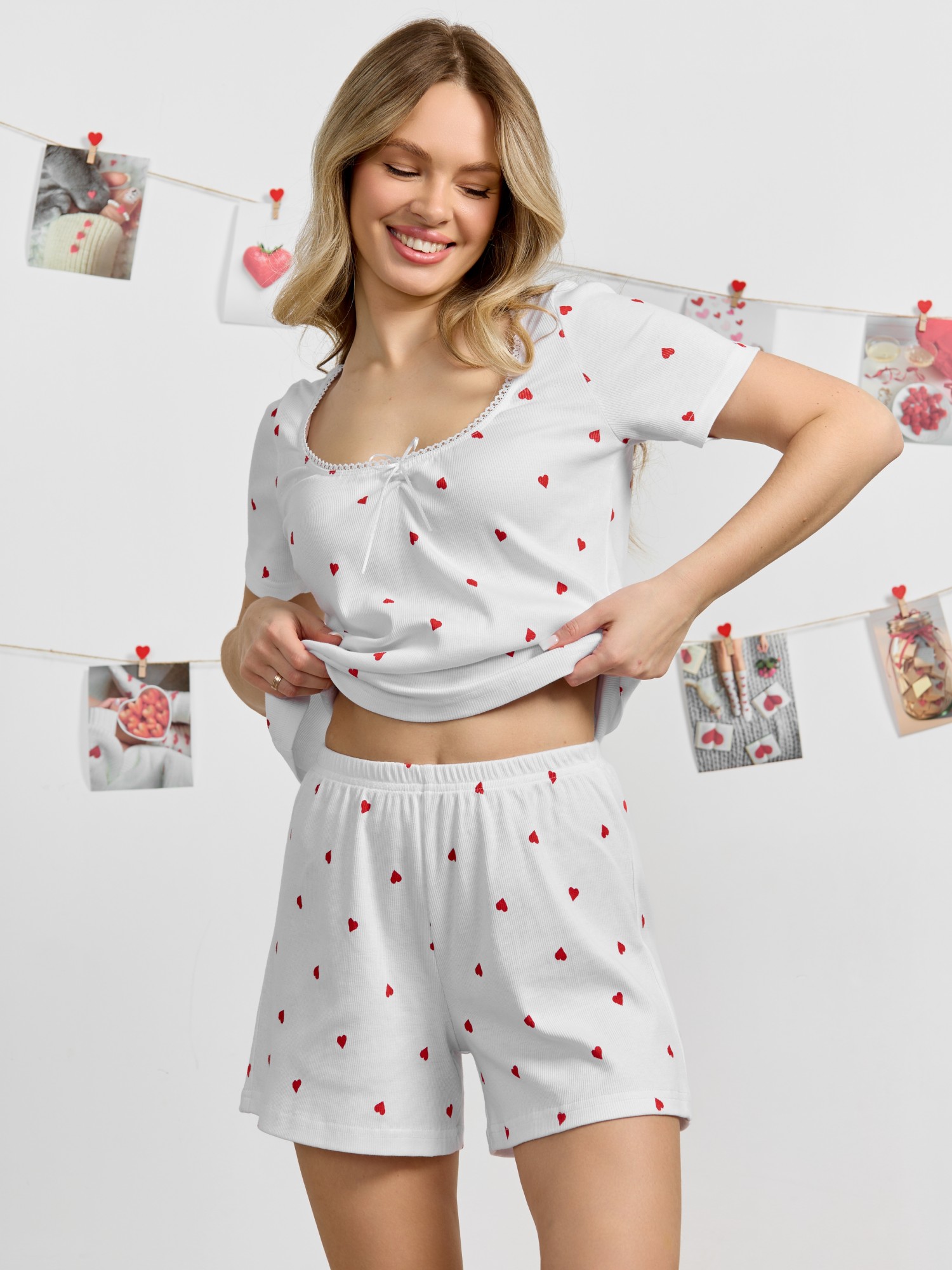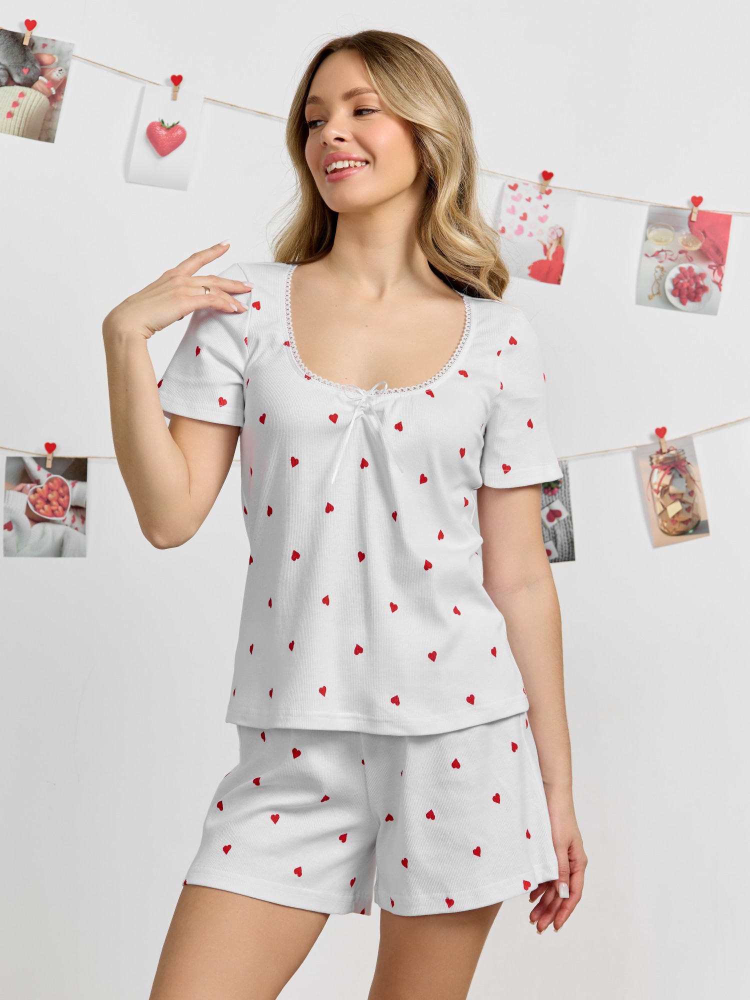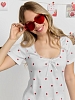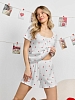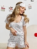 Пижама женская из трикотажного полотна «кашкорсе» с набивным рисунком, состоящая из футболки и шорт. Футболка - классического покроя, полуприлегающего силуэта, с короткими втачными рукавами, углубленной формой горловины, по центру которой выполнена небольшая сборка. Низ изделия и нижние срезы рукавов обработаны подгибкой, срез горловины - эластичной тесьмой с фасонным краем, в центре настрочен узкий декоративный бантик.Шорты – короткие, полуприлегающие, с эластичной тесьмой по талии.