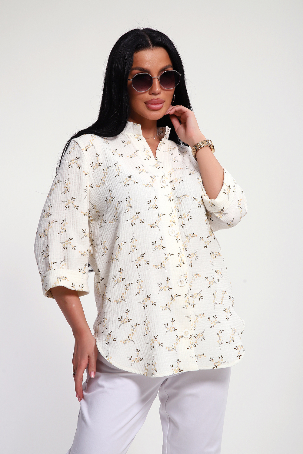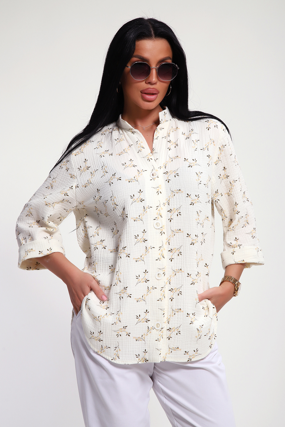Свободный крой, удлиненный силует, фигурный низ рубашки, рукава 3/4 с манжетом, аккуратная стойка по горловине - эта модель воплощает в себе утонченную непринужденность и безупречный вкус. Застежка на петли и пуговицы образуют V-образный вырез по горловине, что удлиняет шею и подчеркивает женственность образа.