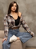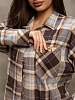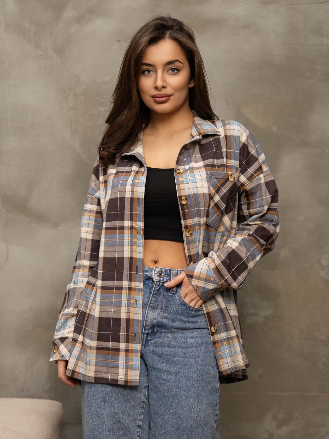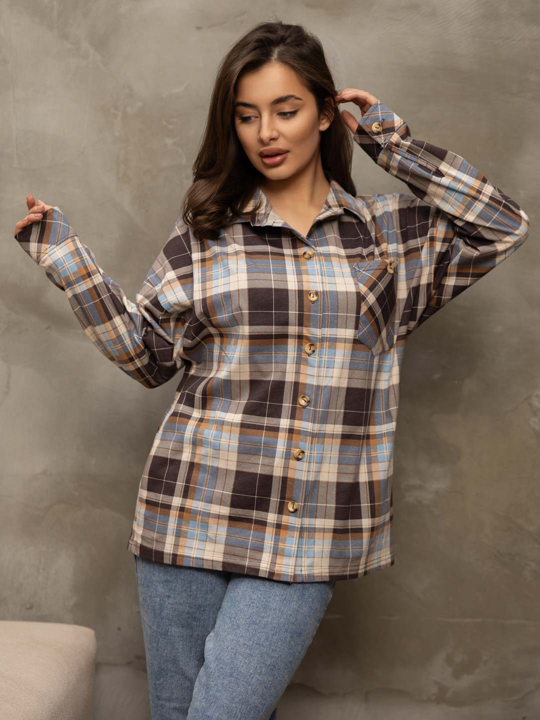 Женская рубашка из трикотажного хлопкового полотна в клетку, свободного кроя, с отложным воротником, втачным рукавом и манжетой на пуговице, на полочке накладной карман. Трендовая рубашка дополнена декоративными пуговицами.