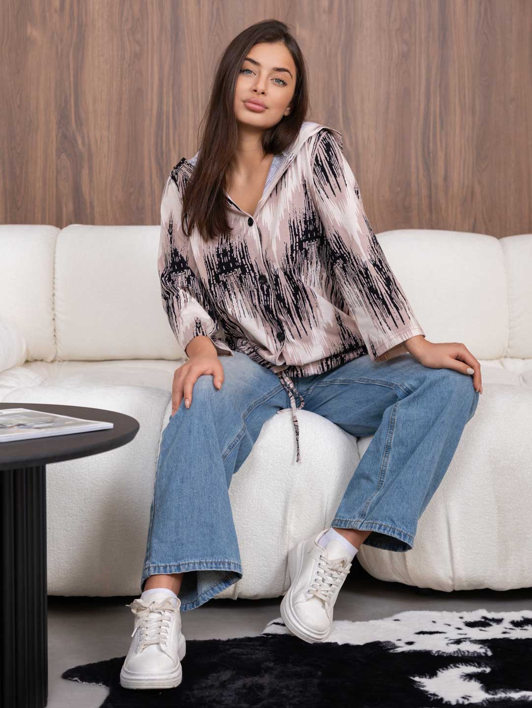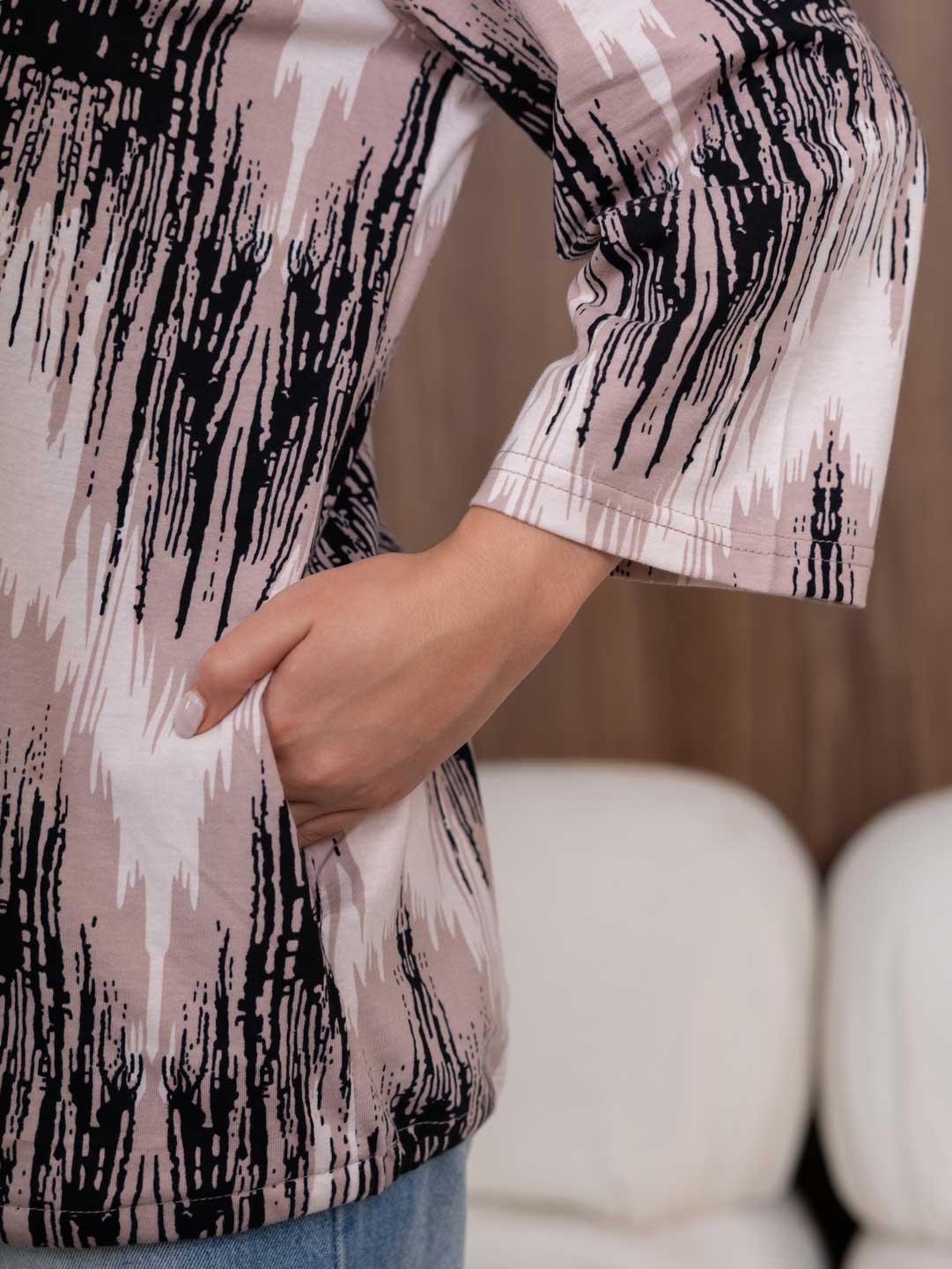 Рубашка с капюшоном из 100% хлопка на пуговицах и кулиске, с рукавом 3/4. Туника выполнена из набивной кулирки турецкого качества. Рост модели 165см.
