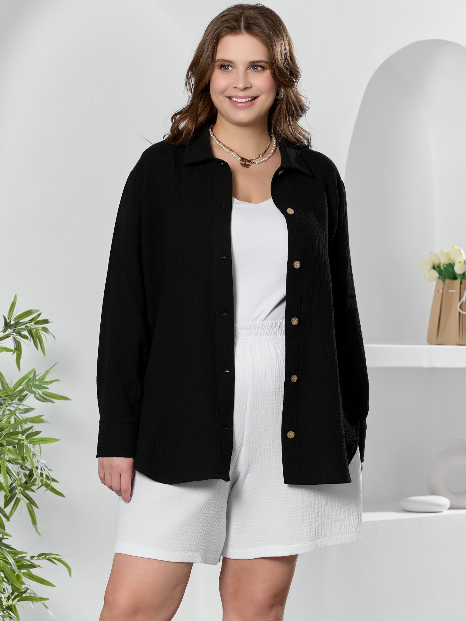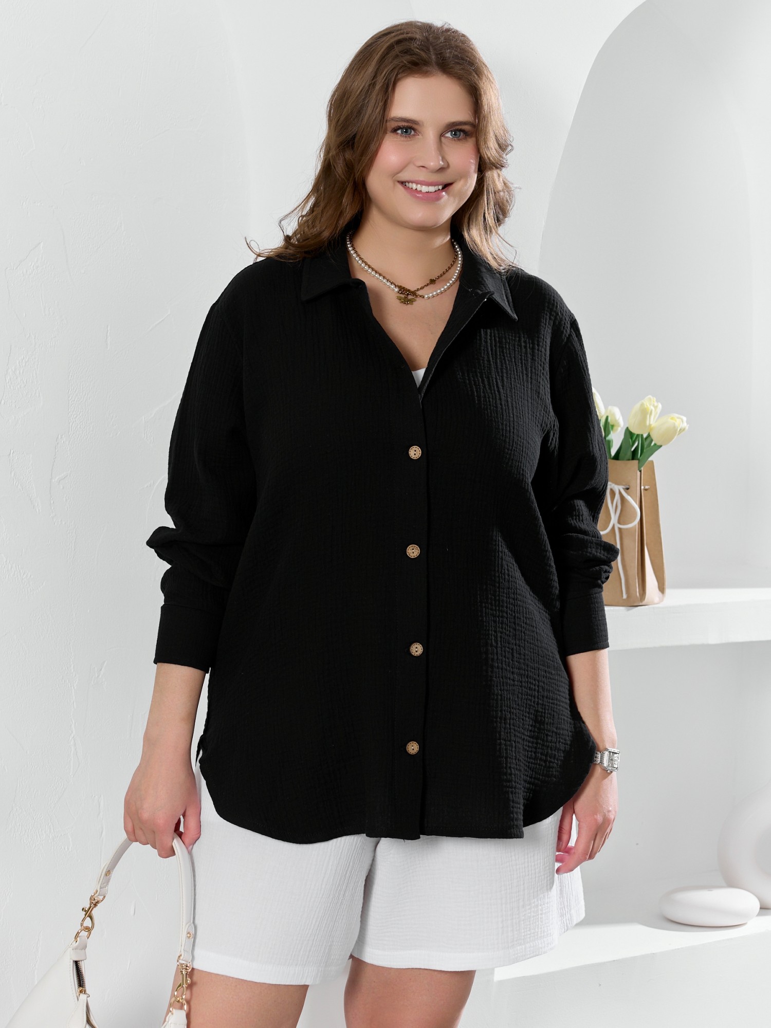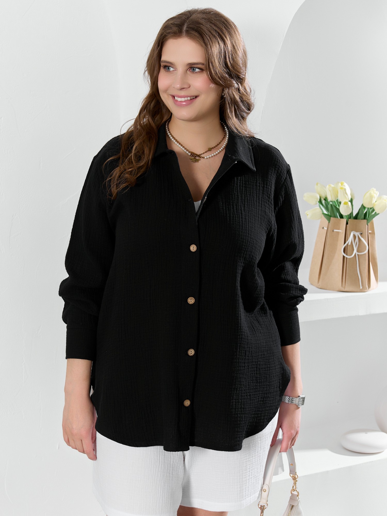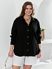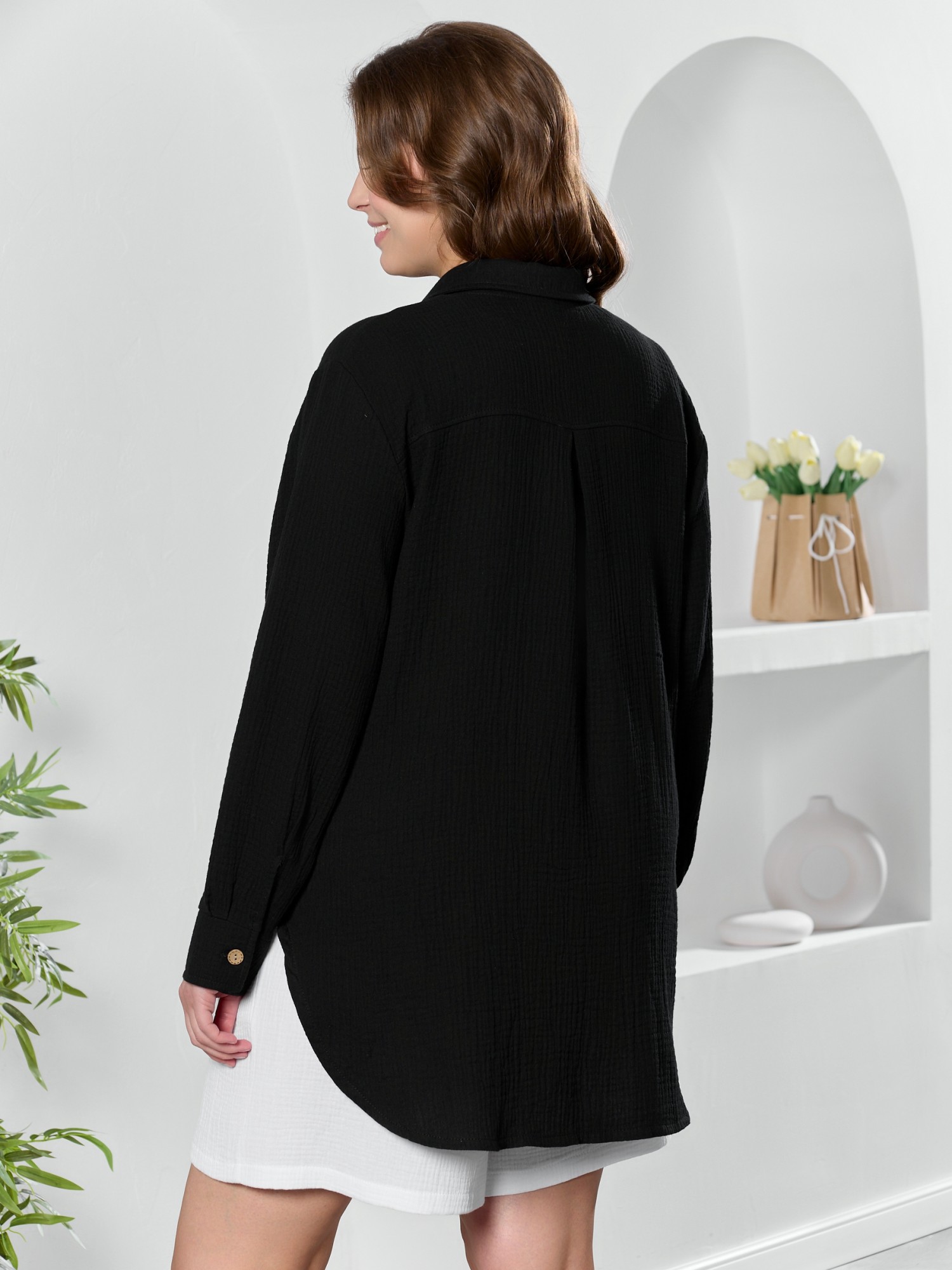 Рубашка – женская из гладкокрашеного тканого полотна «муслин», прямого силуэта, с длинными втачными рукавами на притачных манжетах, стояче-отложным воротником, фигурным низом и центральной бортовой застежкой на петли и пуговицы. Спинка – с отрезной кокеткой и бантовой складкой в центре соединительного шва.