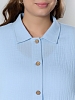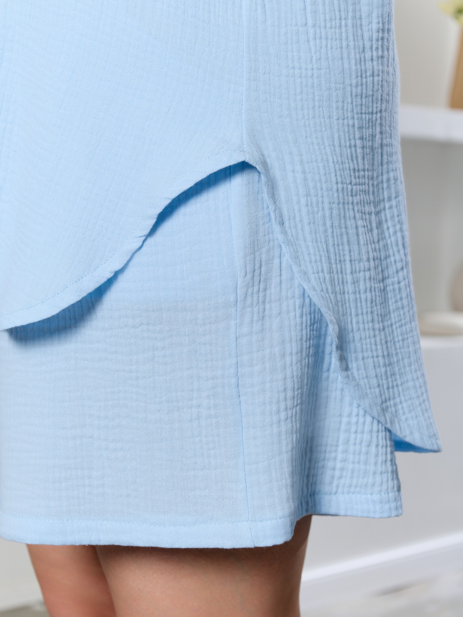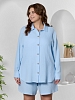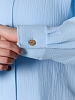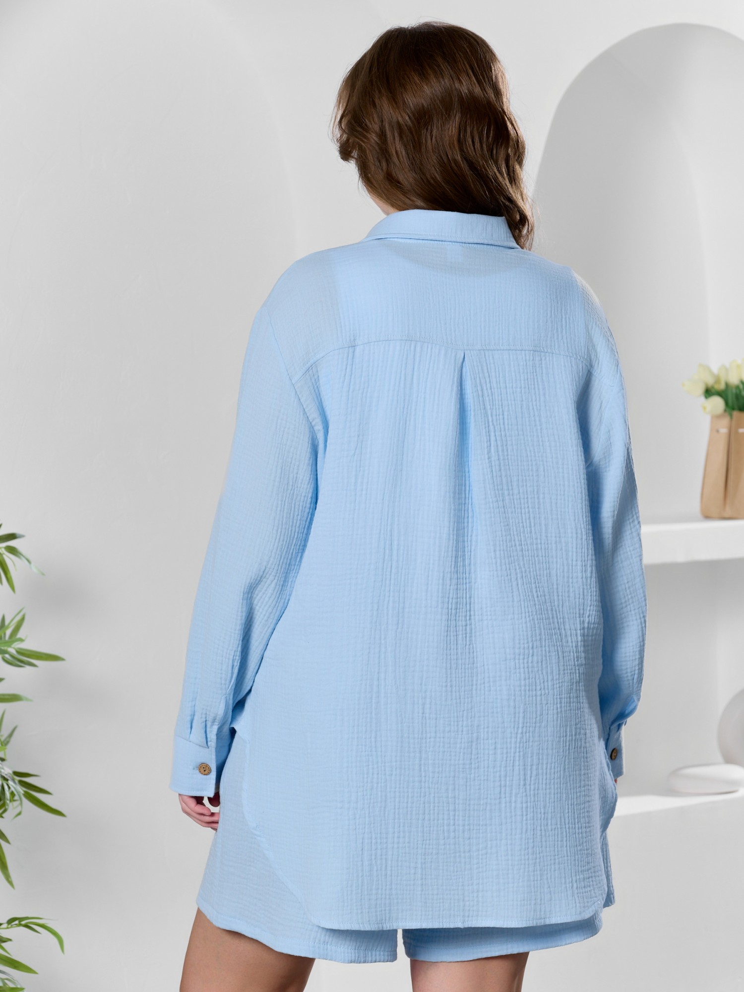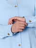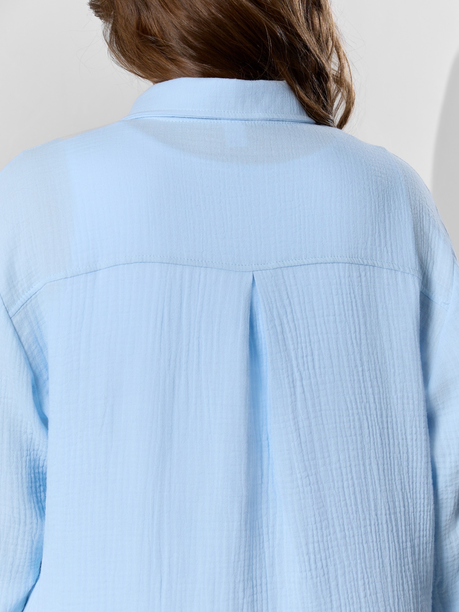Рубашка – женская из гладкокрашеного тканого полотна «муслин», прямого силуэта, с длинными втачными рукавами на притачных манжетах, стояче-отложным воротником, фигурным низом и центральной бортовой застежкой на петли и пуговицы. Спинка – с отрезной кокеткой и бантовой складкой в центре соединительного шва.