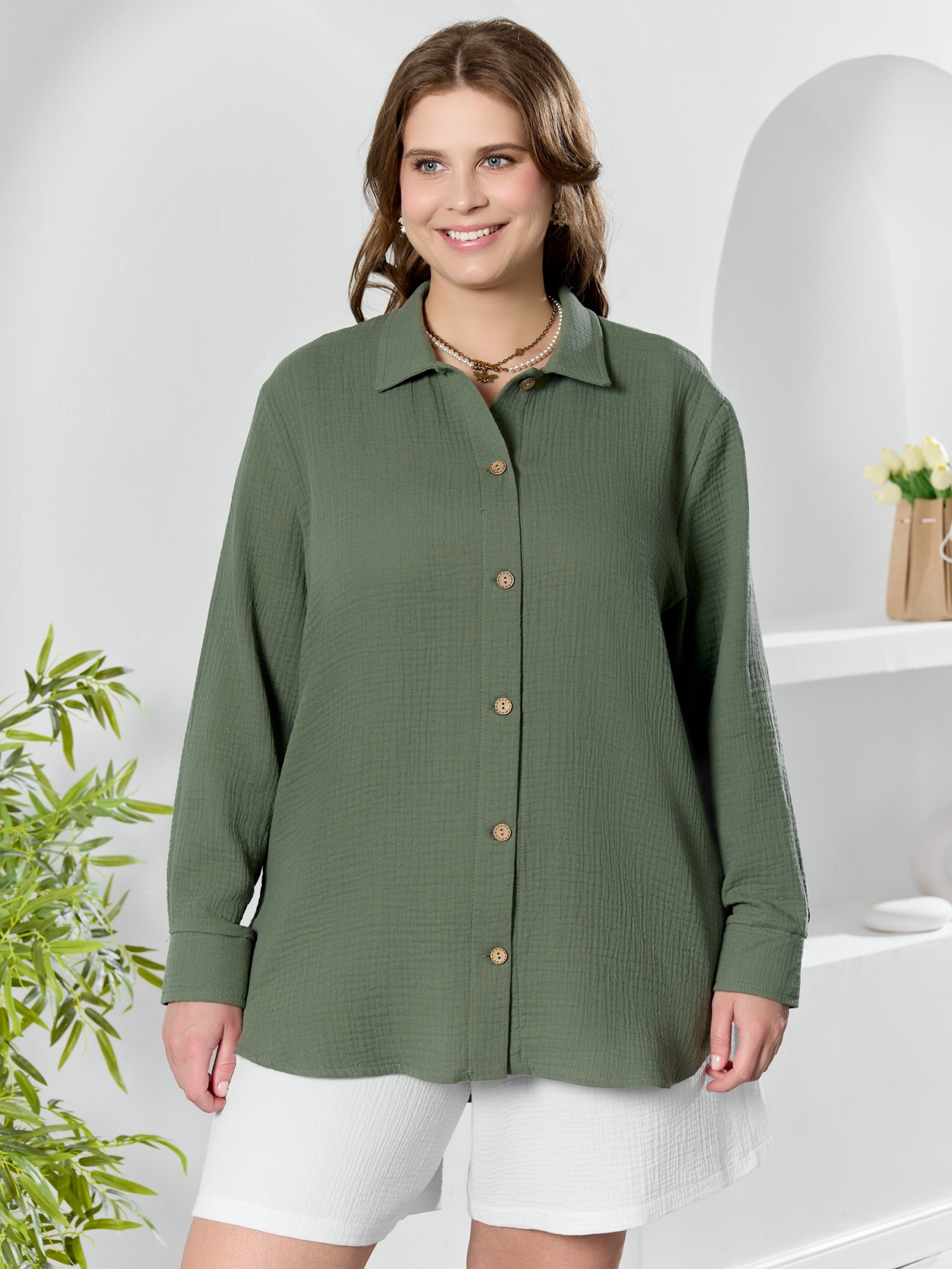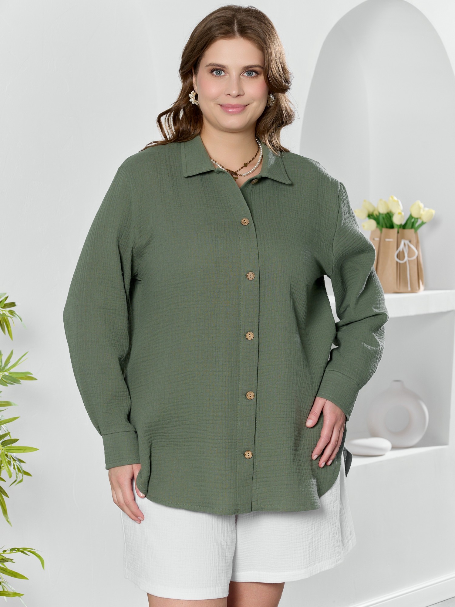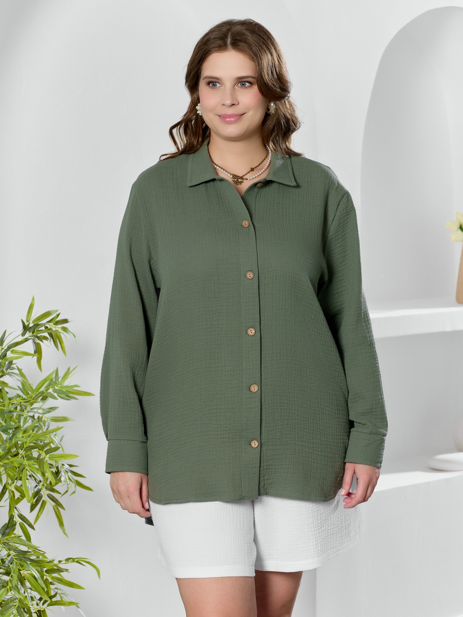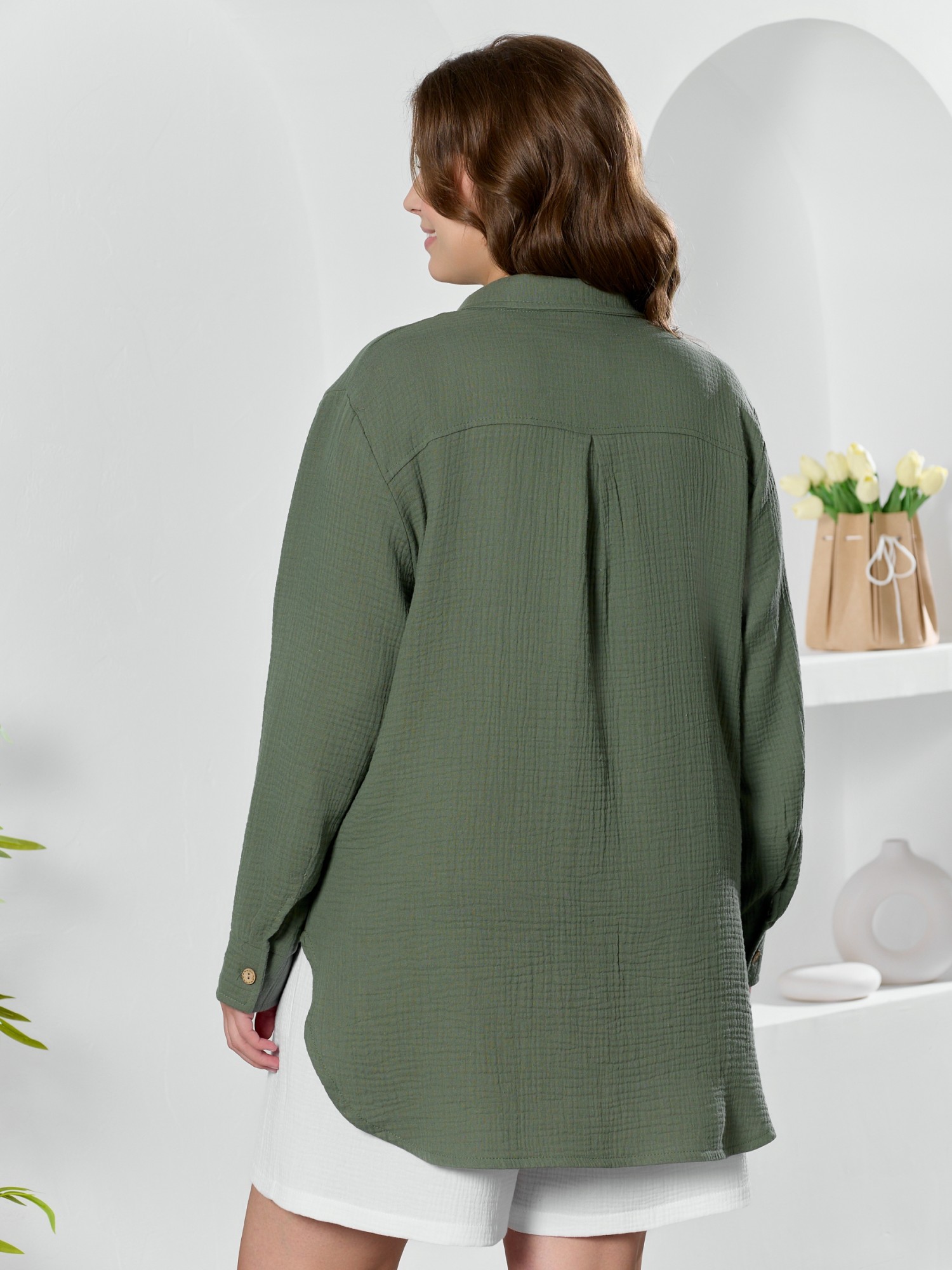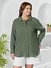 Рубашка – женская из гладкокрашеного тканого полотна «муслин», прямого силуэта, с длинными втачными рукавами на притачных манжетах, стояче-отложным воротником, фигурным низом и центральной бортовой застежкой на петли и пуговицы. Спинка – с отрезной кокеткой и бантовой складкой в центре соединительного шва.