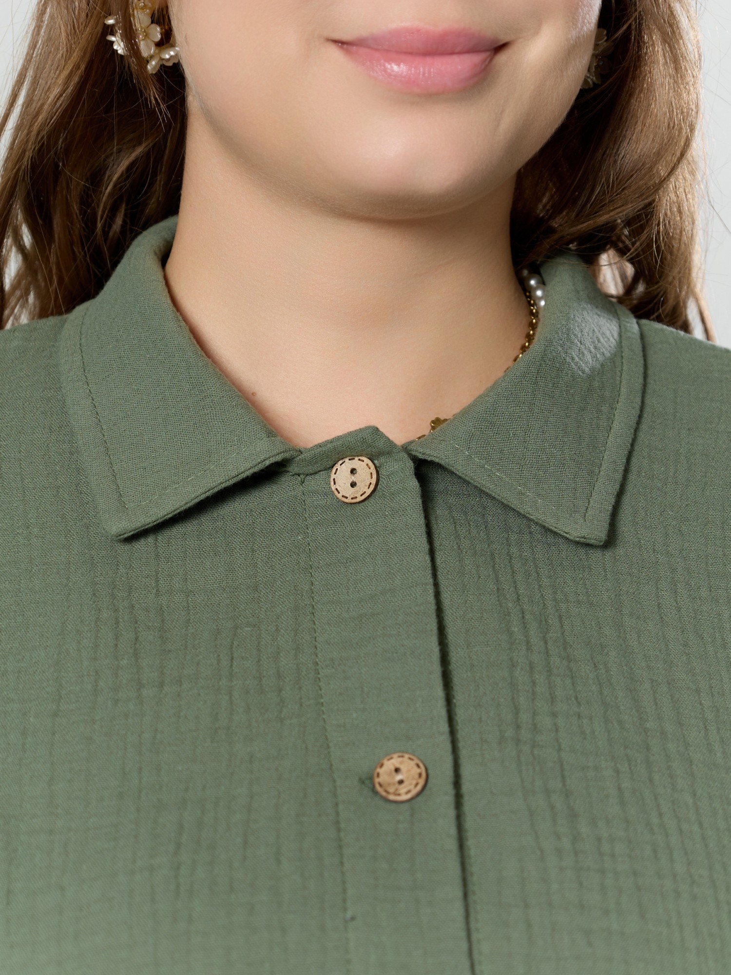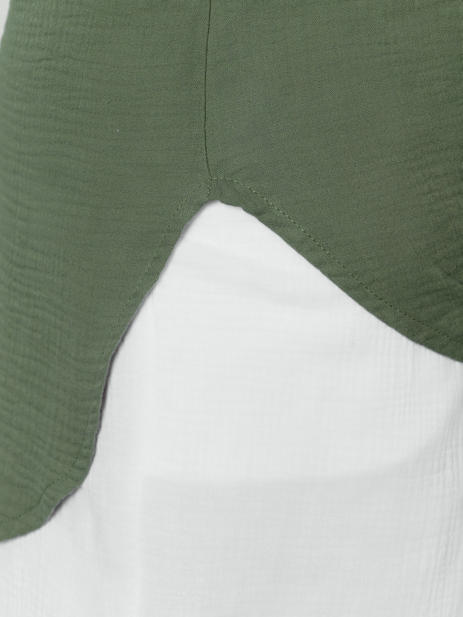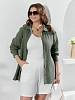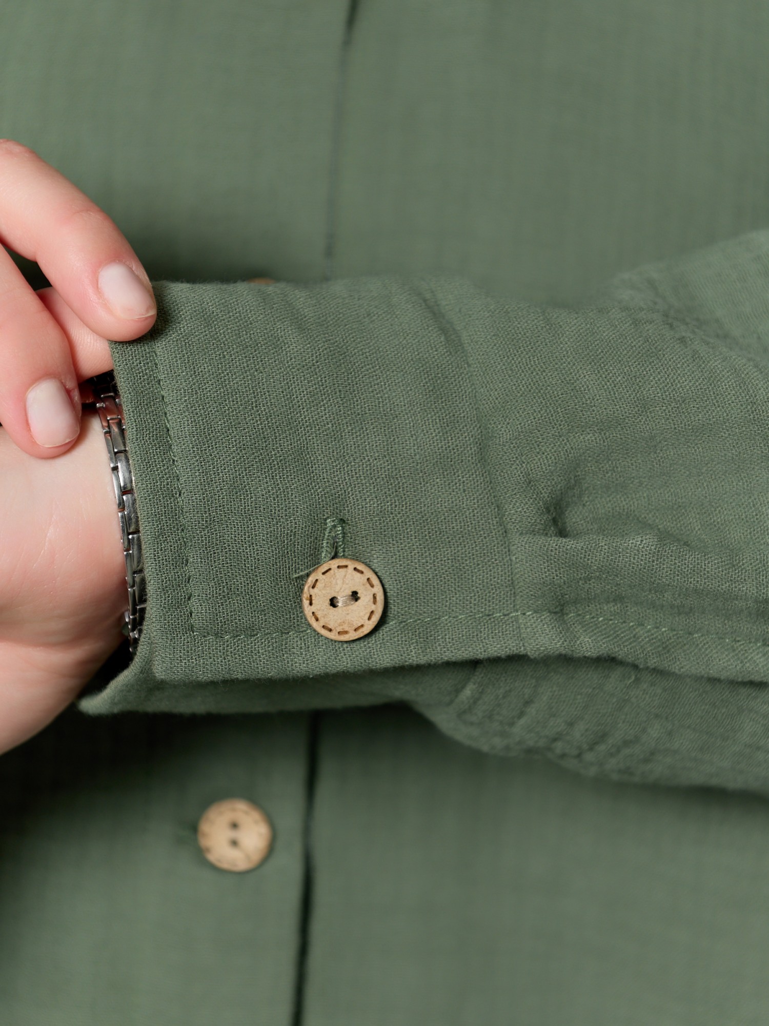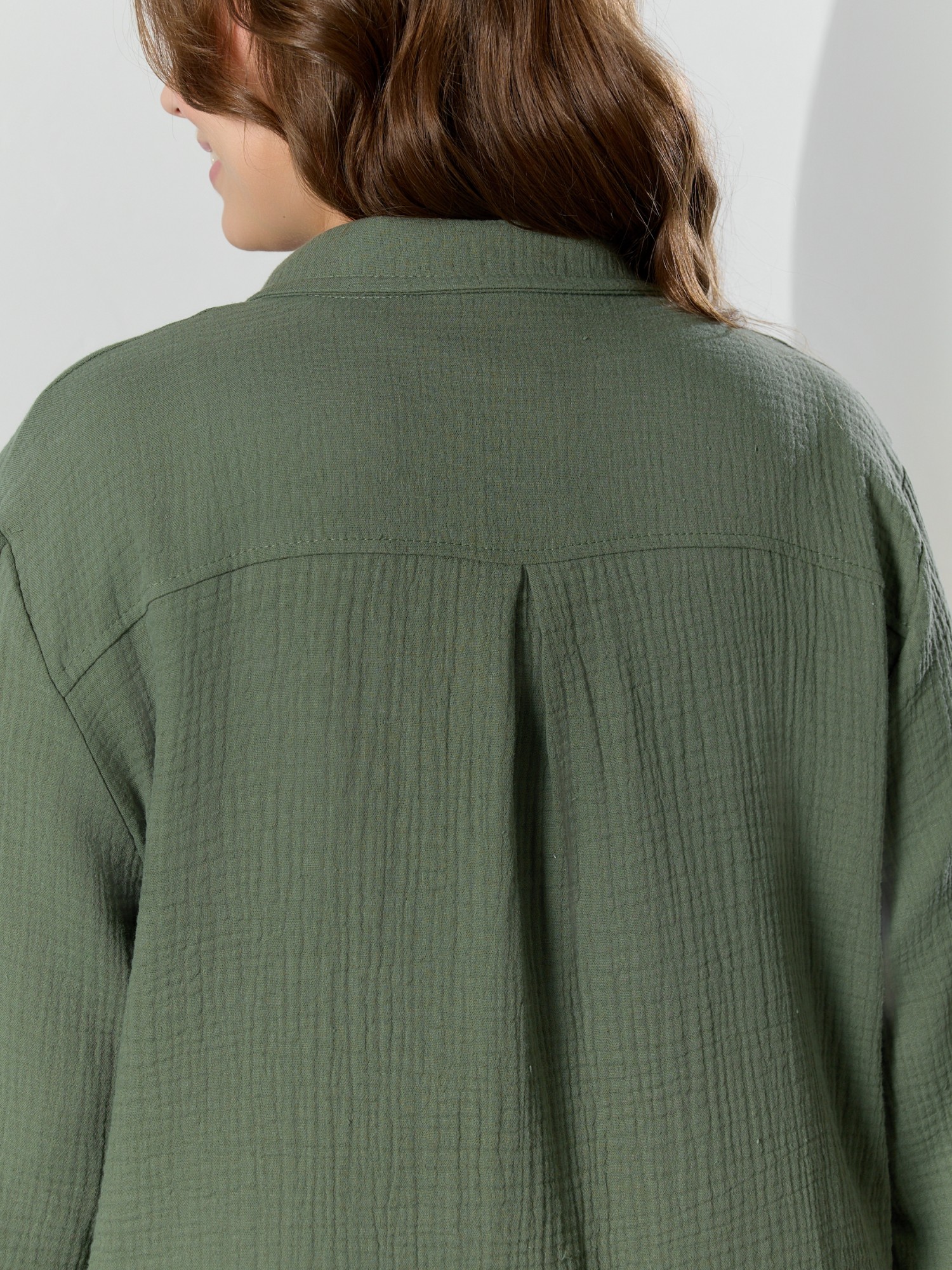 Рубашка – женская из гладкокрашеного тканого полотна «муслин», прямого силуэта, с длинными втачными рукавами на притачных манжетах, стояче-отложным воротником, фигурным низом и центральной бортовой застежкой на петли и пуговицы. Спинка – с отрезной кокеткой и бантовой складкой в центре соединительного шва.