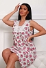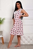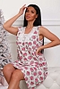 Сорочка женская из натурального набивного полотна. Хлопок 100%. Силуэт прямой. Длинна чуть ниже колена. Горловина фигурной формы, отделана кружевом. По линии груди легкая сборка. По спинке рельефы. Без рукава. Пройма и горловина спинки обработаны окантовкой. Низ изделия прямой.