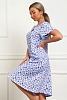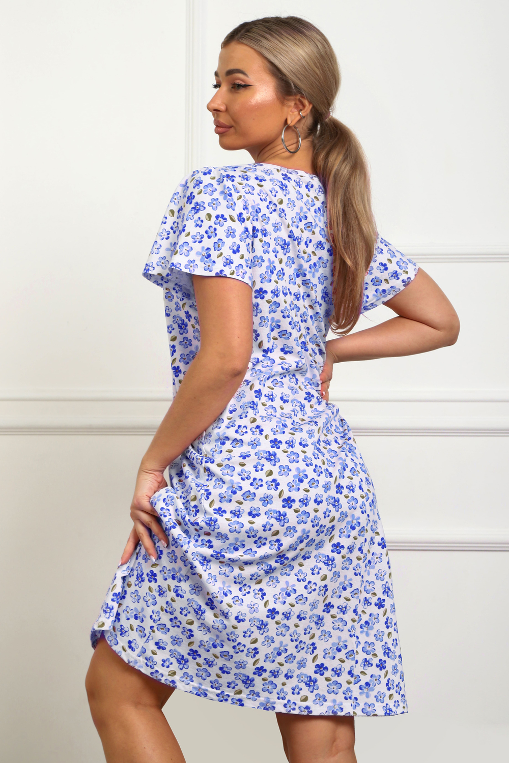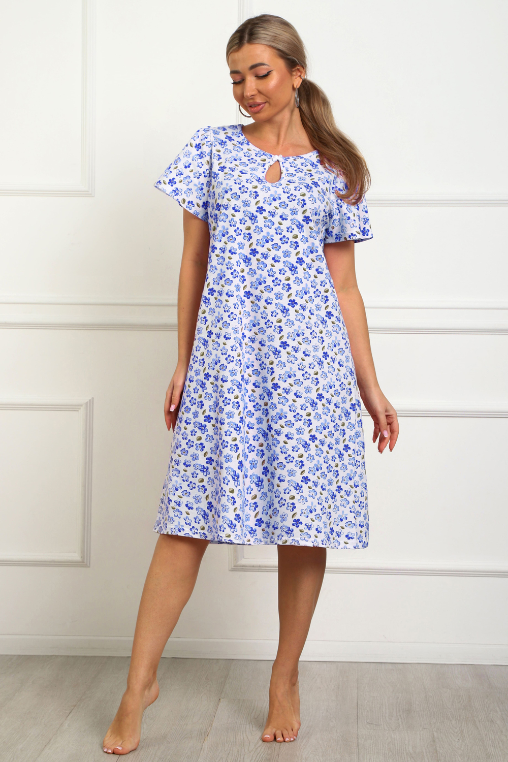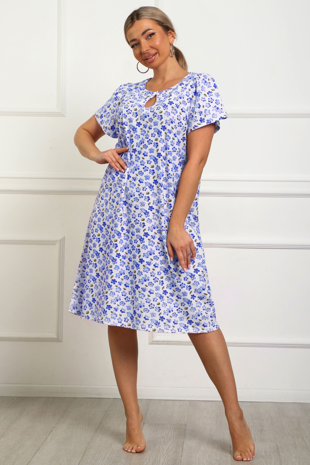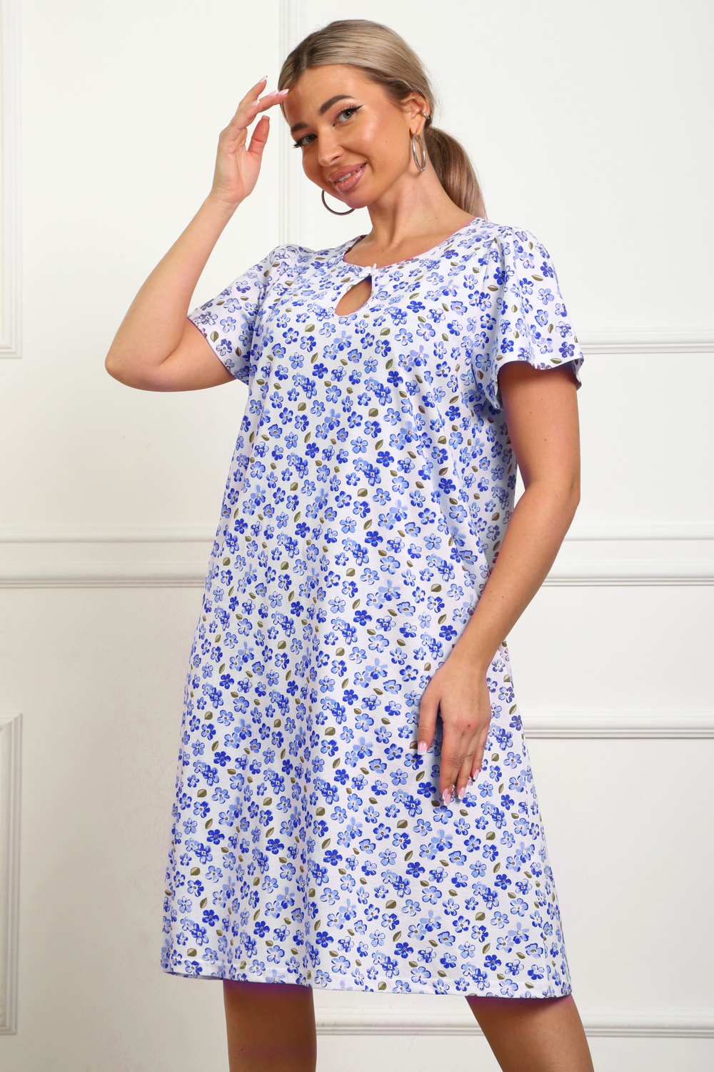 Сорочка женская из натурального набивного трикотажа, хлопок 100%. Силуэт свободный, расширенный к низу. Горловина круглой формы с капелькой по центру. Обработана окантовкой. Отделкой служит бантик. Рукав короткий, свободный. В верхней части оката выполнена небольшая сборка. Низ изделия прямой. Длина ниже колена.