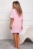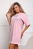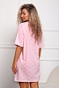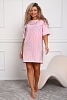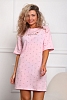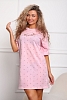 Сорочка женская прямого силуэта. Низ изделия прямой. Длинна выше колена, плечо спущенное, рукав короткий. Горловина круглой формы, обработана планкой с отделочной строчкой по шву притачивания. Принт (шелкография) располагается по центру переда.
