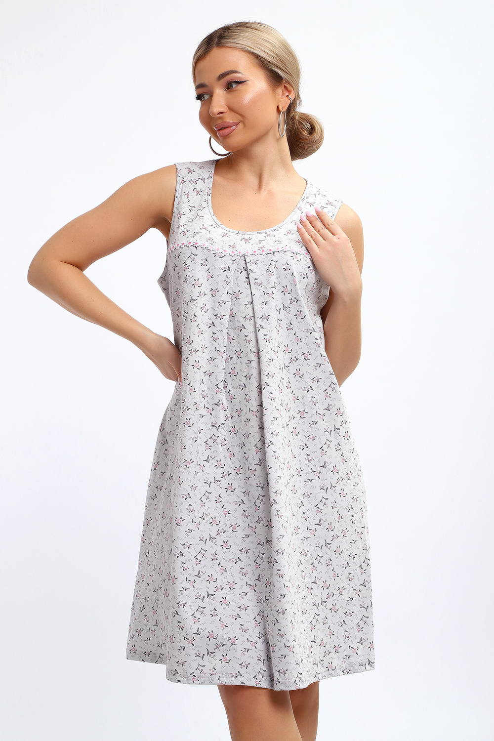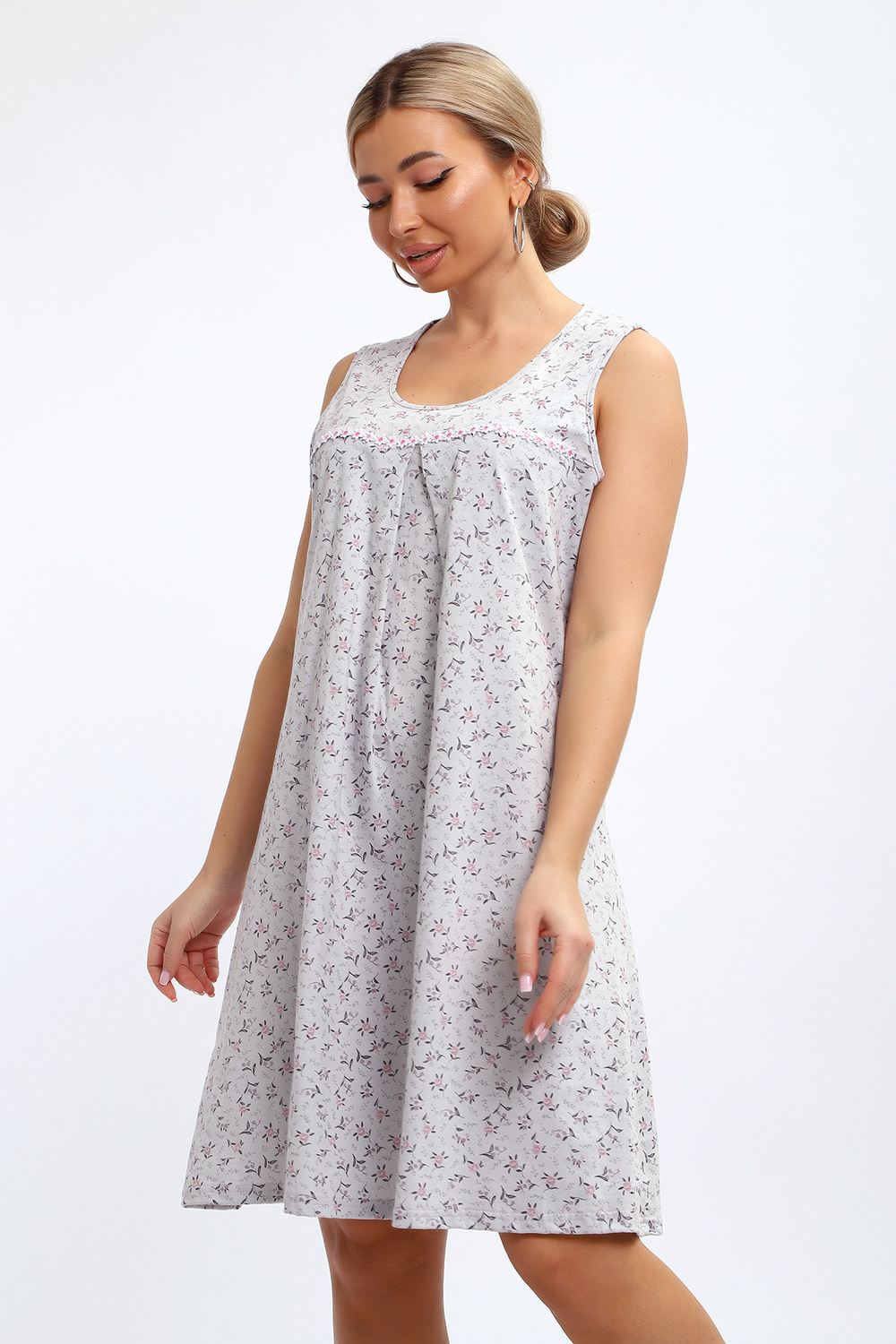 Сорочка свободного покроя маечного фасона без рукава. Юбка под кокеткой со встречной складкой. По кокетке нашиты декоративные ромашки. Подходит для беременных.