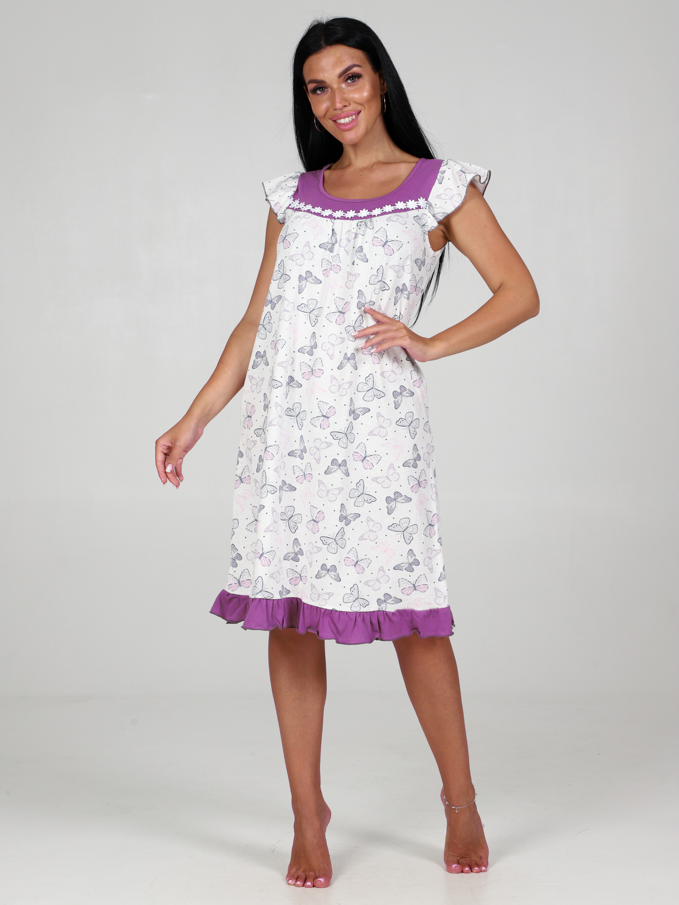 Ночная сорочка женская незаменимая вещь для сна. Благодаря мягкости Вы ощутите комфорт и спокойствие. Ночнушка из 100% хлопкового трикотажа держит форму и позволяет коже дышать. Ночная сорочка женская хлопок 100%. Кокетка однотонная, украшена кружевом. Оборочка по низу подола и рукава - крылышки придают легкость и романтичность образу. Края рукавов и низ оборки обработаны на микрооверлоке. Ночнушка женская, сорочка для дома незаменимая вещь в домашнем гардеробе.