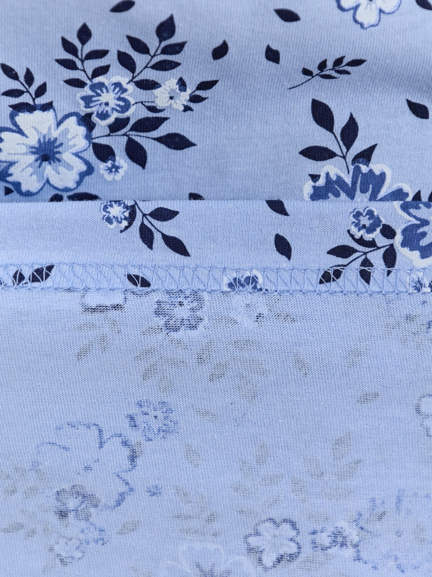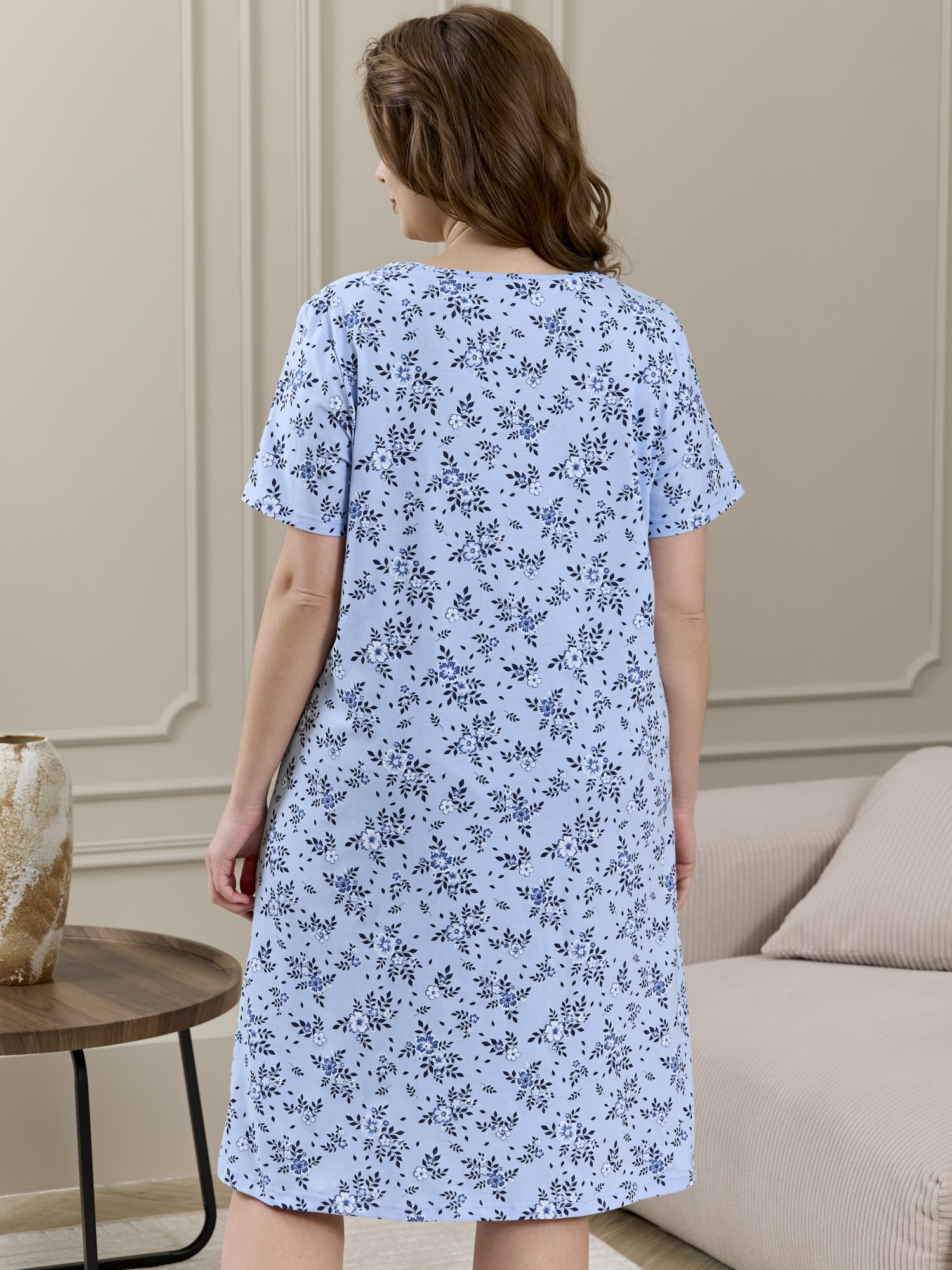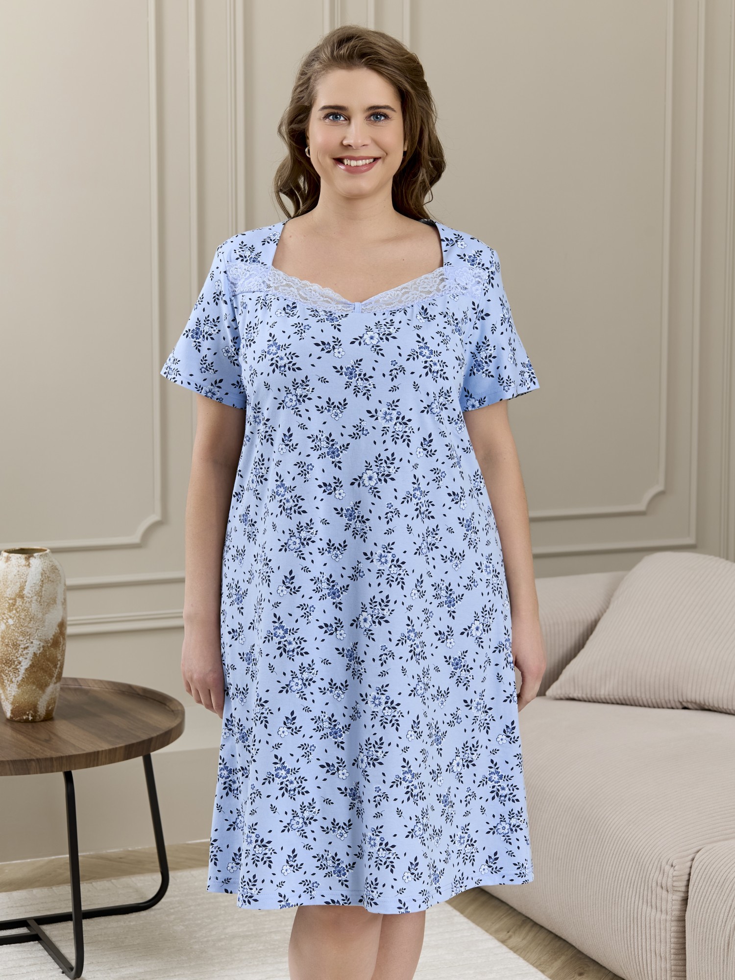 Сорочка женская из трикотажного полотна «кулирка» с набивным рисунком, свободного кроя, слегка расширенная книзу, с короткими втачными рукавами. Полочка – с двойными кокетками, кружевом в шве соединения кокеток с основной деталью и декоративной вставкой «петлей» для достижения небольшого эффекта драпировки. Основная деталь переда присборена по шву притачивания кокетки.