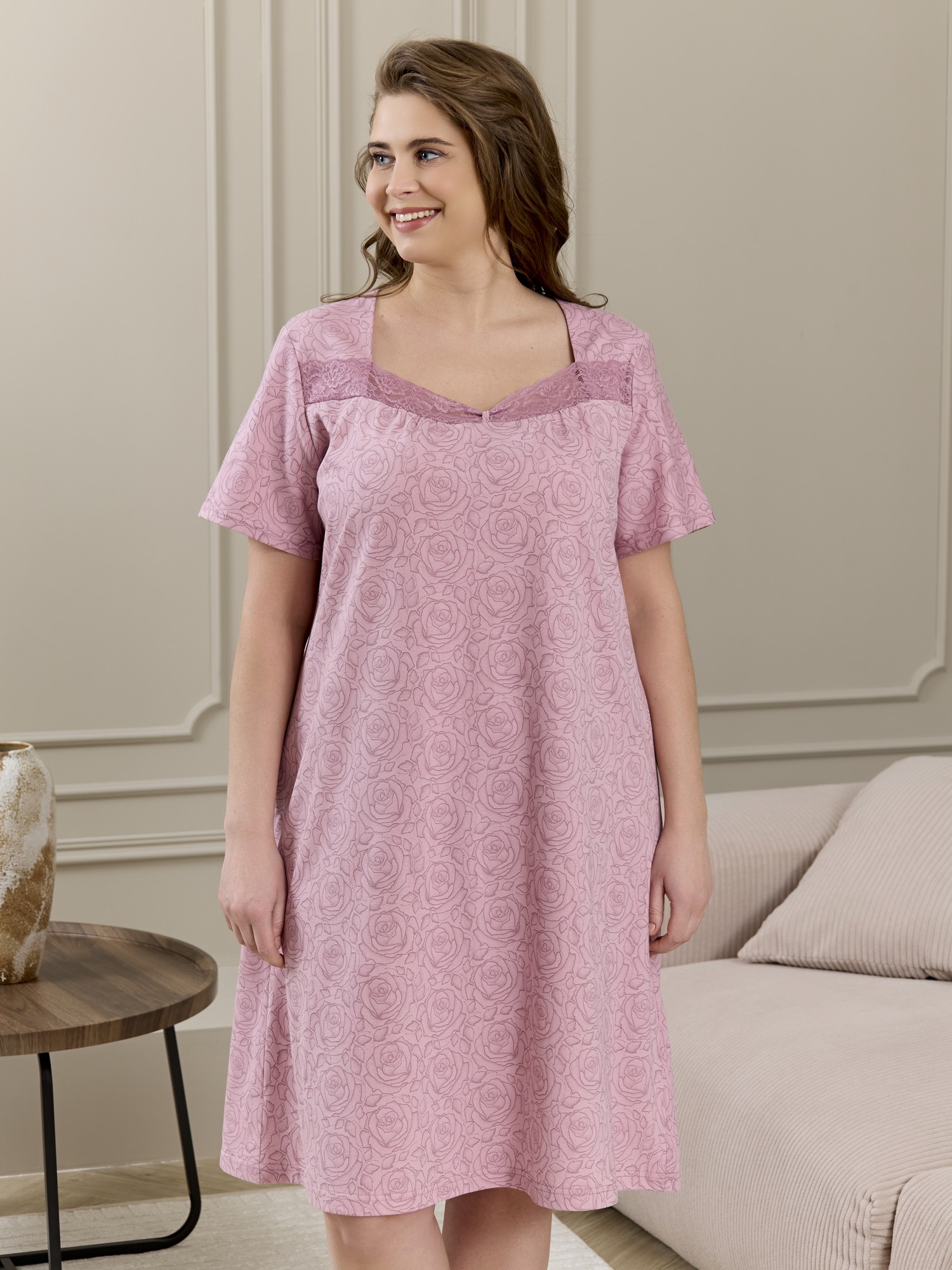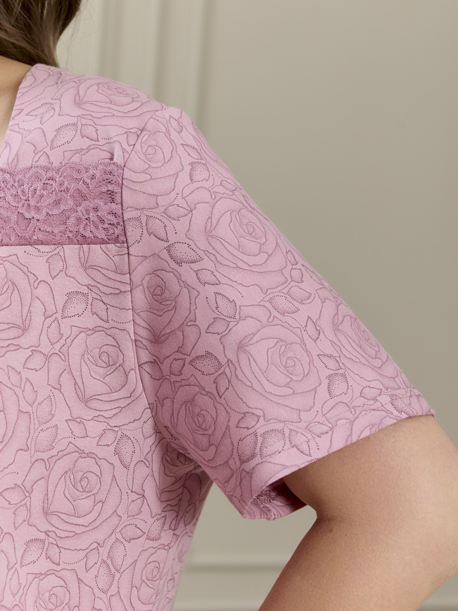 Сорочка женская из трикотажного полотна «кулирка» с набивным рисунком, свободного кроя, слегка расширенная книзу, с короткими втачными рукавами. Полочка – с двойными кокетками, кружевом в шве соединения кокеток с основной деталью и декоративной вставкой «петлей» для достижения небольшого эффекта драпировки. Основная деталь переда присборена по шву притачивания кокетки.