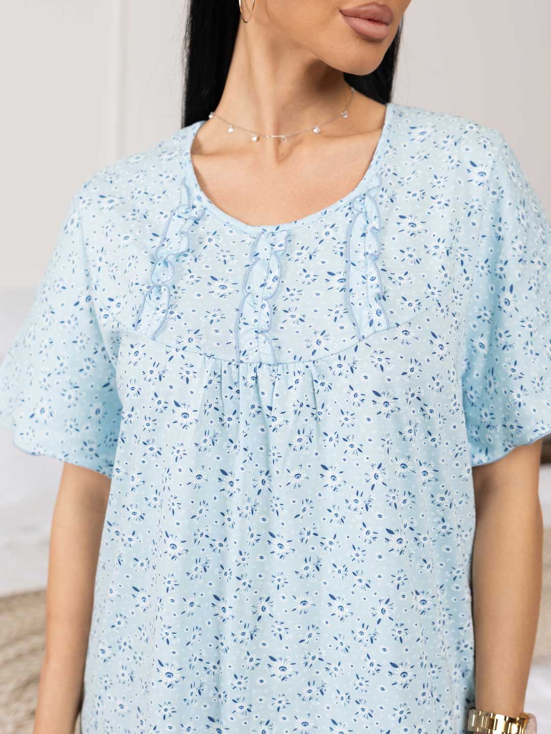 Ночная женская сорочка из хлопка длиной ниже колена, свободной силуэтной формы с коротким рукавом. Спереди кокетка с рюшем. В нашей сорочке Вы будете чувствовать себя комфортно во время сна.