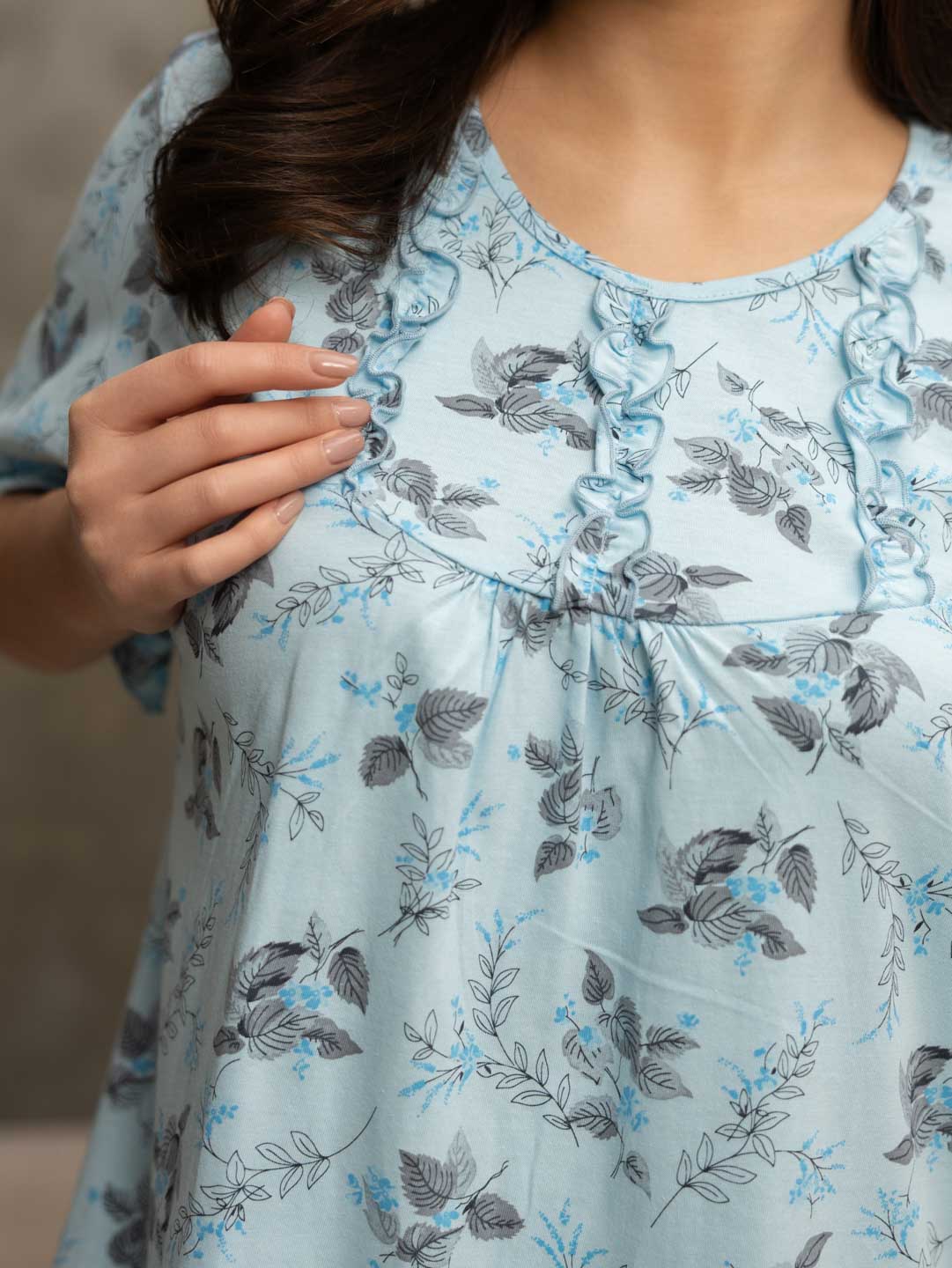 Ночная женская сорочка из хлопка длиной ниже колена, свободной силуэтной формы с коротким рукавом. Спереди кокетка с рюшем. В нашей сорочке Вы будете чувствовать себя комфортно во время сна.