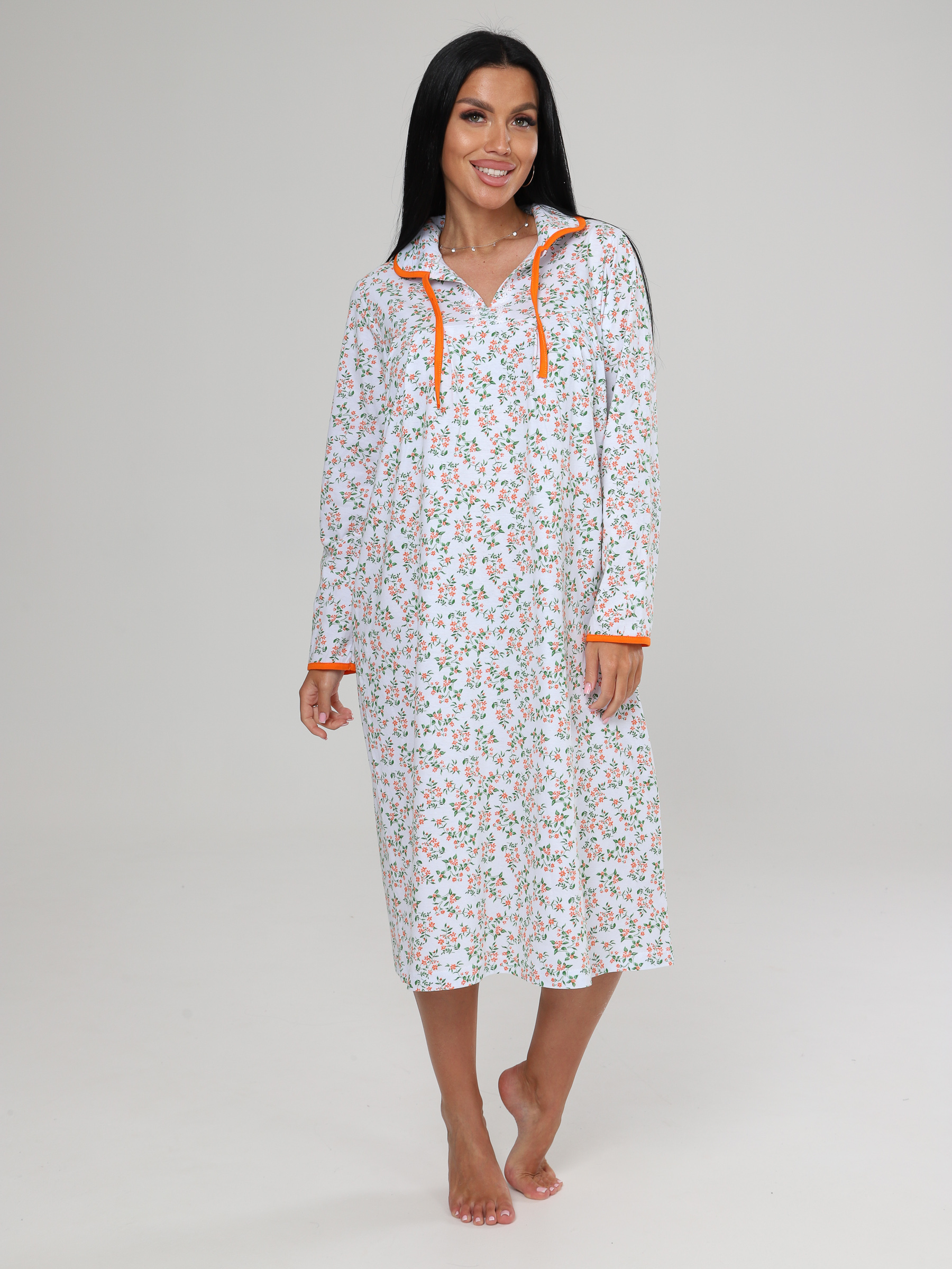 Женская трикотажная ночная сорочка. Ночная сорочка сшита из натурального экологичного 100% хлопка, приятна к телу. Женская сорочка свободного кроя, подарит легкость и комфорт движений. Сорочка ночная женская незаменимая вещь для сна. Женская ночная сорочка отлично сидит на всех типах фигур. Зона воротничка декоративно отделана кружевом, придает нежность и воздушность, а так же шнурочками, что делает воротник более универсальным.