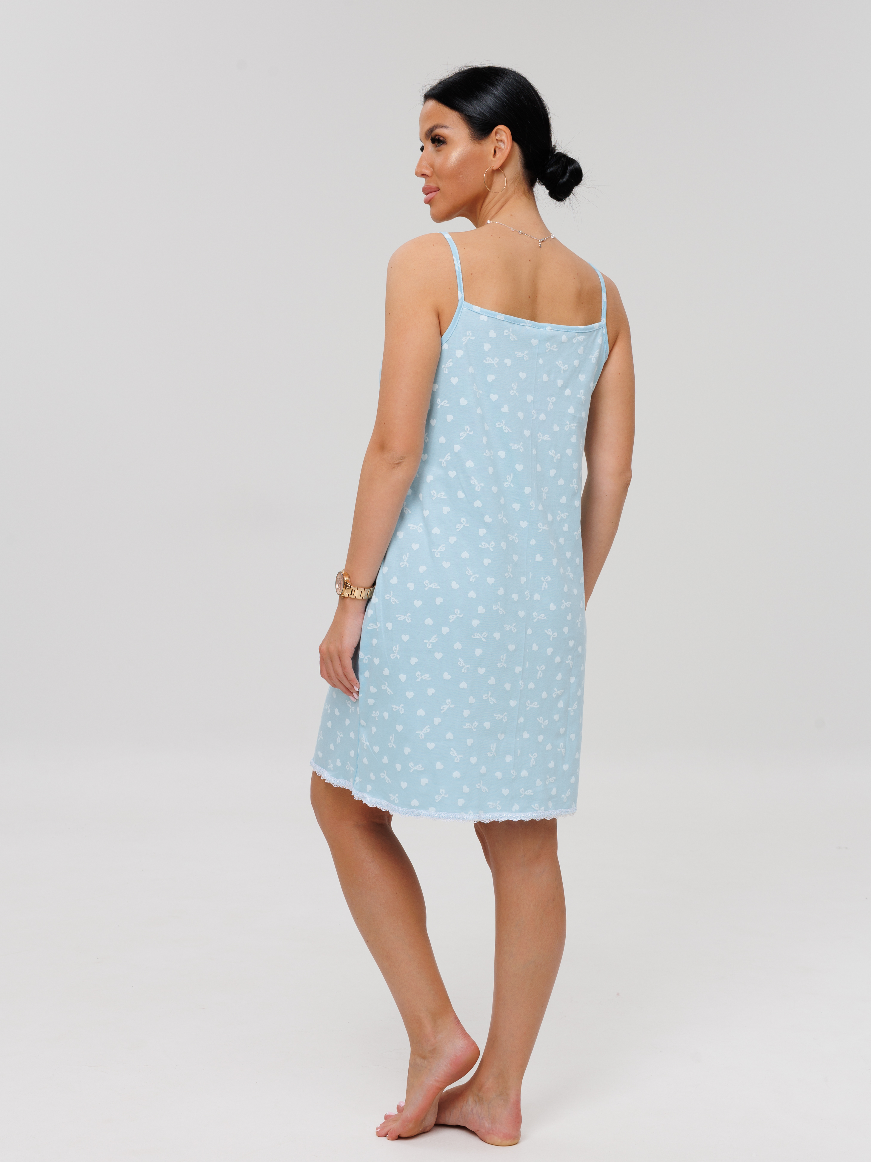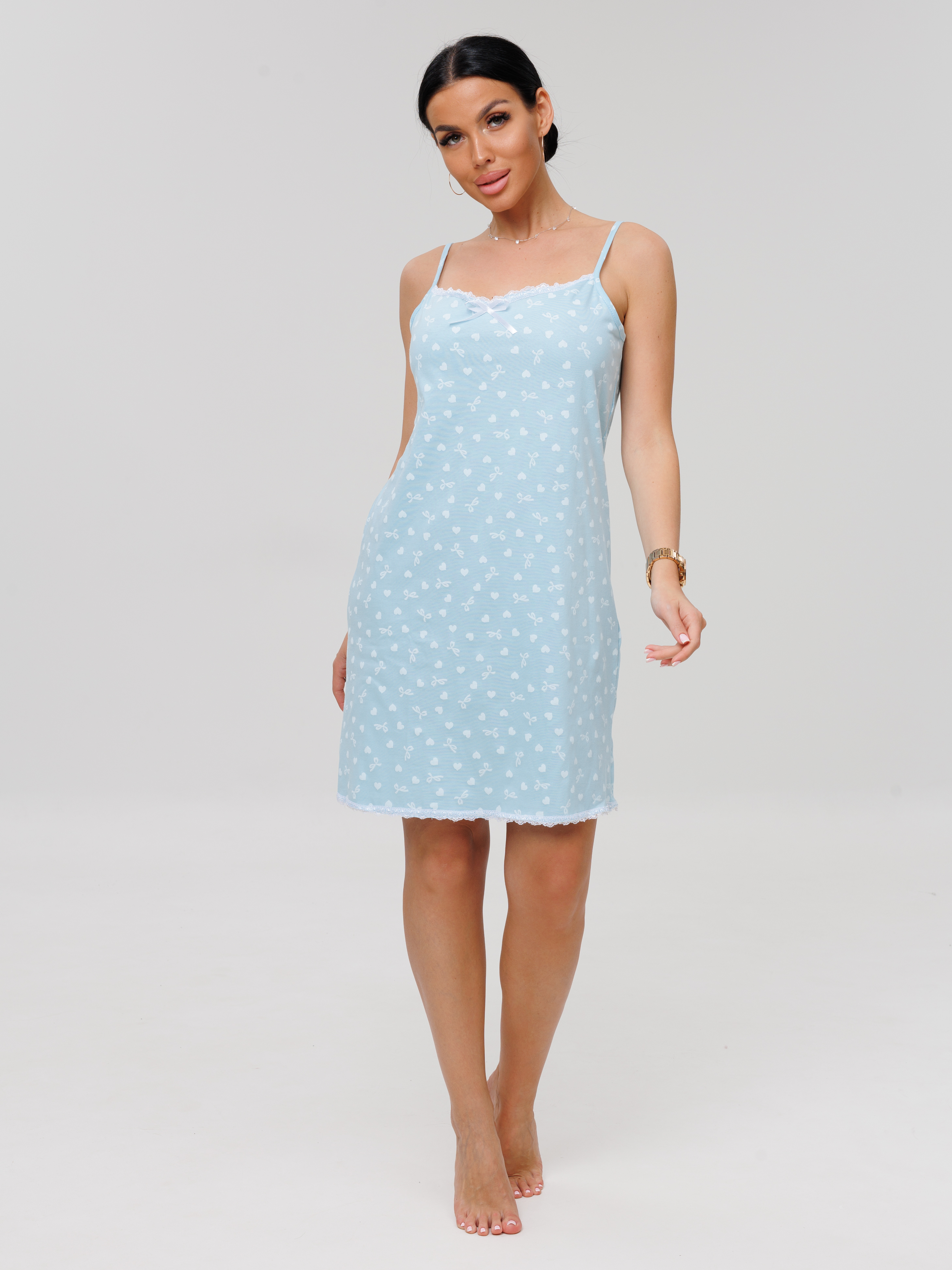 Женская сорочка Сор-96(К) / Нежно-голубой (сердечки) на тонких бретелях, длиной до колена. Женская ночная сорочка отшивается из хлопкового трикотажного полотна, имеет широкий размерный ряд и яркие расцветки.