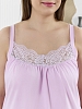 Сорочка женская из гладкокрашеного трикотажного полотна «кулирка», свободного кроя, на бретелях, выполненных из широкой окантовки из основного материала. Нижняя основная деталь полочки присборена по шву стачивания с кружевной кокеткой.