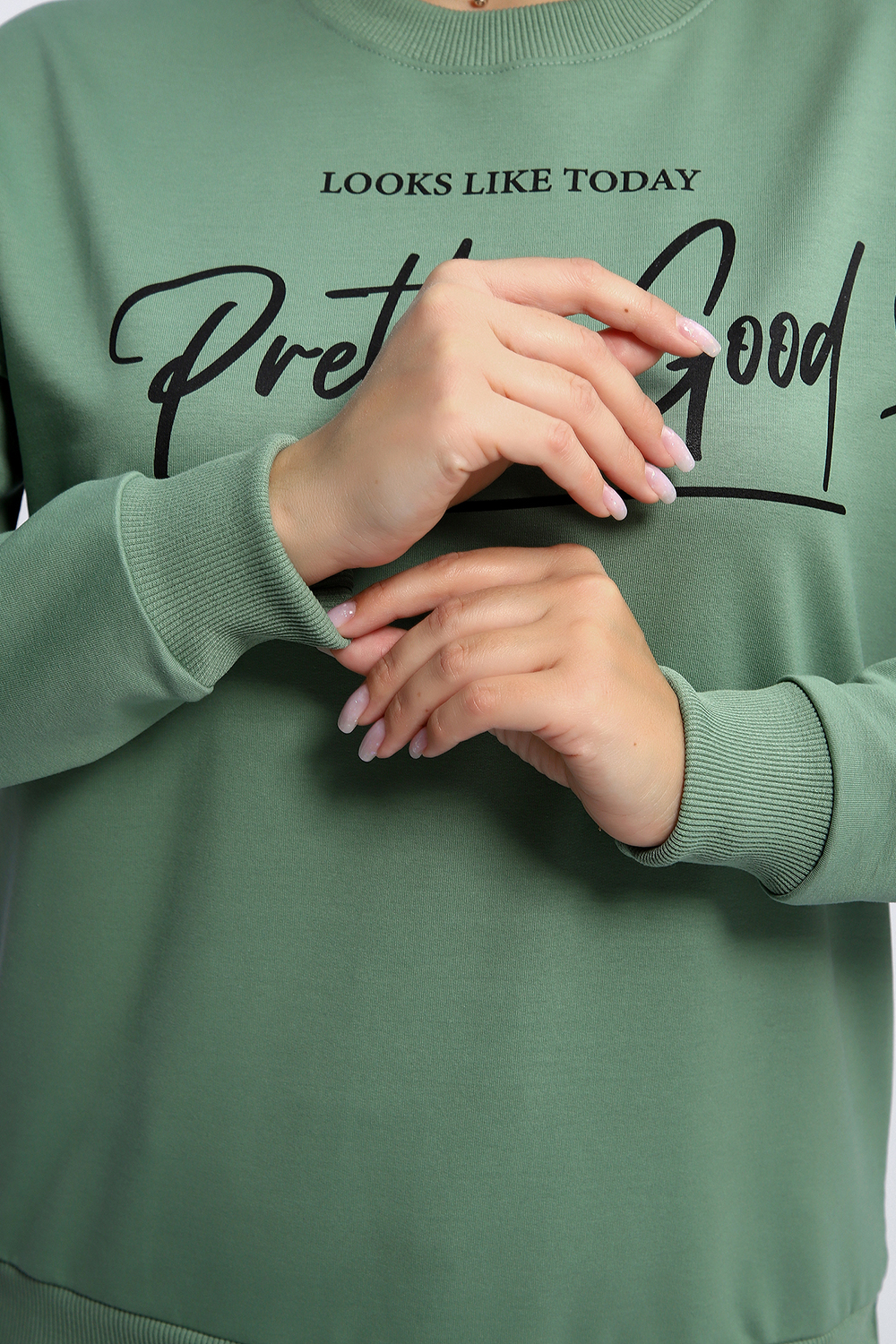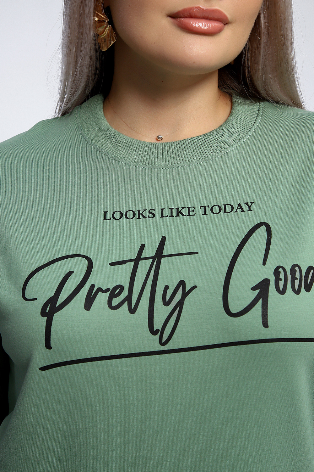 Толстовка свободного кроя оверсайз со спущенной линией плеча прекрасный вариант для прохладной погоды! Мягкое, эластичное кашкорсе в тон ткани использовано для отделки горловины, манжет и пояса. На полочке декоративный принт.
