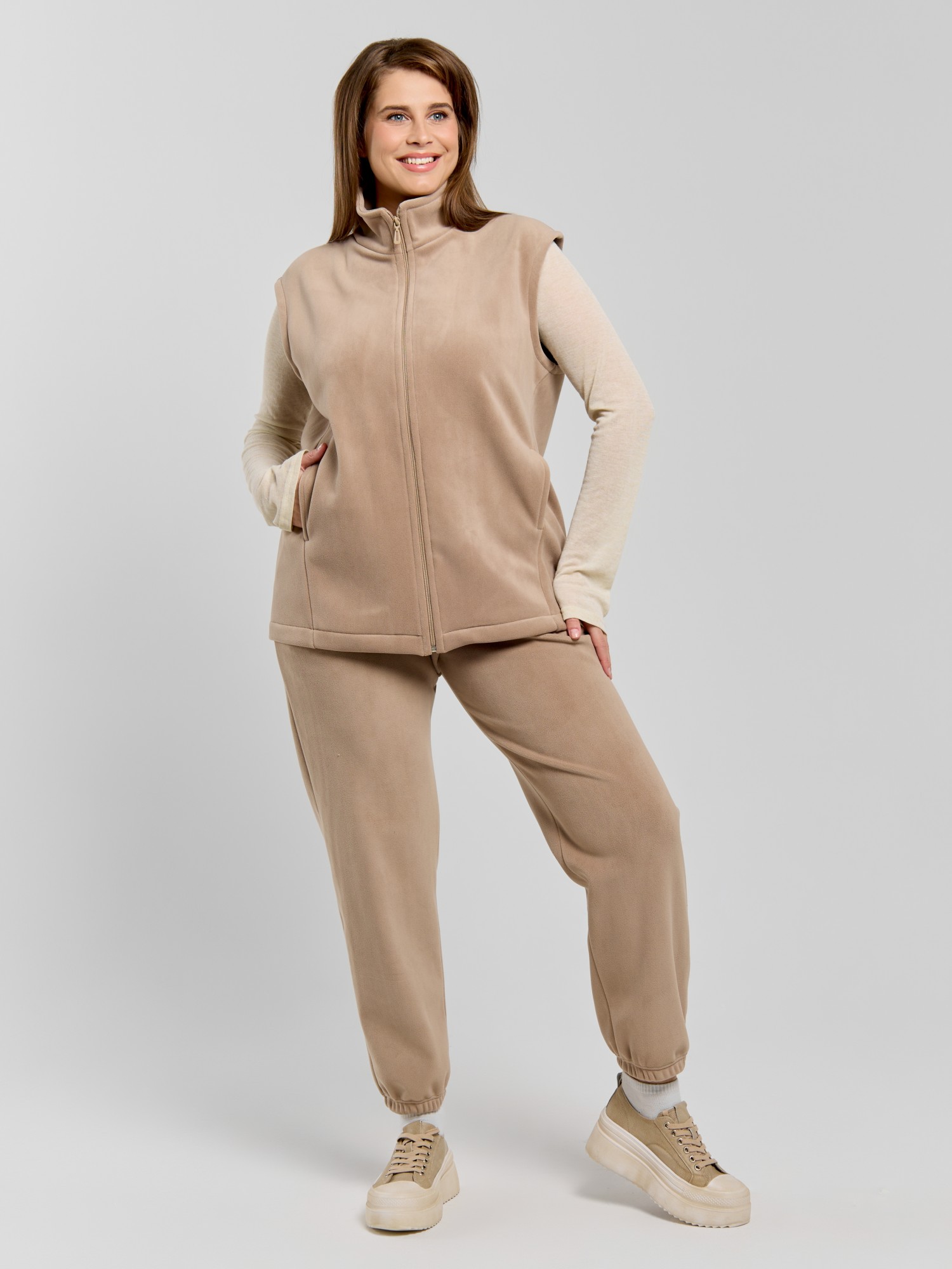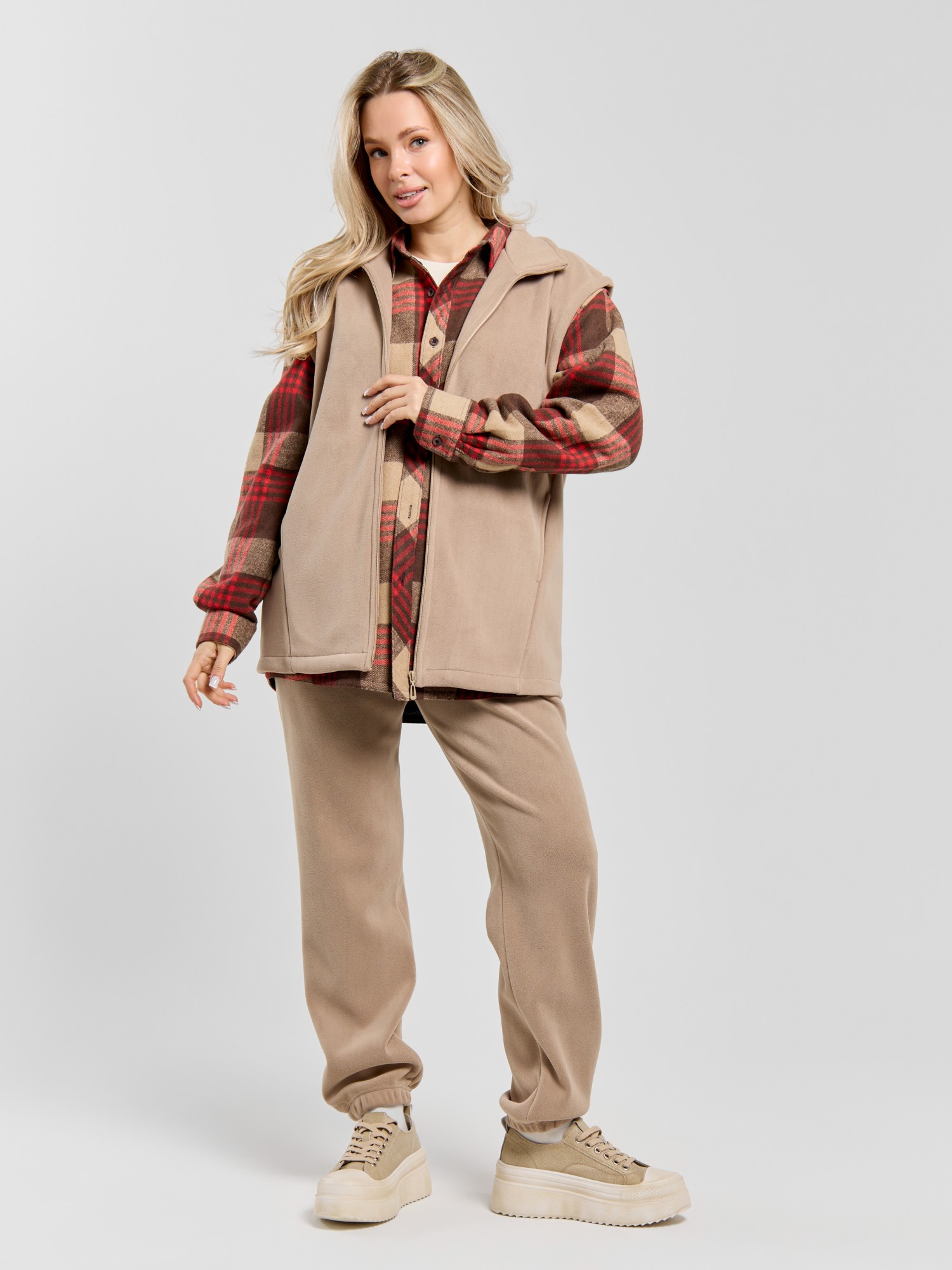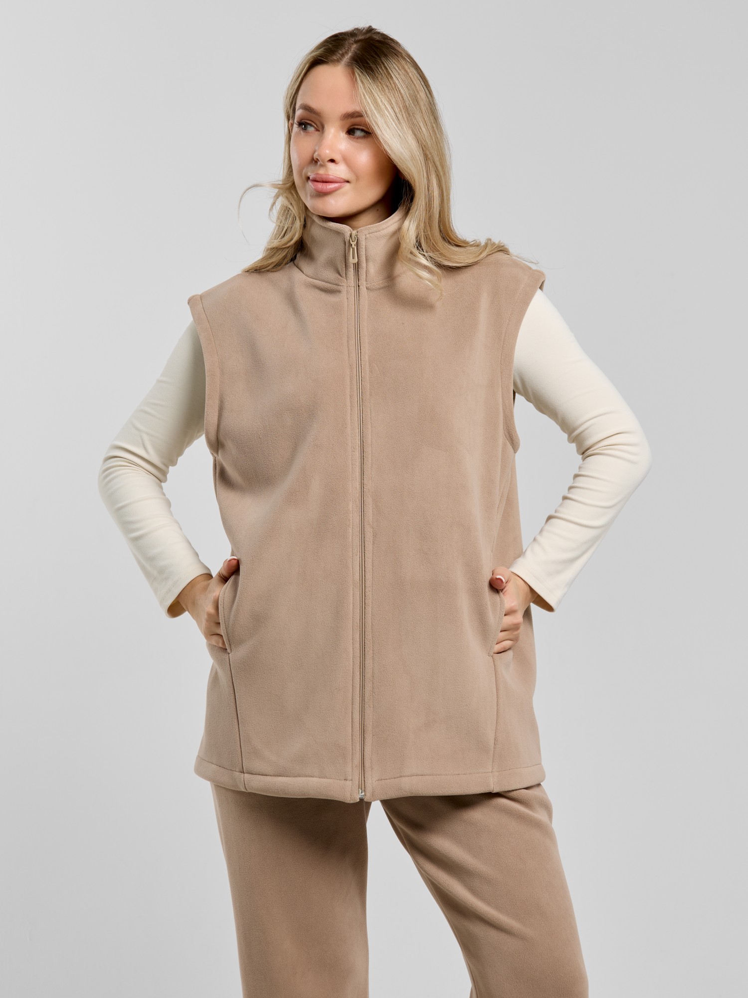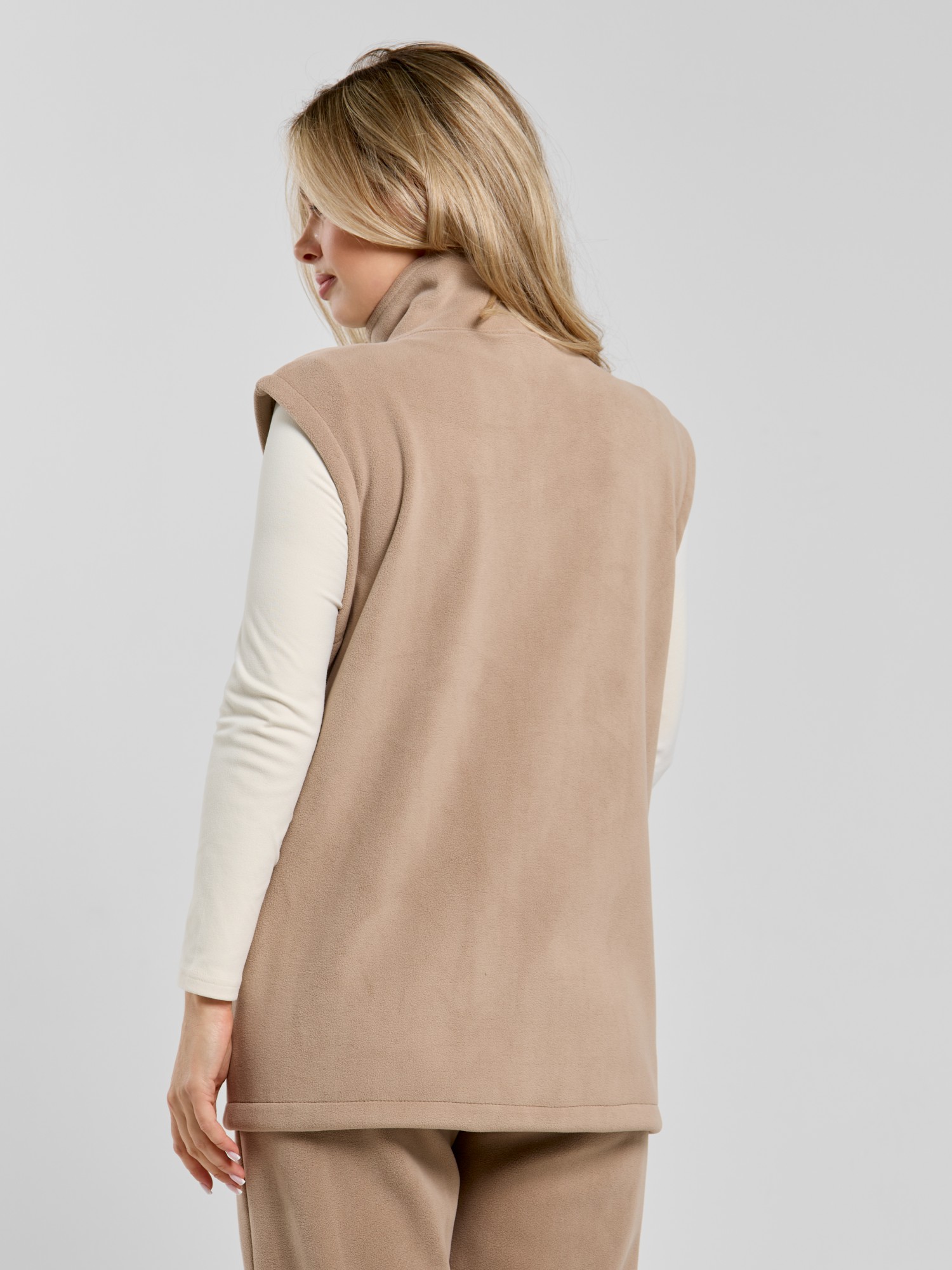 Жилет молодежный из трикотажного полотна «дабл-флис» (двухсторонний флис), прямого силуэта, с воротником «стойка», центральной бортовой застежкой на тесьму «молния». Для создания диагональных линий боковые швы переведены на полочку и оформлены в рельефные швы, в которых обработаны карманы.