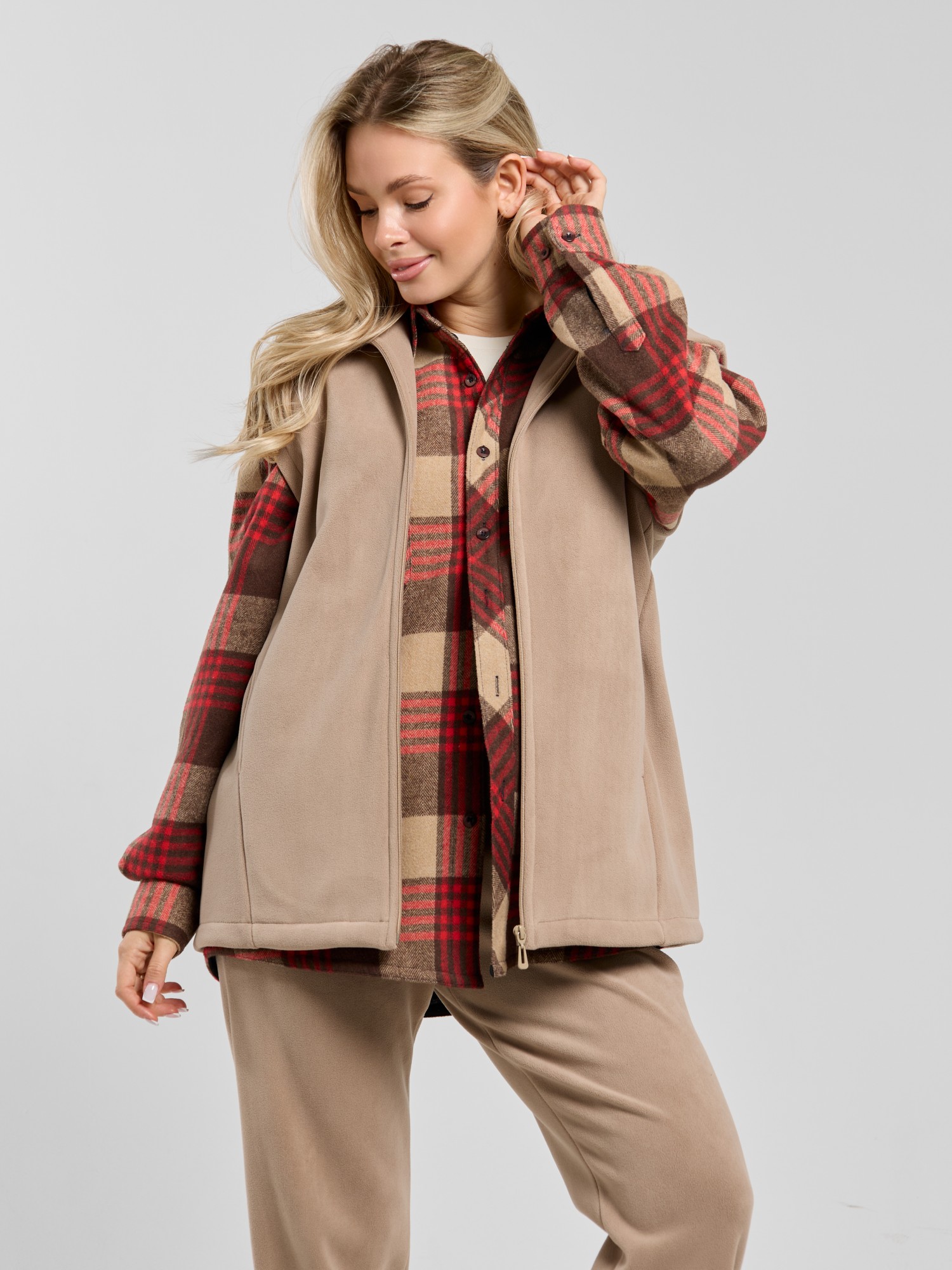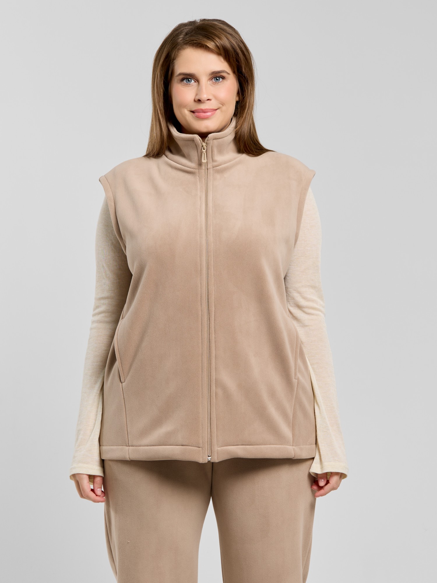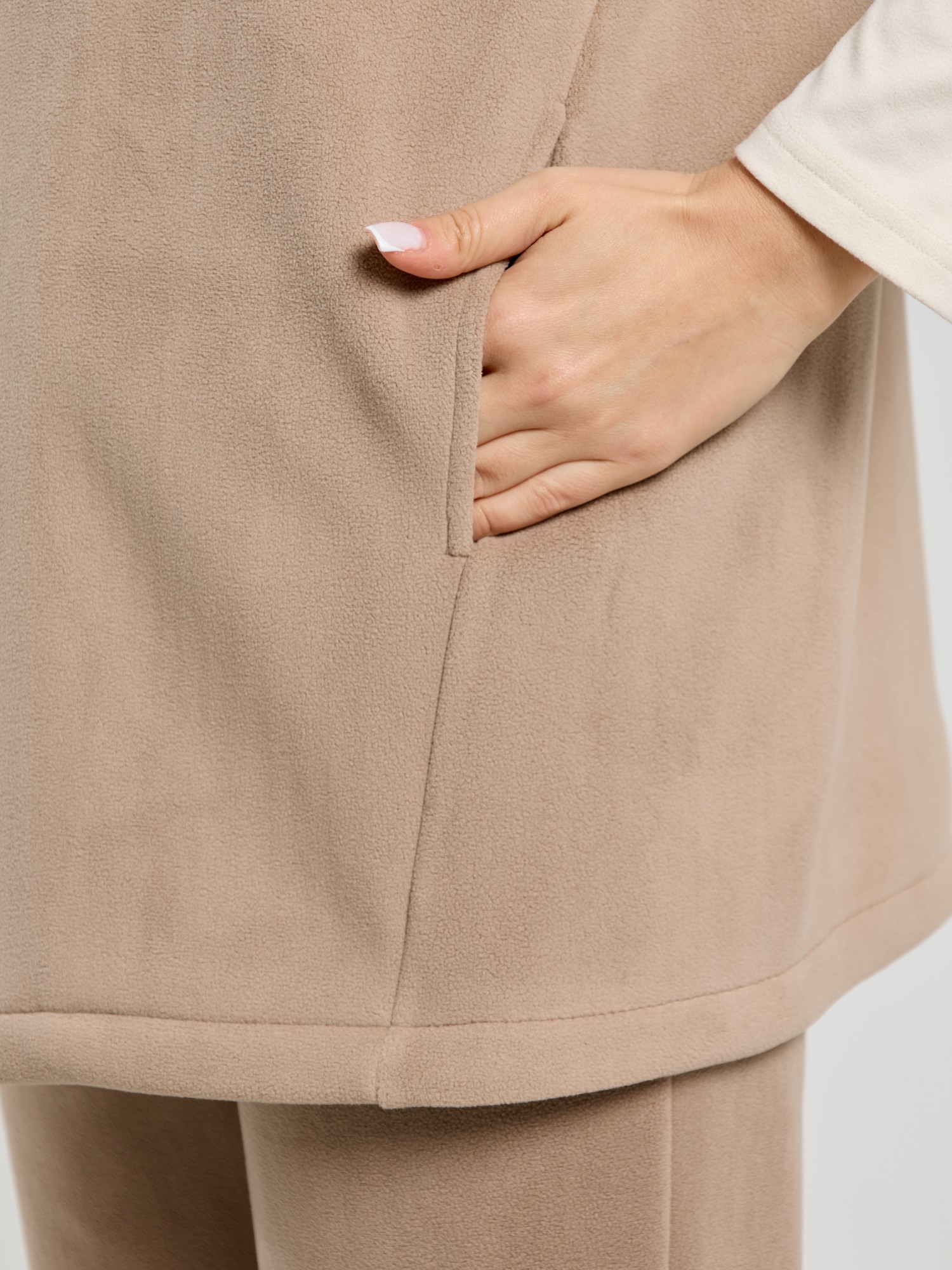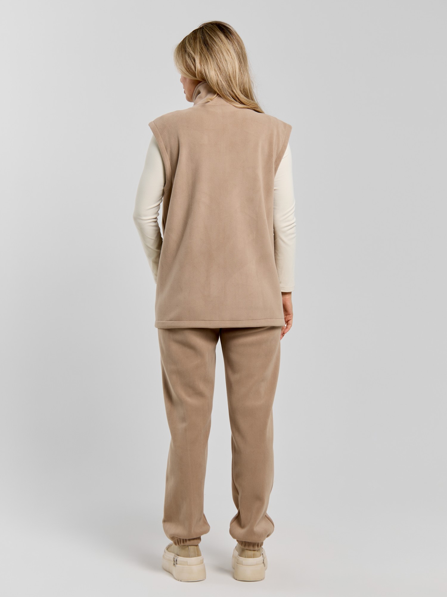 Жилет молодежный из трикотажного полотна «дабл-флис» (двухсторонний флис), прямого силуэта, с воротником «стойка», центральной бортовой застежкой на тесьму «молния». Для создания диагональных линий боковые швы переведены на полочку и оформлены в рельефные швы, в которых обработаны карманы.