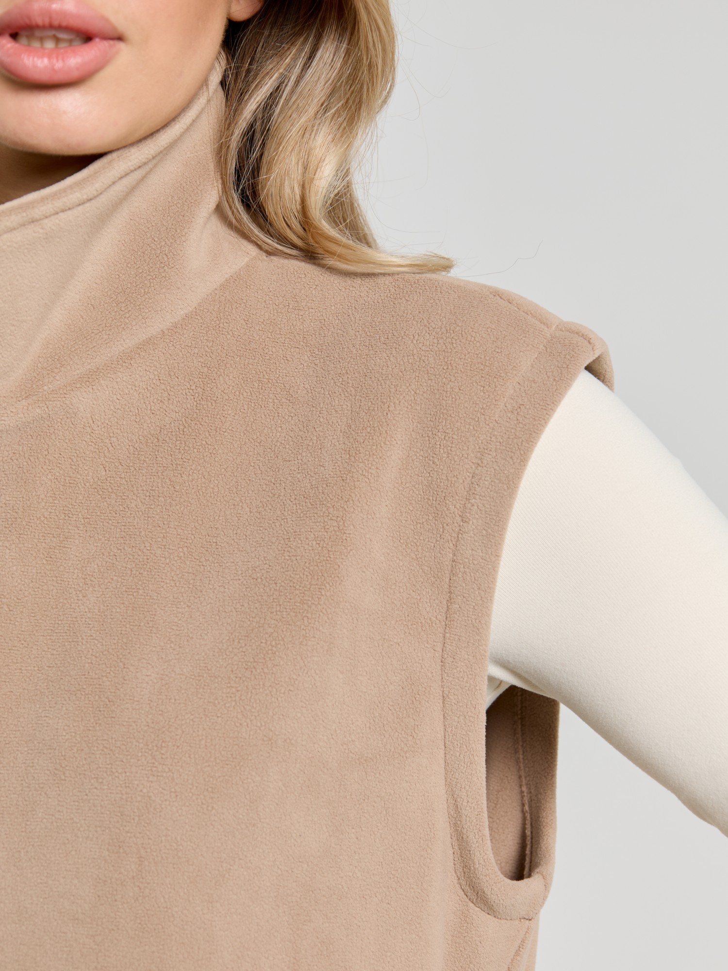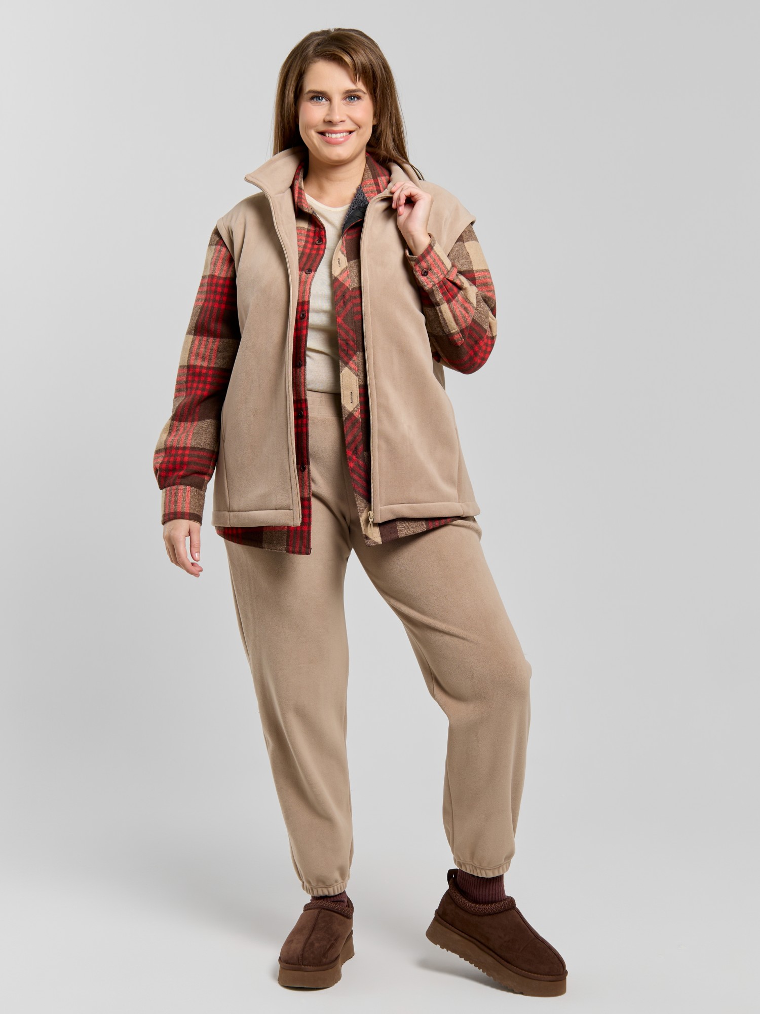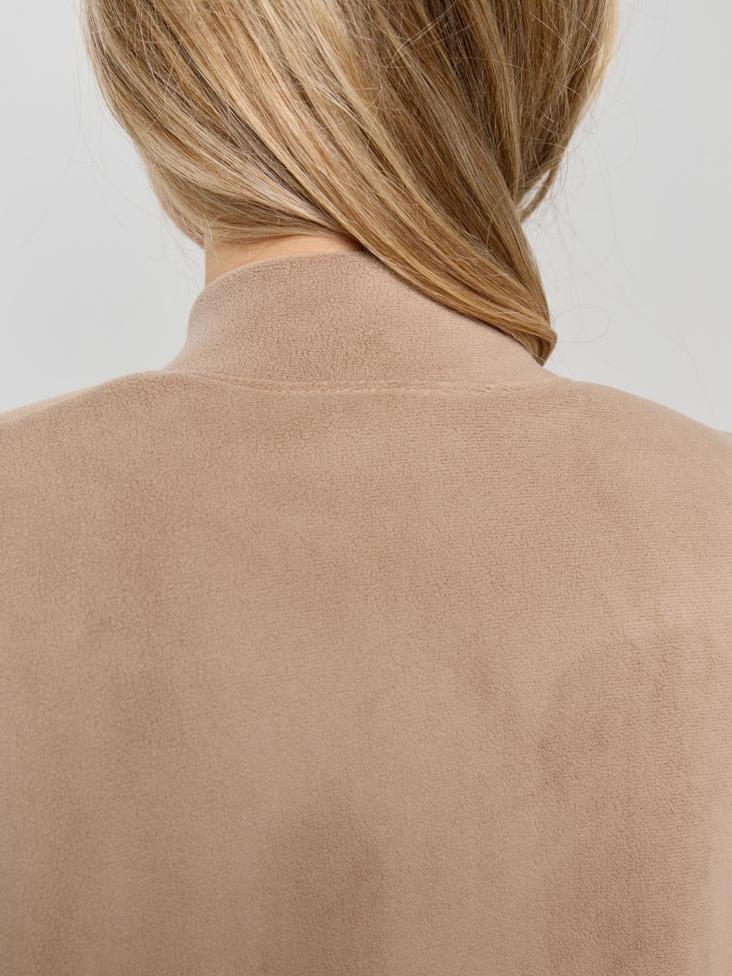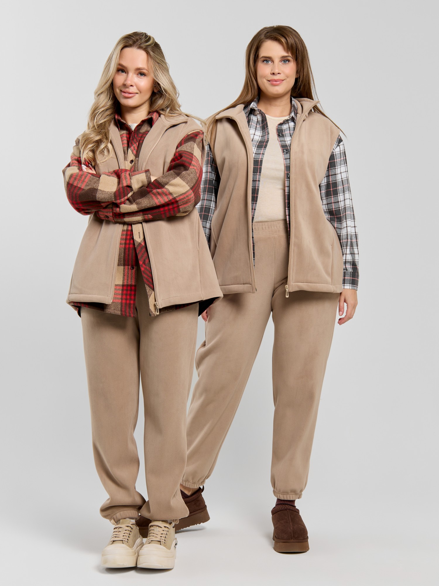 Жилет молодежный из трикотажного полотна «дабл-флис» (двухсторонний флис), прямого силуэта, с воротником «стойка», центральной бортовой застежкой на тесьму «молния». Для создания диагональных линий боковые швы переведены на полочку и оформлены в рельефные швы, в которых обработаны карманы.
