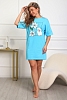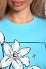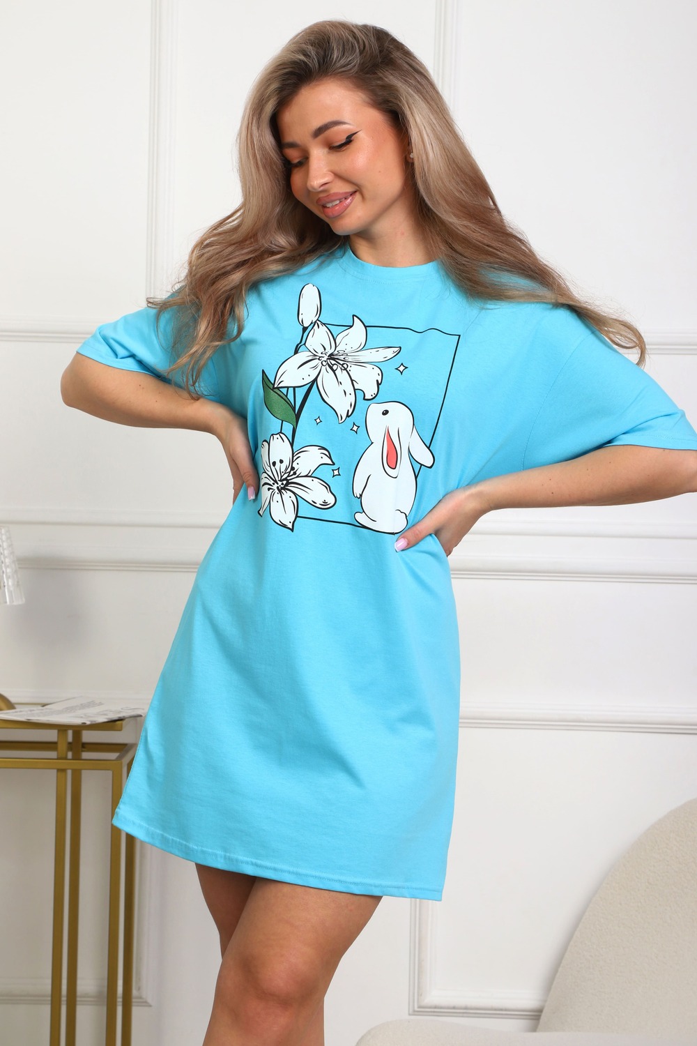 Туника женская прямого силуэта. Низ изделия прямой. Длина выше колена, плечо спущенное, рукав короткий. Горловина круглой формы, обработана планкой с отделочной строчкой по шву притачивания. Принт (шелкография) располагается по центру переда.