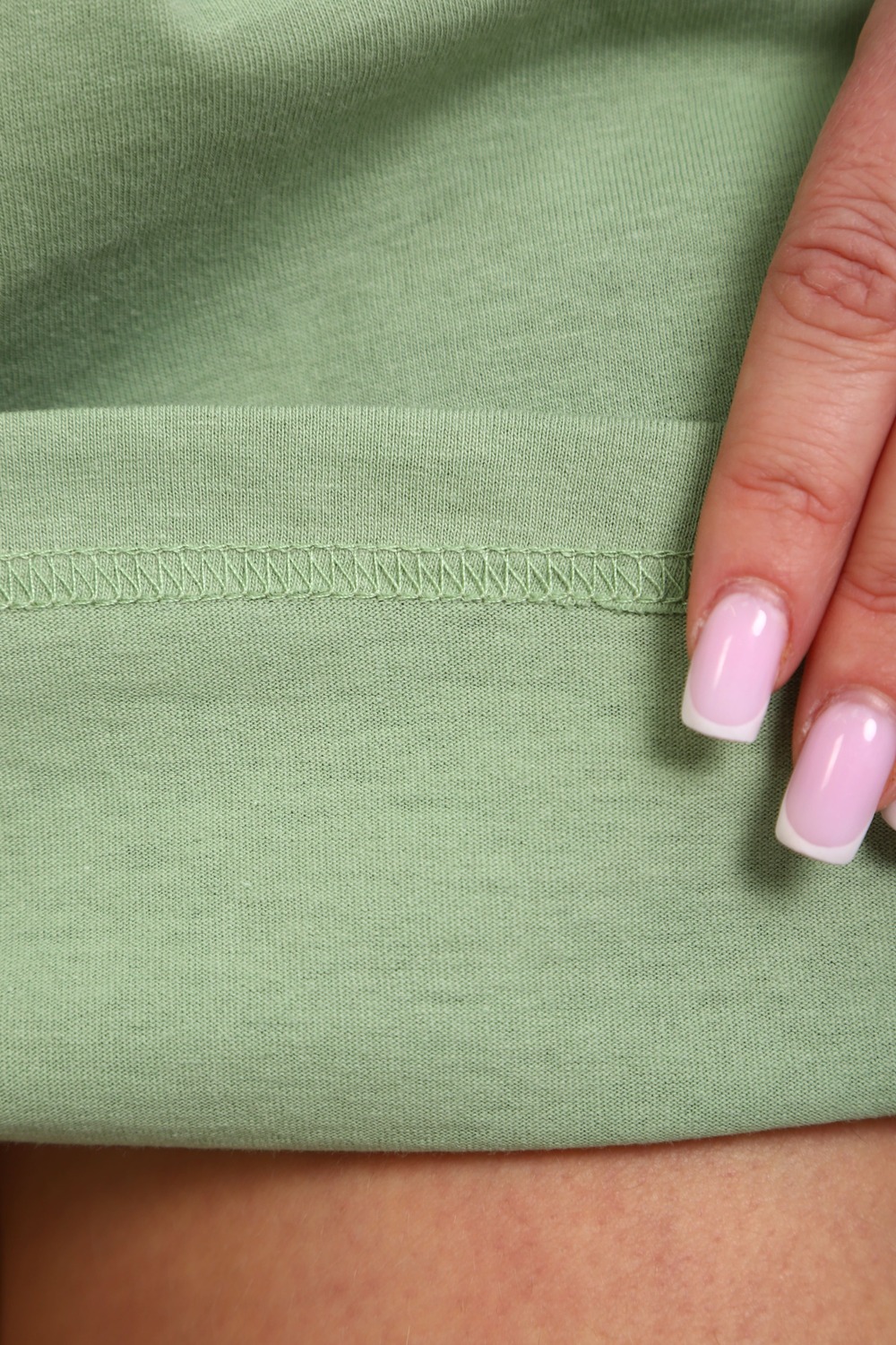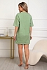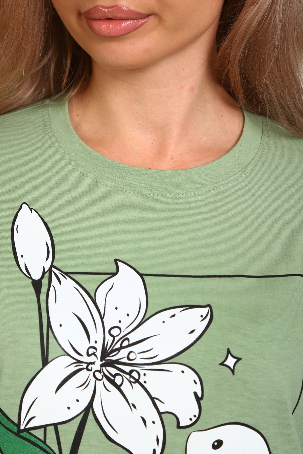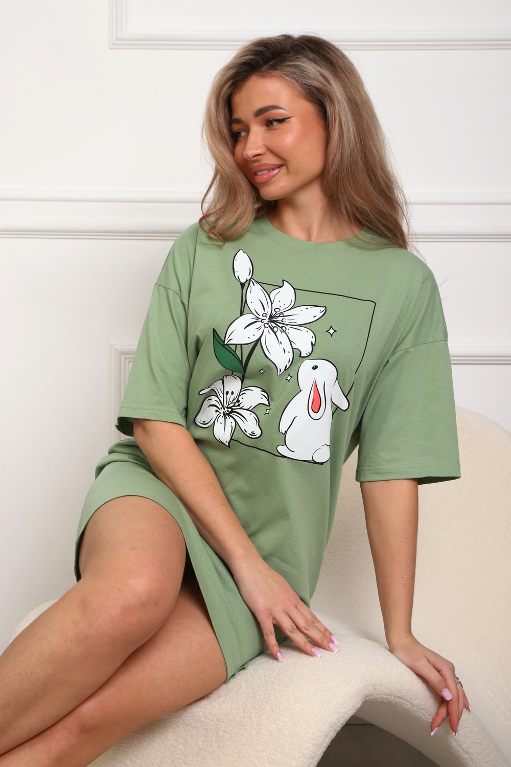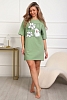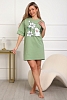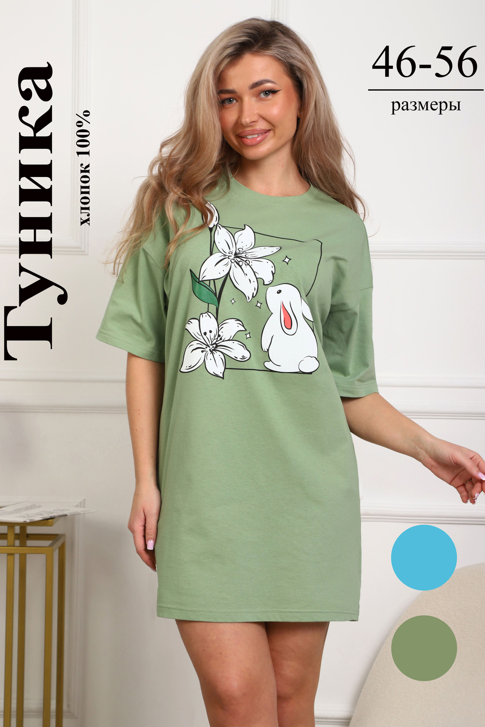 Туника женская прямого силуэта. Низ изделия прямой. Длина выше колена, плечо спущенное, рукав короткий. Горловина круглой формы, обработана планкой с отделочной строчкой по шву притачивания. Принт (шелкография) располагается по центру переда.